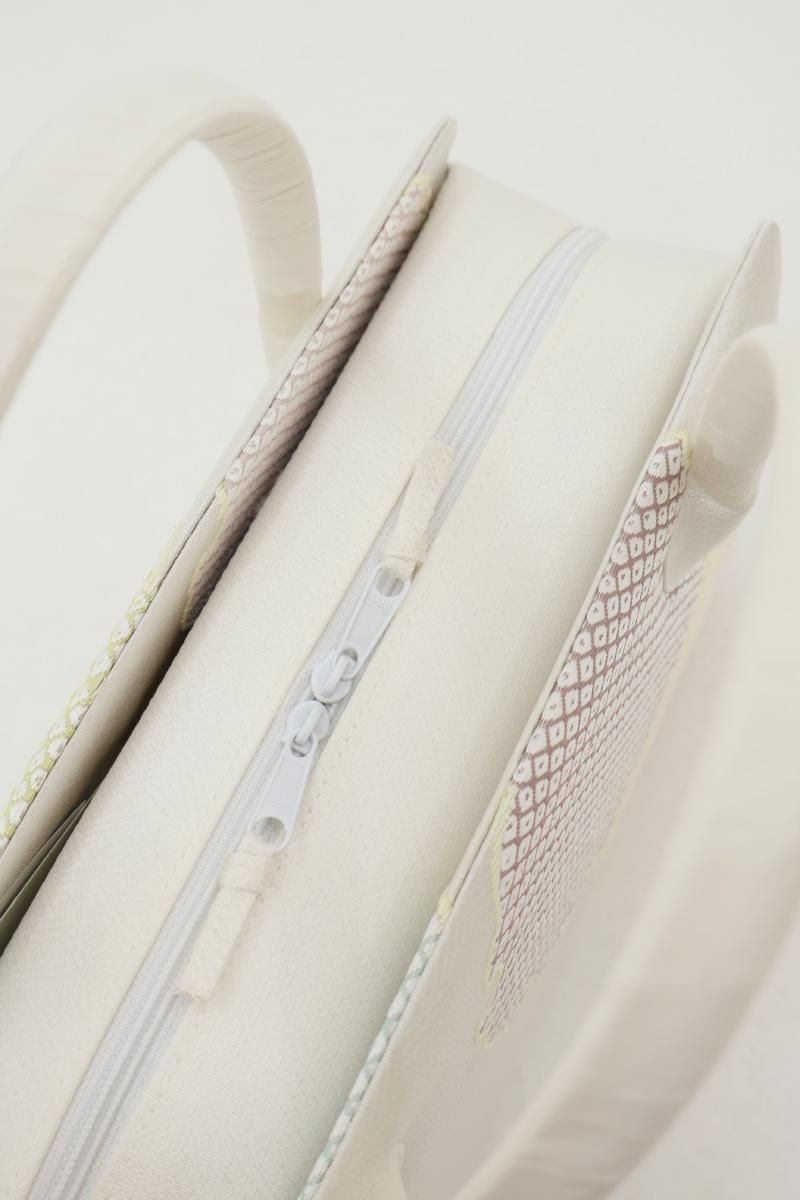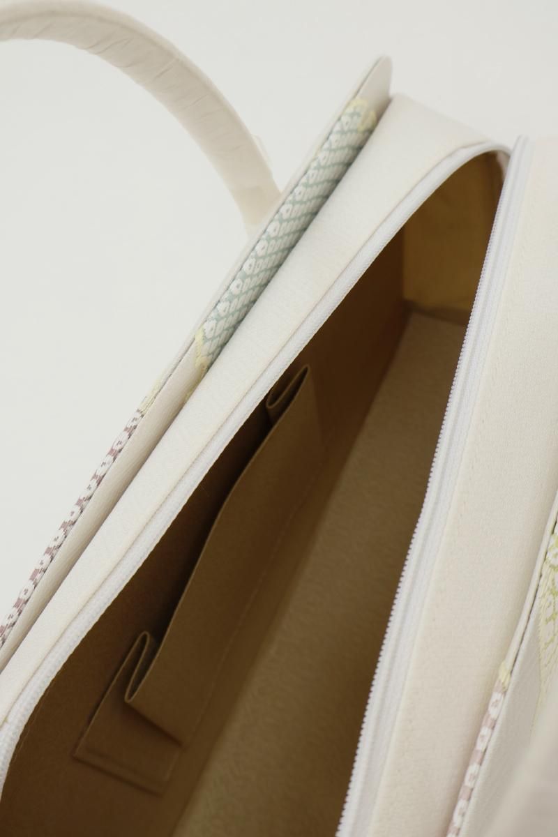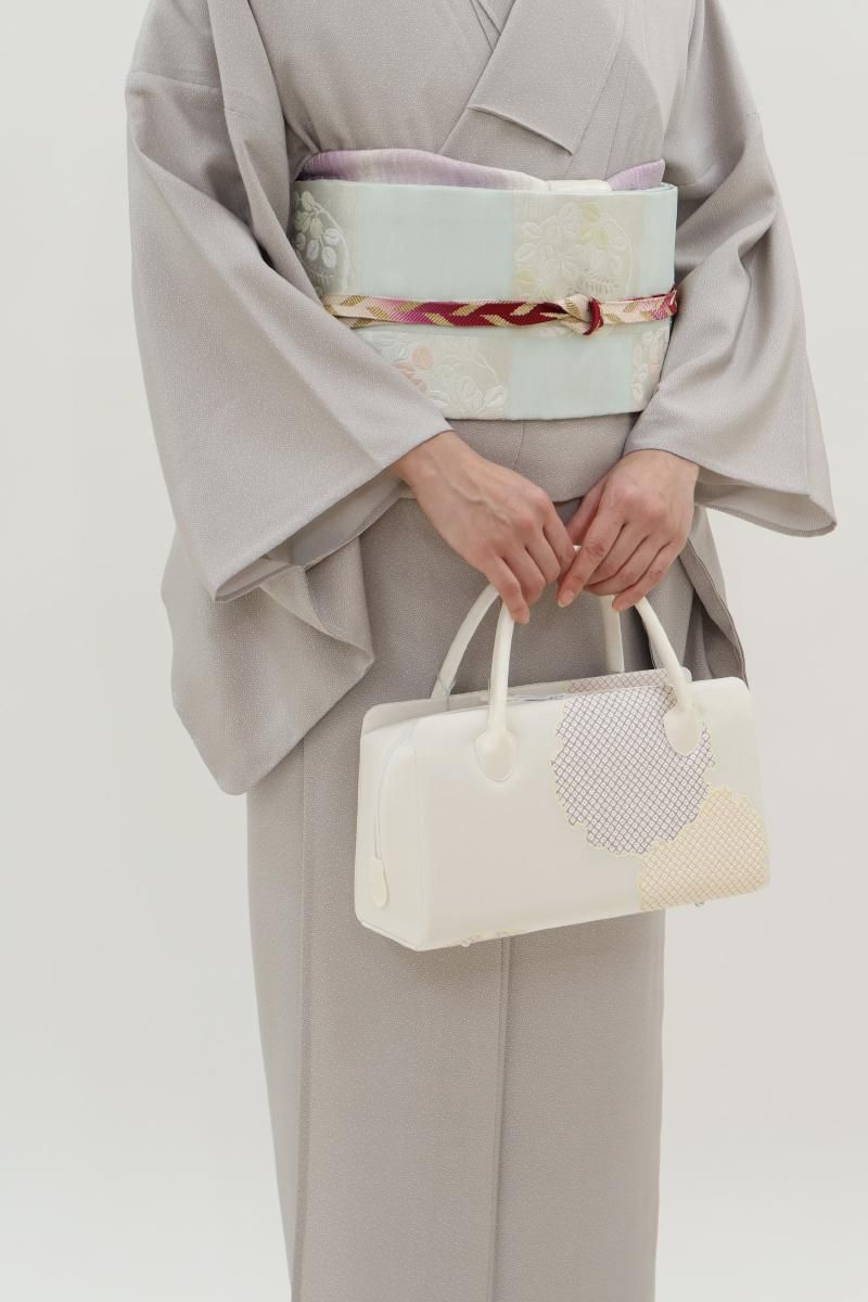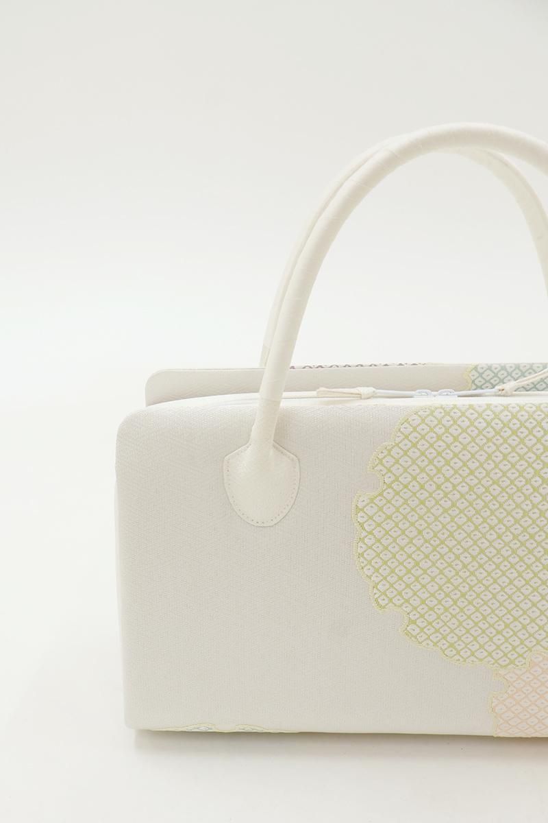 こちらはすっきりとした白色の地に、おおらかな雪輪文を配した織地を用いたお品。柄には金銀糸を用いていませんので、ちょっとしたお出かけから改まったお席まで様々な場面の装いに合わせてお使い頂けそうです。外側に大きなポケットが2つと内側に小さなポケットが1つ付いていますので収納力もばっちり、あらかじめ生地に施されたガード加工や底鋲など細かな点に光る気配りも嬉しいですね。お出かけのお供として重宝いただけることと思います。この機会にいかがでしょうか。