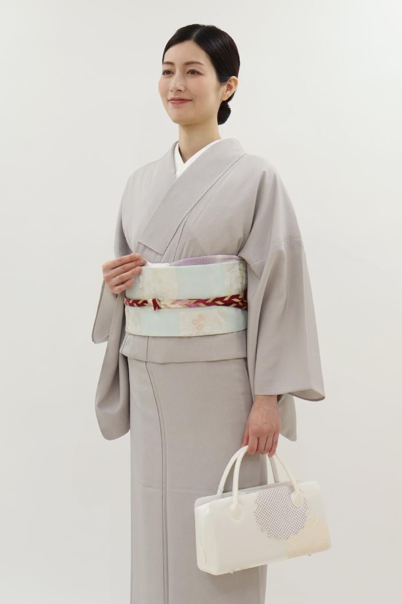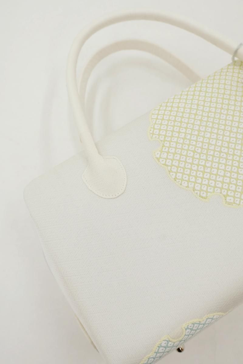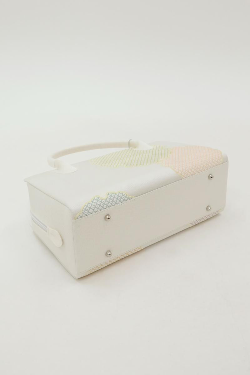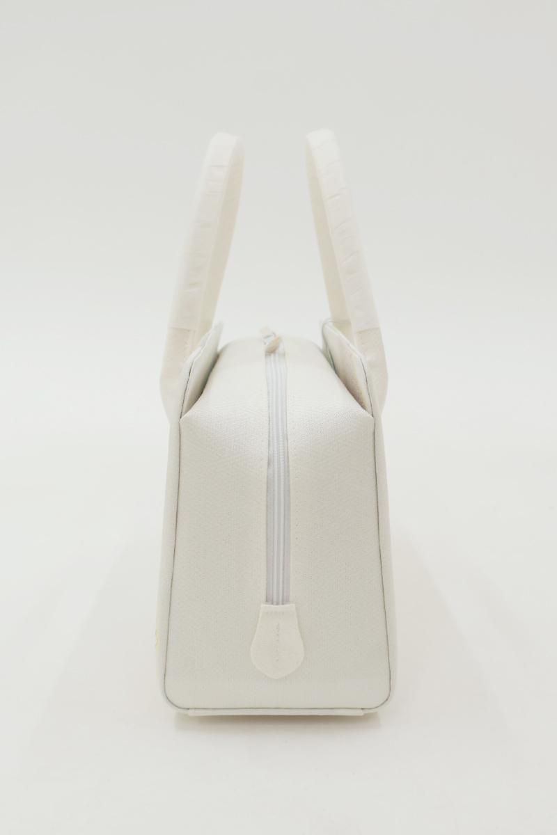 こちらはすっきりとした白色の地に、おおらかな雪輪文を配した織地を用いたお品。柄には金銀糸を用いていませんので、ちょっとしたお出かけから改まったお席まで様々な場面の装いに合わせてお使い頂けそうです。外側に大きなポケットが2つと内側に小さなポケットが1つ付いていますので収納力もばっちり、あらかじめ生地に施されたガード加工や底鋲など細かな点に光る気配りも嬉しいですね。お出かけのお供として重宝いただけることと思います。この機会にいかがでしょうか。