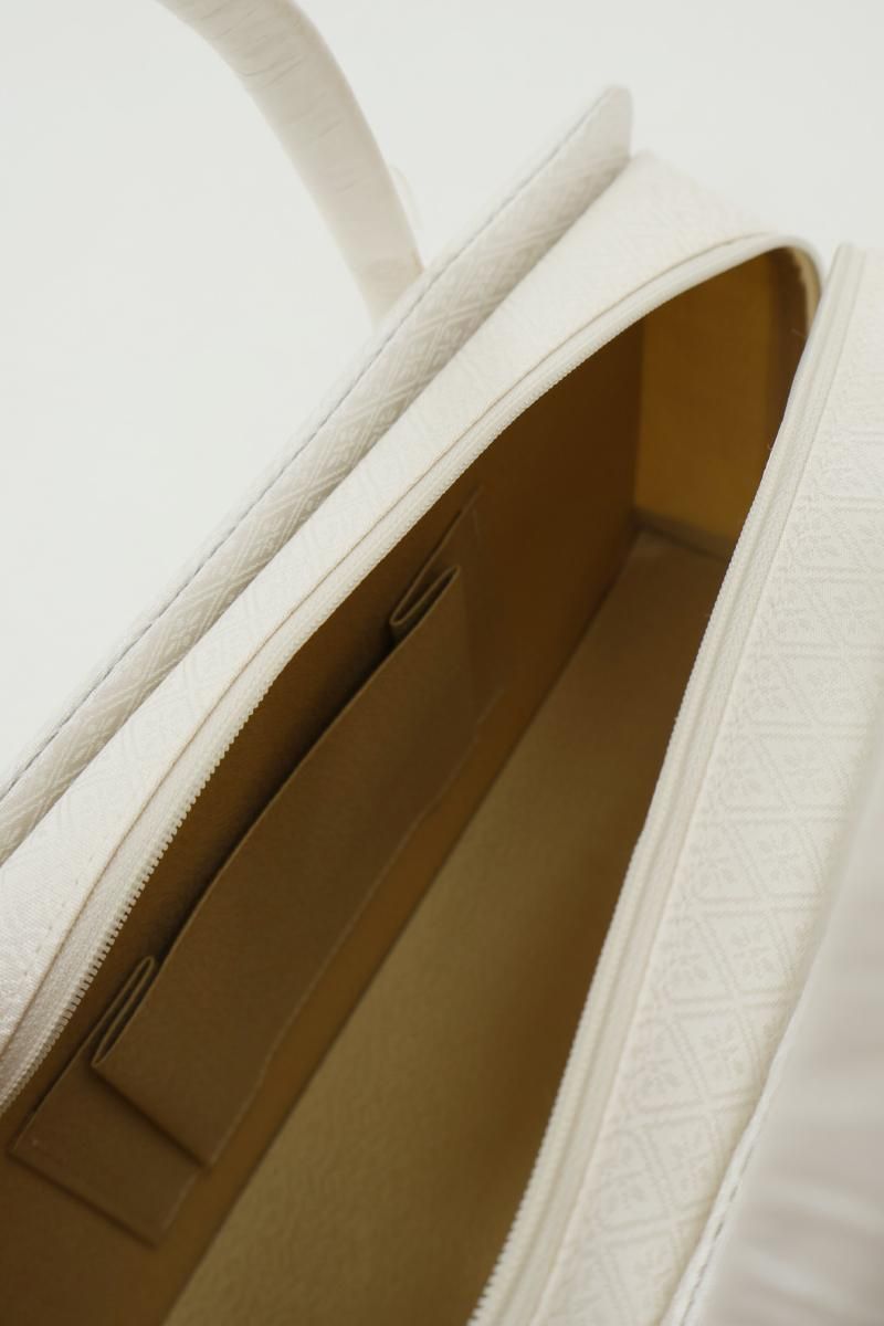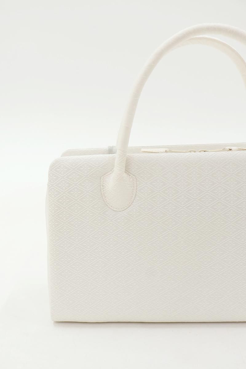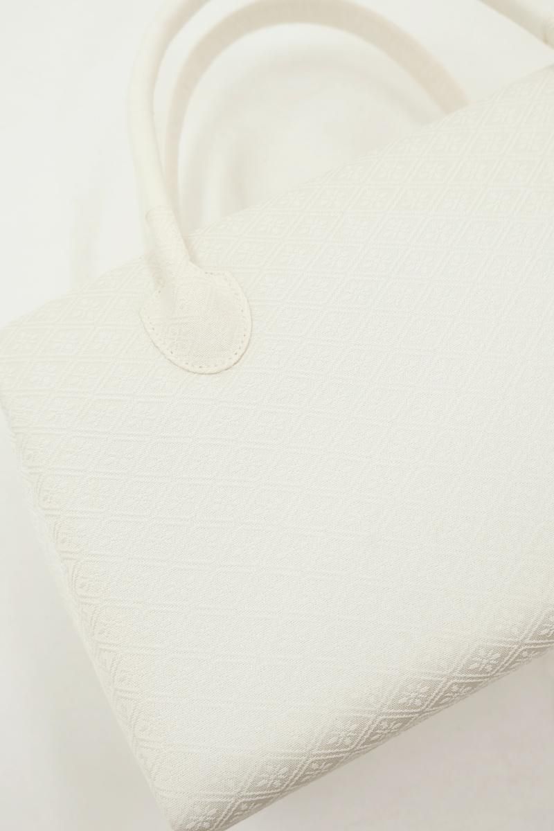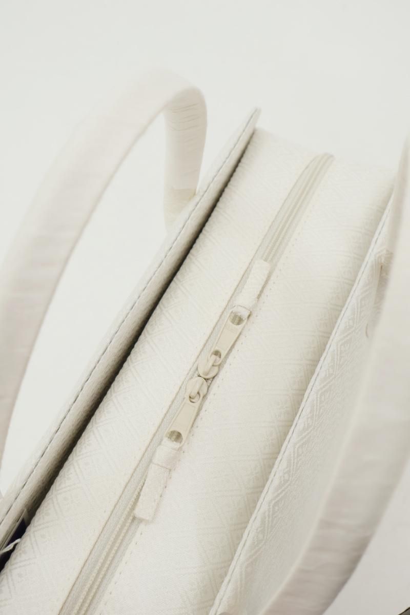 こちらはすっきりとした白色の地に、花菱の地紋を配した織地を用いたお品。柄には金銀糸を用いていませんので、ちょっとしたお出かけから改まったお席まで様々な場面の装いに合わせてお使い頂けそうです。外側に大きなポケットが2つと内側に小さなポケットが1つ付いていますので収納力もばっちり、あらかじめ生地に施されたガード加工や底鋲など細かな点に光る気配りも嬉しいですね。お出かけのお供として重宝いただけることと思います。この機会にいかがでしょうか。