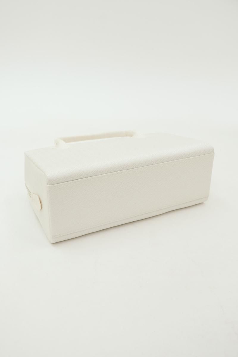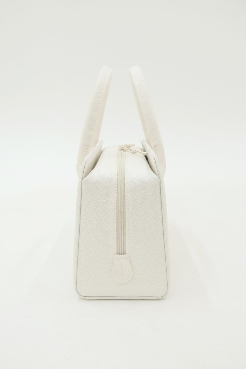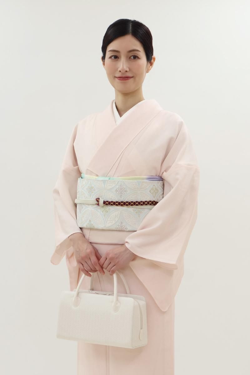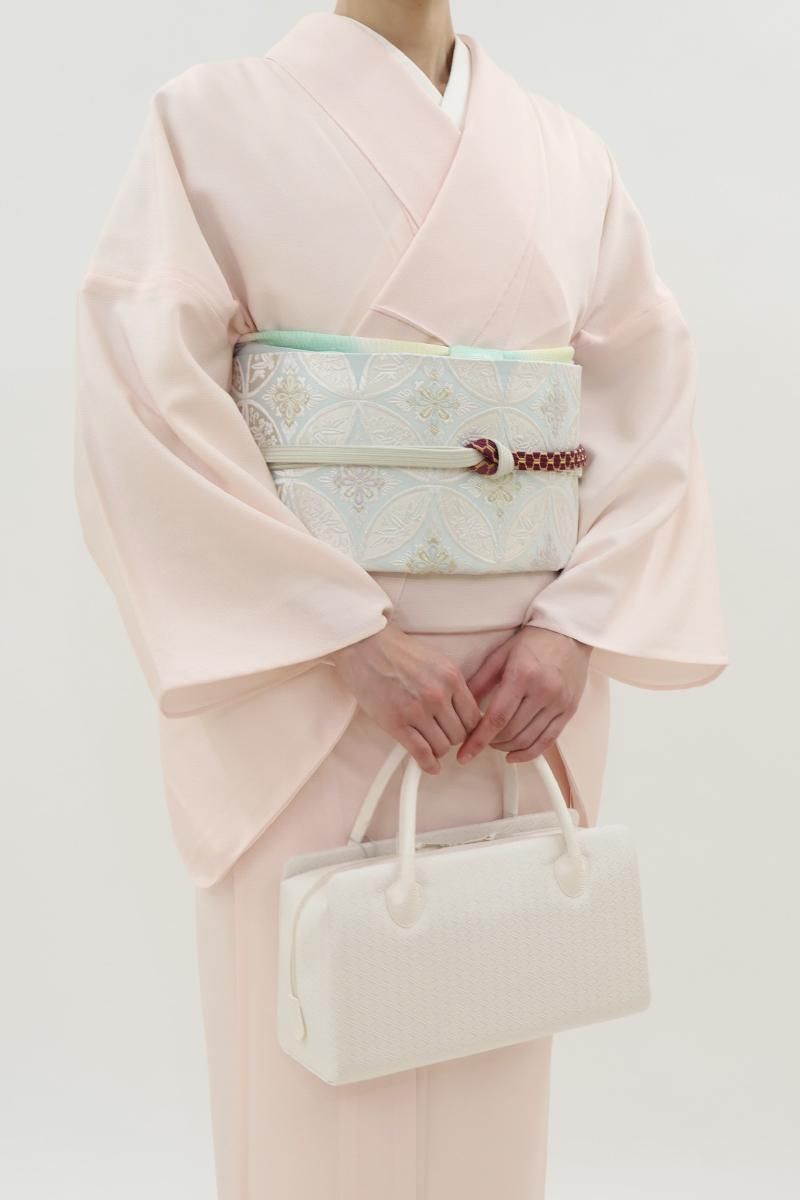 こちらはすっきりとした白色の地に、花菱の地紋を配した織地を用いたお品。柄には金銀糸を用いていませんので、ちょっとしたお出かけから改まったお席まで様々な場面の装いに合わせてお使い頂けそうです。外側に大きなポケットが2つと内側に小さなポケットが1つ付いていますので収納力もばっちり、あらかじめ生地に施されたガード加工や底鋲など細かな点に光る気配りも嬉しいですね。お出かけのお供として重宝いただけることと思います。この機会にいかがでしょうか。