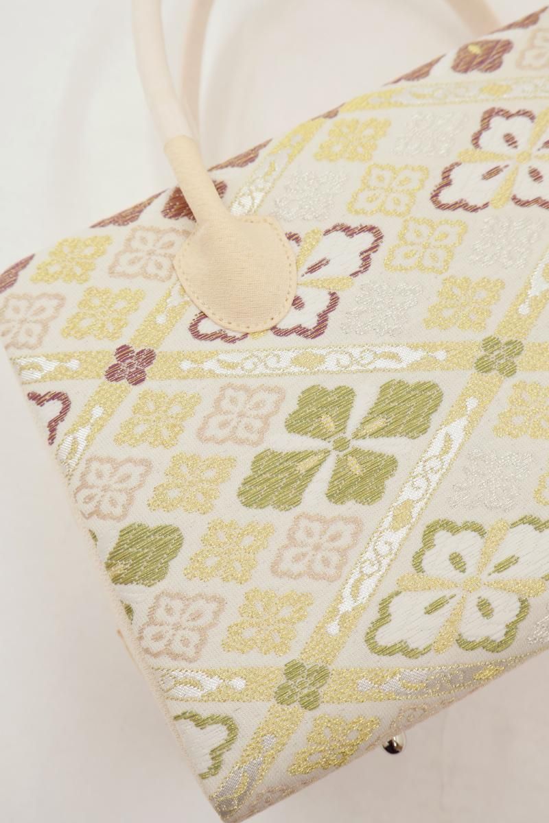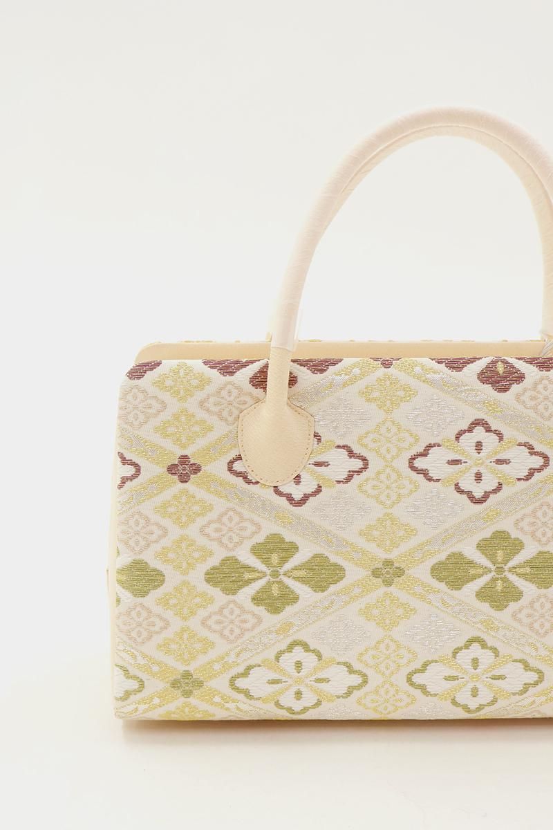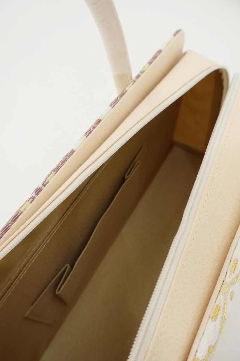 こちらは淡いベージュ地に、優美な色彩で花菱文を配した織地を用いたお品。愛らしい雰囲気の色柄ゆきに絹糸の光沢が美しく映え、エレガントな表情を引き立てています。金銀糸の煌めきを添えた晴れやかな雰囲気の古典意匠は重厚なお着物にも負けないしっかりとした格調を備えていますね。外側に大きなポケットが2つと内側に小さなポケットが1つ付いていますので収納力もばっちり、あらかじめ生地に施されたガード加工や底鋲など細かな点に光る気配りも嬉しいですね。フォーマルシーンに安心してお使い頂ける一点は、華やかなパーティや式典などの改まった場面に重宝頂けることと思います。この機会にいかがでしょうか。
