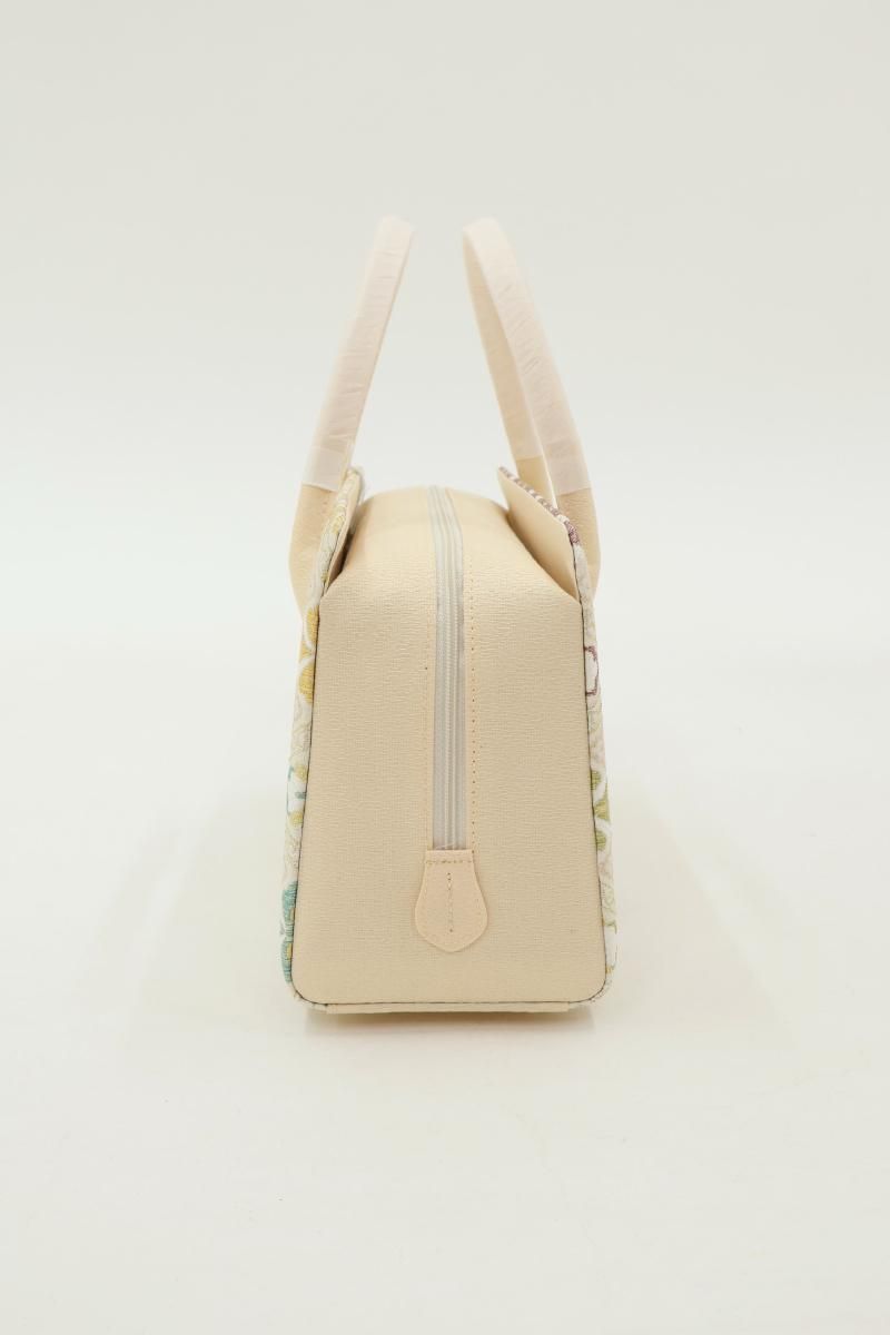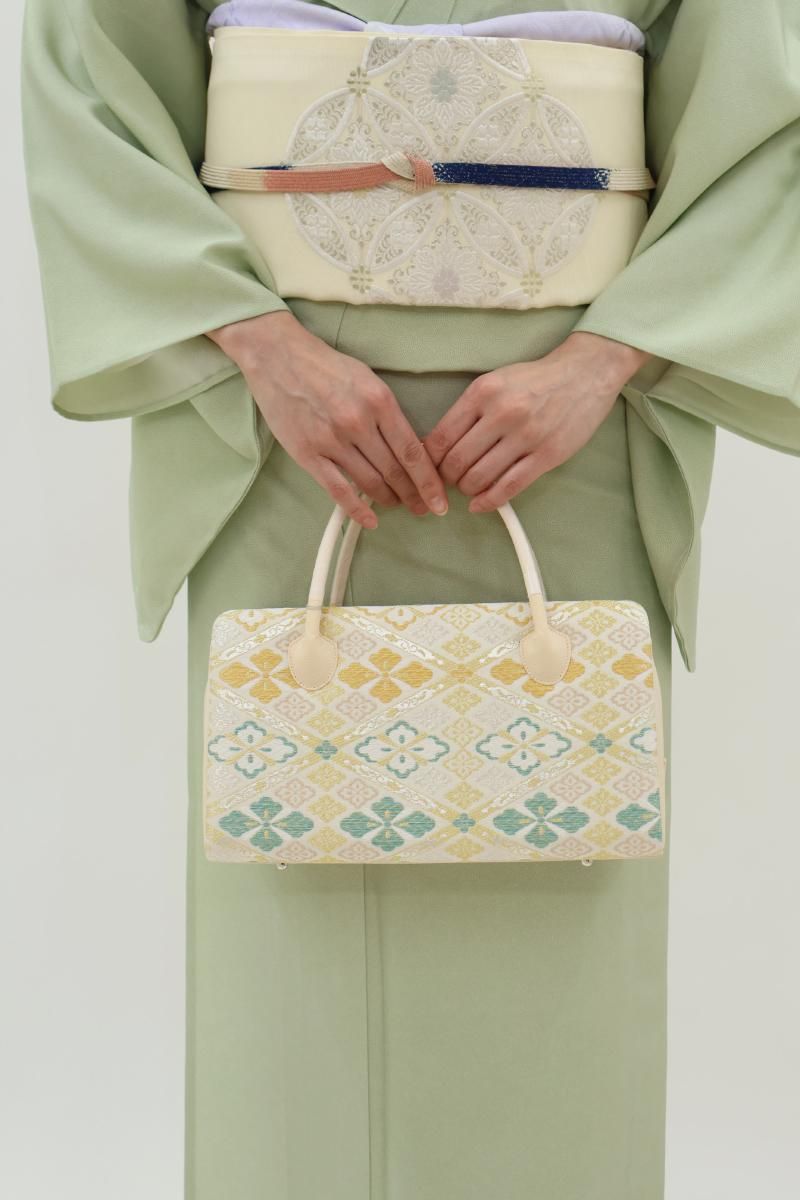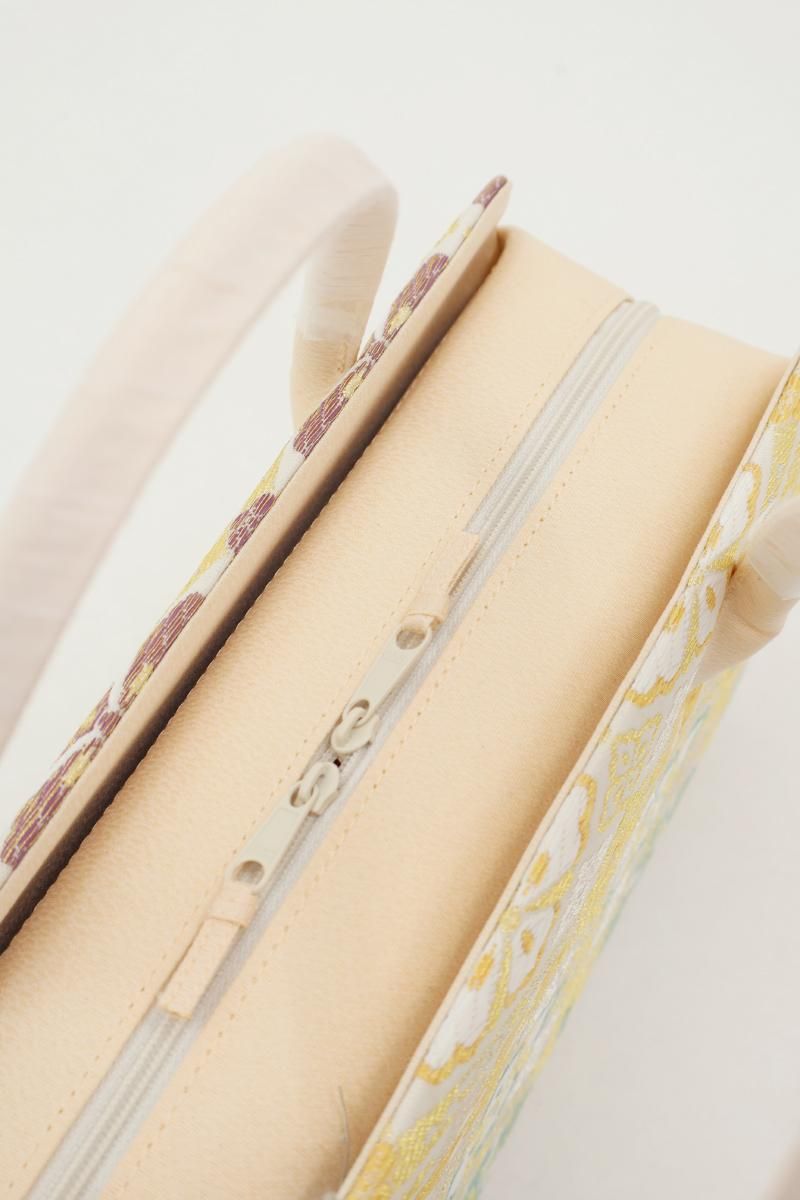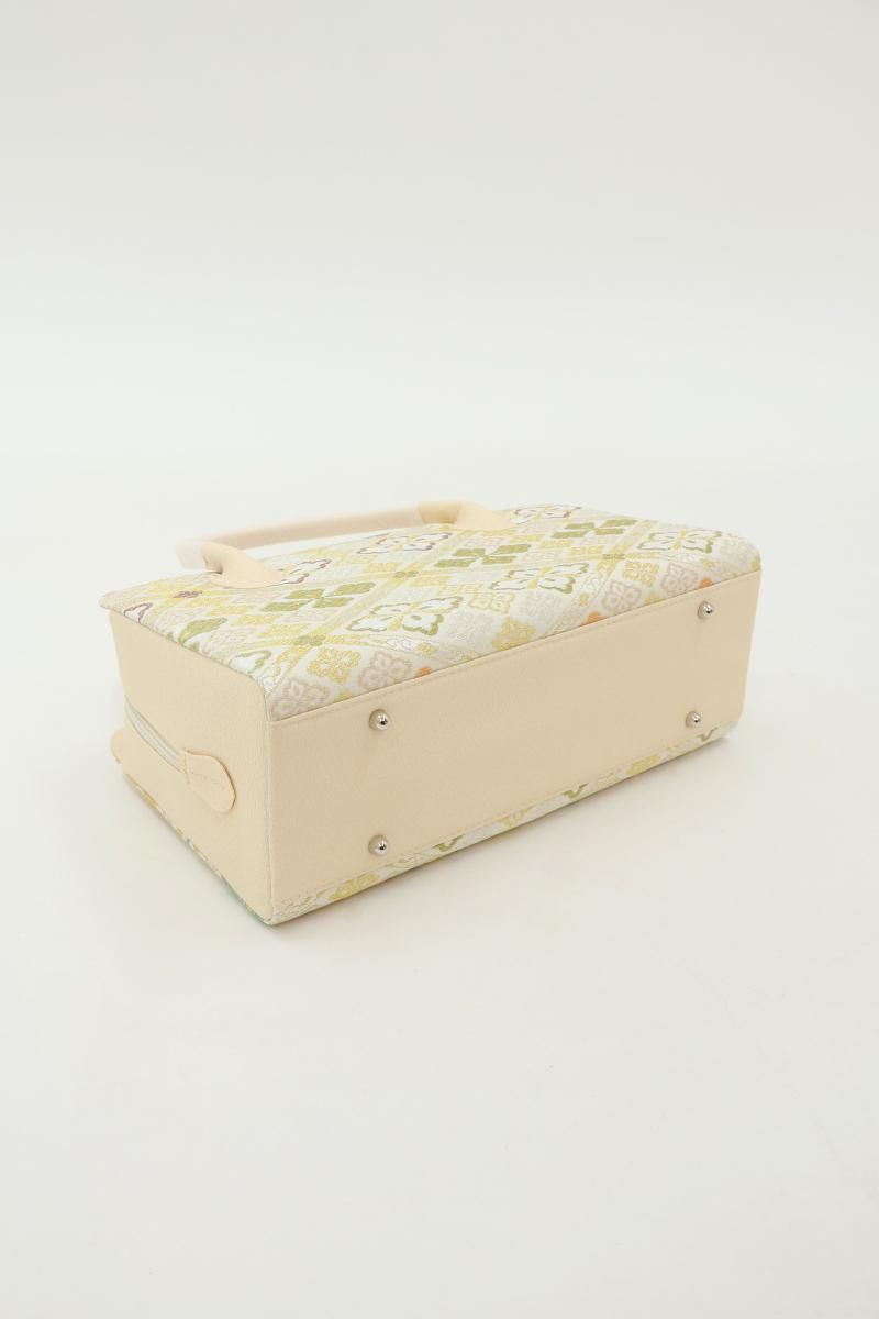 こちらは淡いベージュ地に、優美な色彩で花菱文を配した織地を用いたお品。愛らしい雰囲気の色柄ゆきに絹糸の光沢が美しく映え、エレガントな表情を引き立てています。金銀糸の煌めきを添えた晴れやかな雰囲気の古典意匠は重厚なお着物にも負けないしっかりとした格調を備えていますね。外側に大きなポケットが2つと内側に小さなポケットが1つ付いていますので収納力もばっちり、あらかじめ生地に施されたガード加工や底鋲など細かな点に光る気配りも嬉しいですね。フォーマルシーンに安心してお使い頂ける一点は、華やかなパーティや式典などの改まった場面に重宝頂けることと思います。この機会にいかがでしょうか。