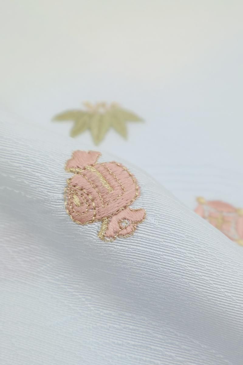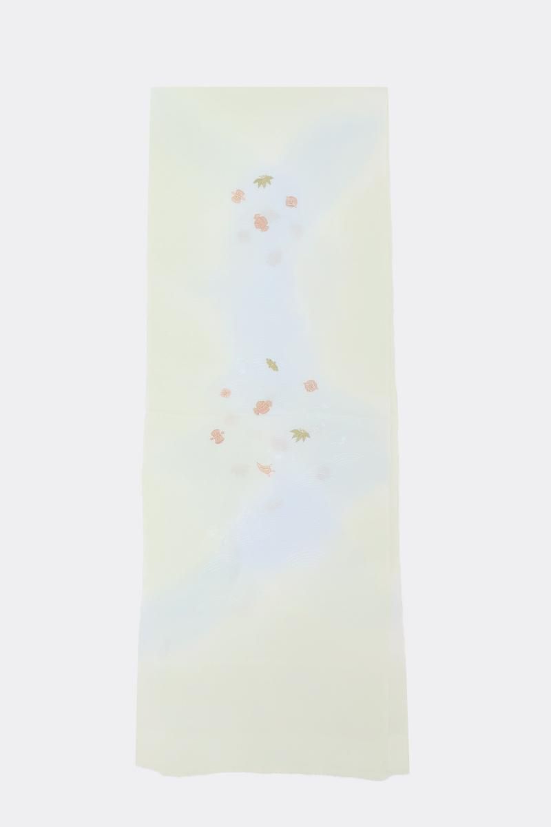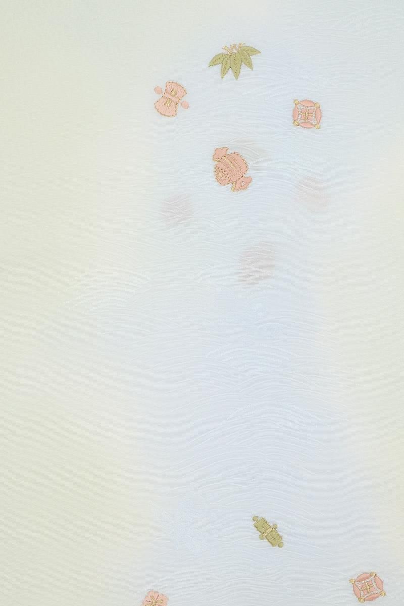 こちらはほのかな光沢を帯びた風合いの地にふんわりと暈かしを配し、金糸を添えた宝尽くし文が刺繍されたお品。無地と同様の使い易さに加えて、立体感のある刺繍が装いにさり気なく洗練を添えてくれますね。お色はごく淡い薄緑色系に淡い水色の暈かし、ドレッシーな小紋から訪問着などの装いの胸元をふんわりと優しく彩ってくれそうです。お出かけから少し改まったお席の装いにいかがでしょうか。