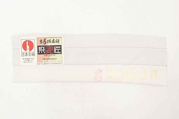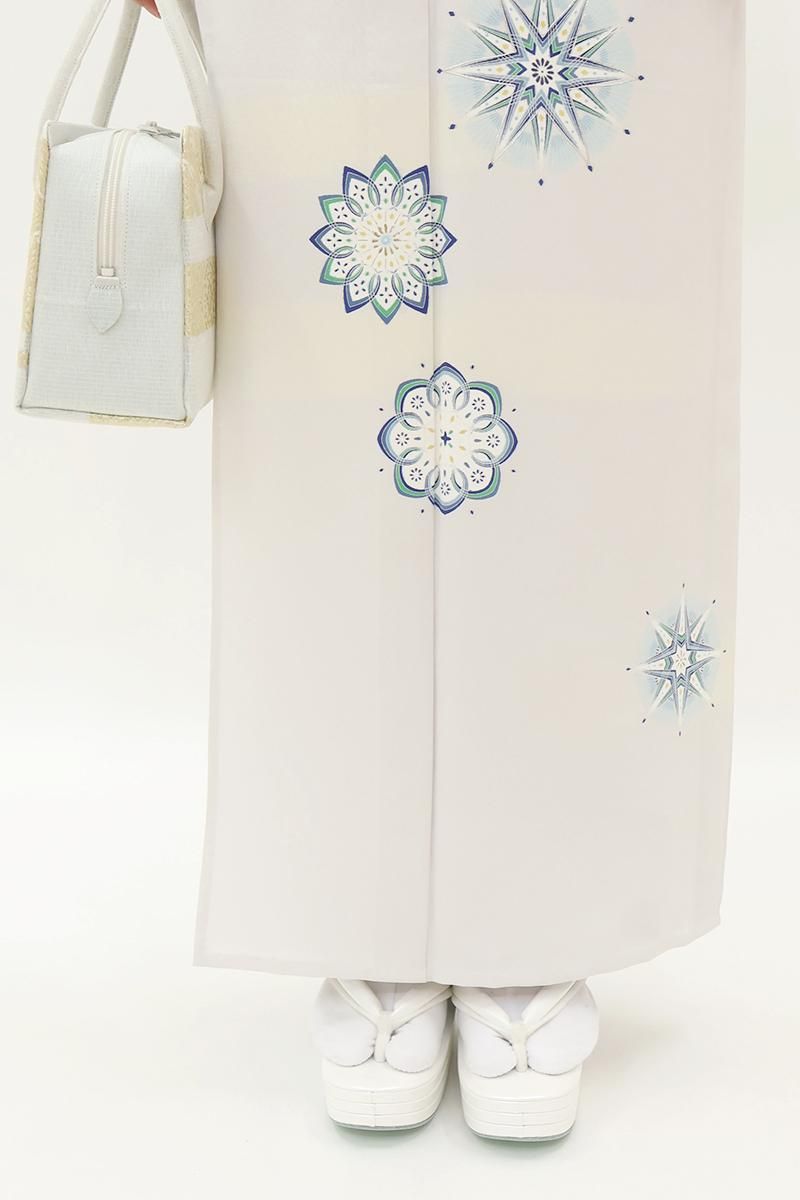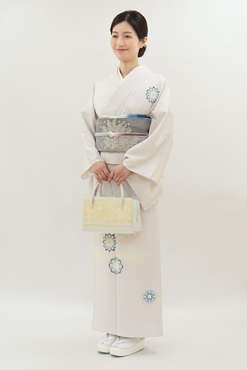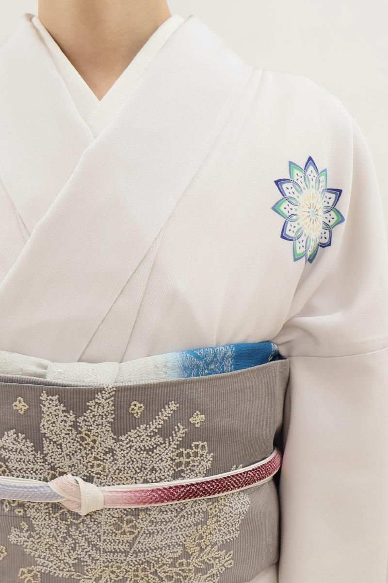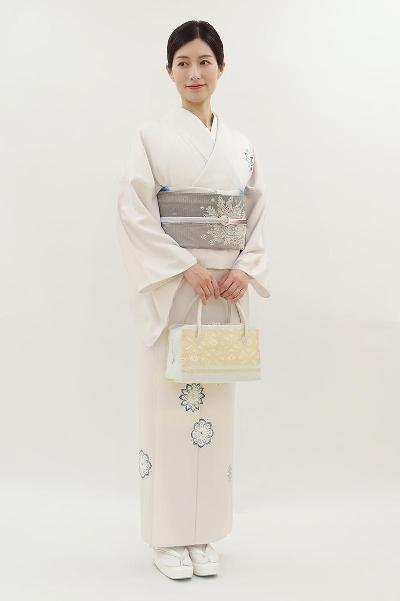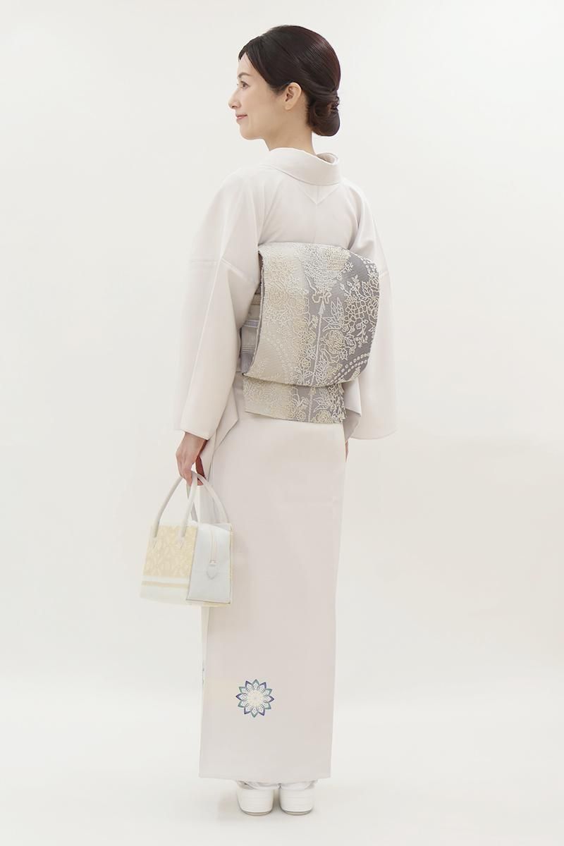 極限まで色を薄めた桜鼠色が近いでしょうか、わずかに紫みを含んだ薄グレーの地に、ふんわりと暈かしを配し、重ねて華文を描いた単衣の付下げです。さらりとした手触りの地に配された、装飾的なモチーフが着る人を品良く引き立てるお品、さりげなく施された金彩の煌めきが気品を添えますね。訪問着より控えた感のある付下げは、ちょっとしたお出かけやからお食事会、パーティなど様々な場面で活躍してくれることと思います。この機会にいかがでしょうか。