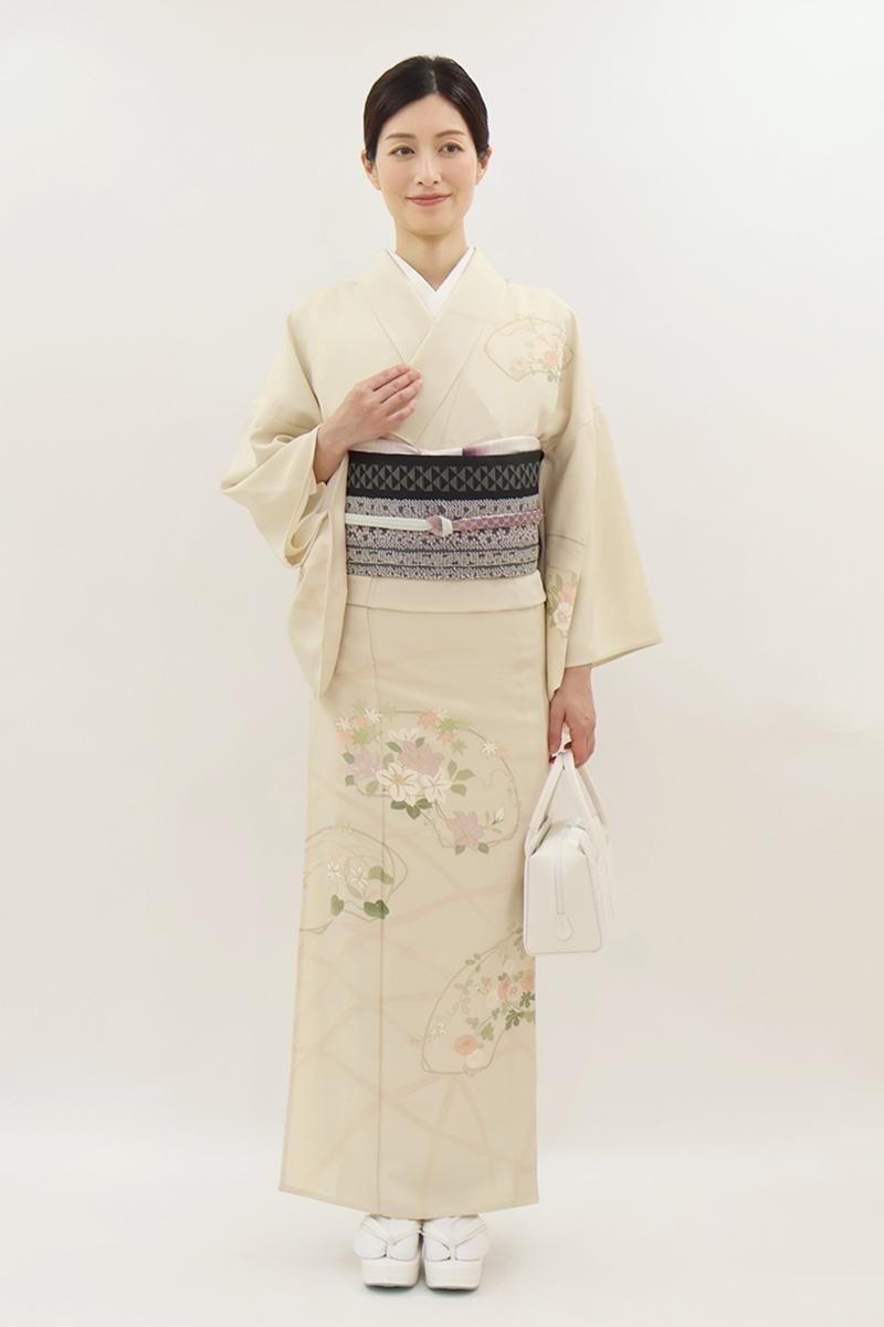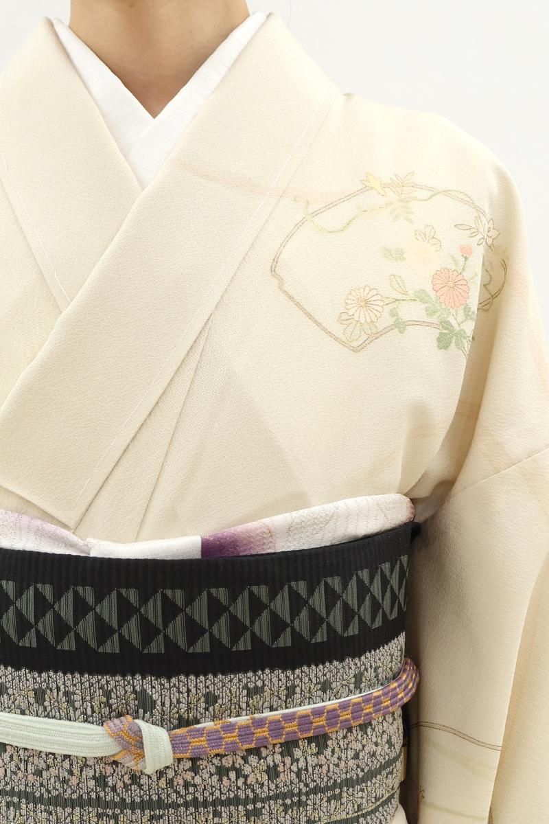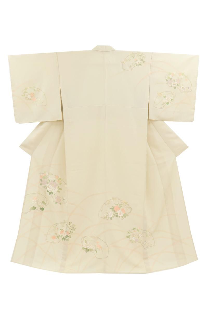象牙色が近いでしょうか、灰みのクリームベージュ系の地に、地紙に四季花文を染めた単衣の訪問着です。こちらは浅いシボを帯びたさらりとした地風に、おおらかな地紙のかたちに鉄線や菊など四季花文を配したお品、しっとりとしたお色目に優美な色遣いで描かれた意匠が装いを風情ゆたかに引き立ててくれることと思います。柄に施された金彩のきらめきが一層の気品を添えますね。様々な帯合わせで、お茶席などの改まった場面にいかがでしょうか。