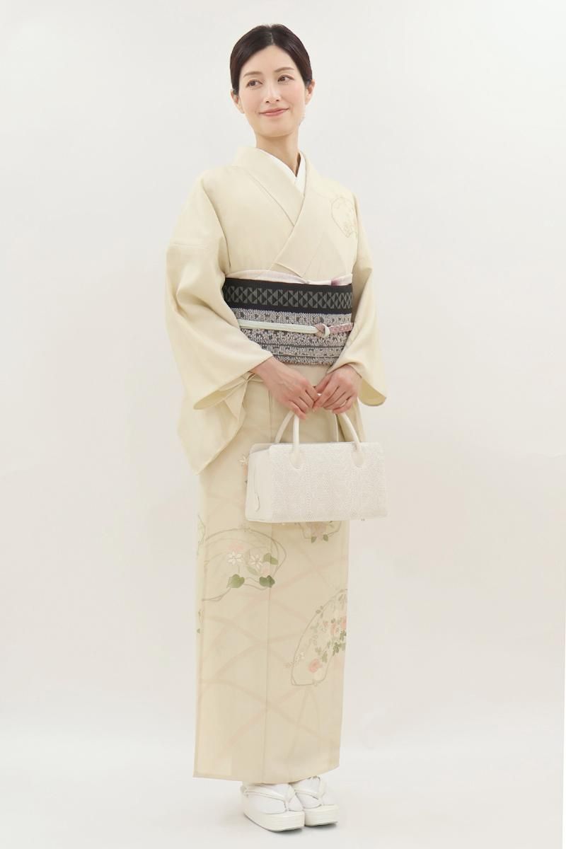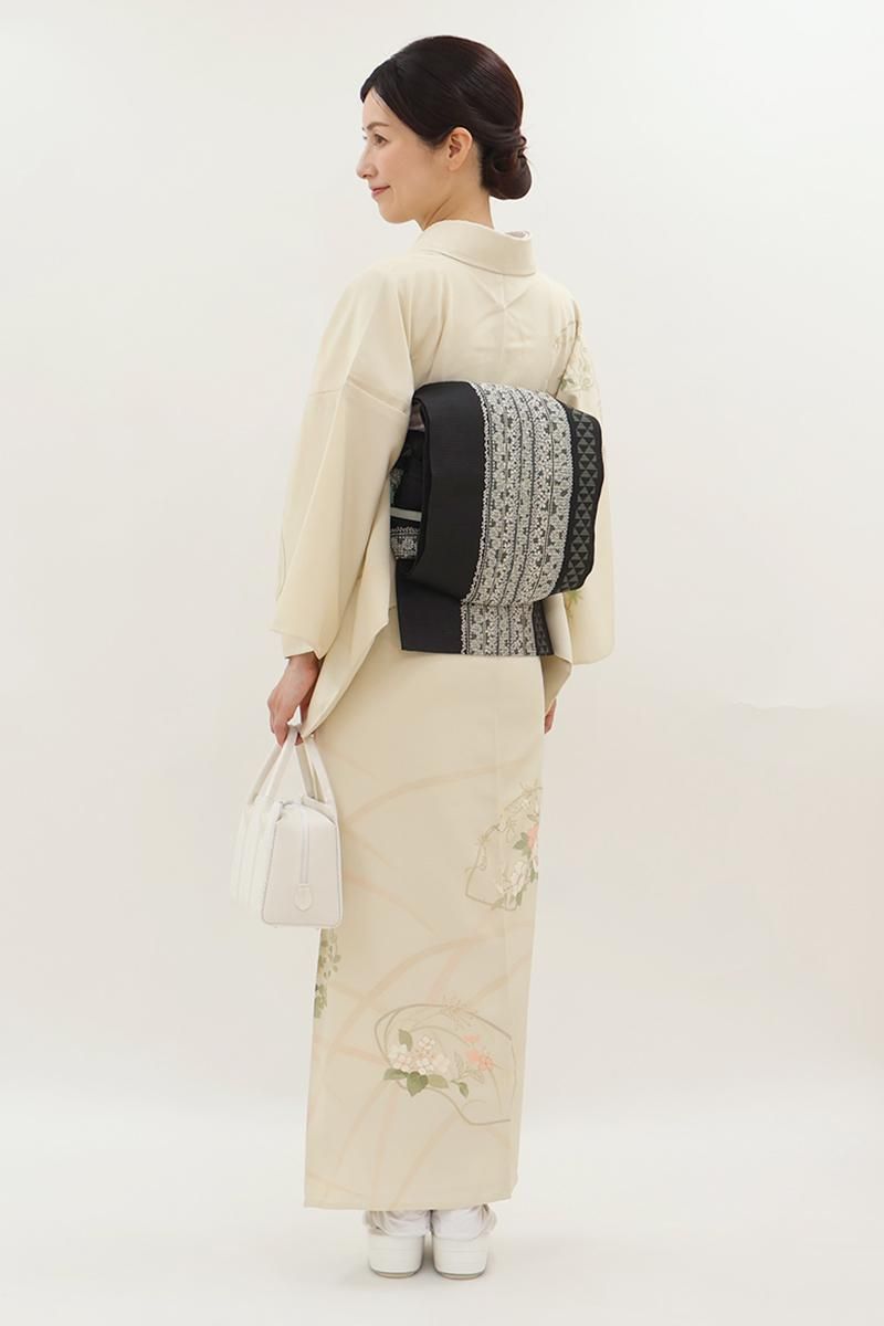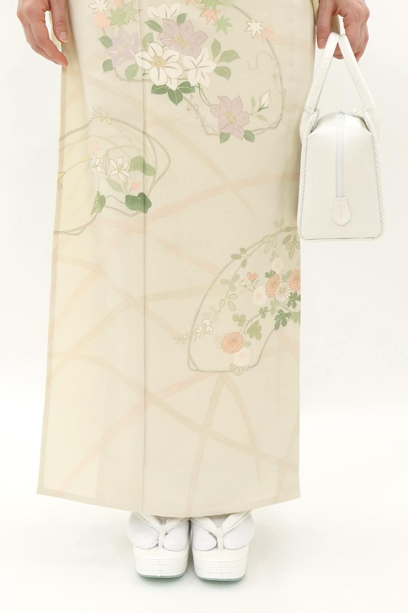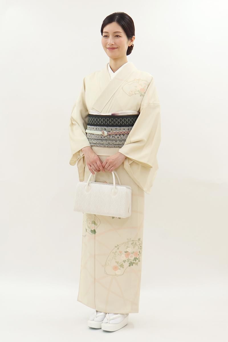 象牙色が近いでしょうか、灰みのクリームベージュ系の地に、地紙に四季花文を染めた単衣の訪問着です。こちらは浅いシボを帯びたさらりとした地風に、おおらかな地紙のかたちに鉄線や菊など四季花文を配したお品、しっとりとしたお色目に優美な色遣いで描かれた意匠が装いを風情ゆたかに引き立ててくれることと思います。柄に施された金彩のきらめきが一層の気品を添えますね。様々な帯合わせで、お茶席などの改まった場面にいかがでしょうか。