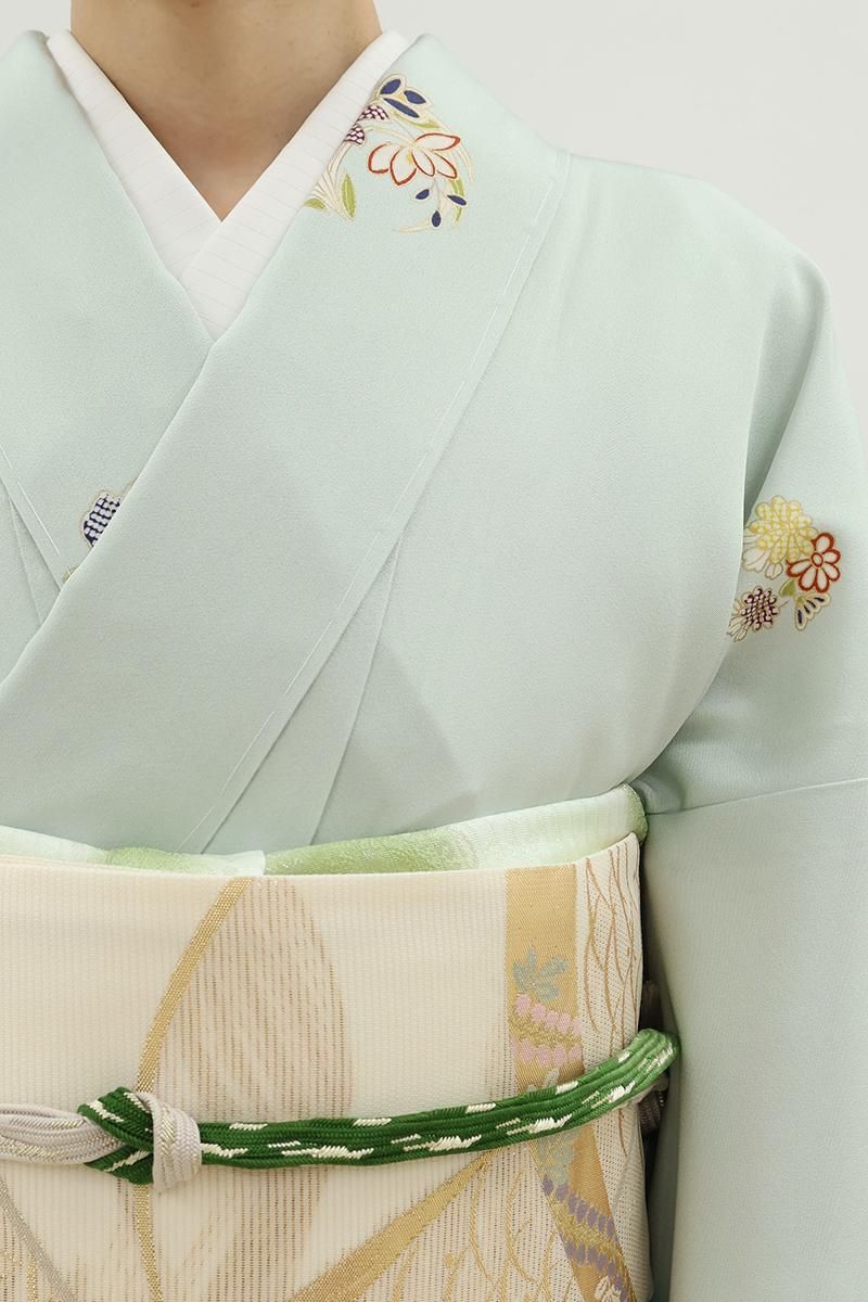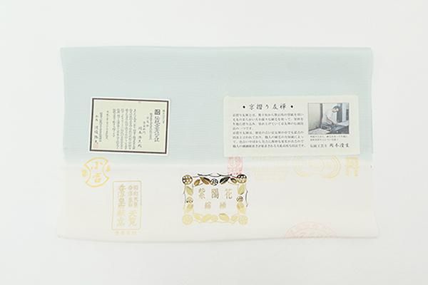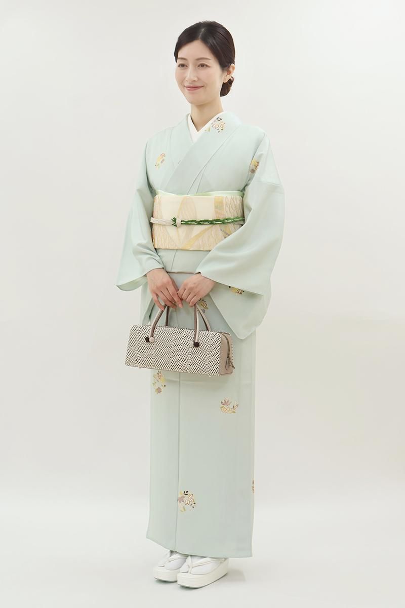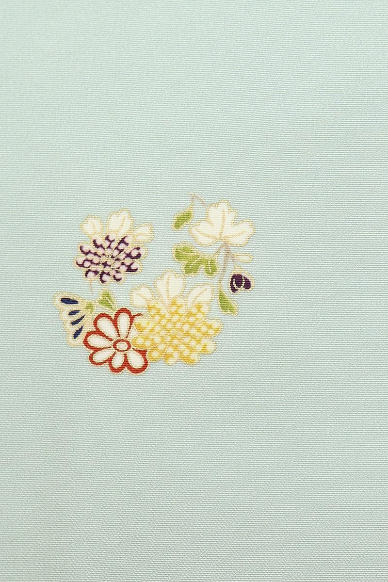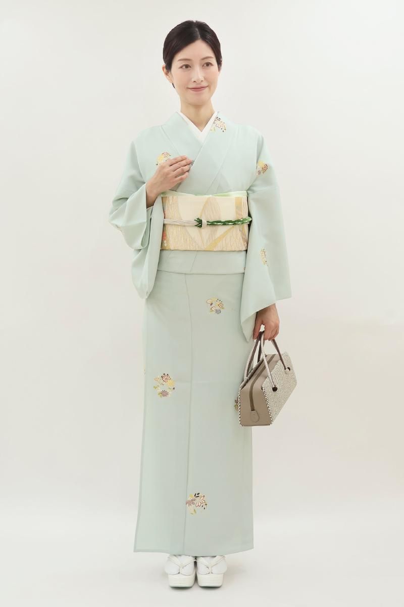 ぐっと色を薄めた水縹色が近いでしょうか、、灰みの強いごく淡い青緑色系の地に、四季花の丸を描いた単衣の小紋です。こちらは京友禅作家・岡本澄生さん作のお品、すっきりと爽やかな色遣いで表現されたモチーフが上品な着姿を演出してくれますね。上品な印象の小紋は季節の染め帯などは勿論のこと、ドレッシーな雰囲気の帯を合わせて頂けば少し改まったお席などにもお召し頂けることと思います。この機会にいかがでしょうか。
