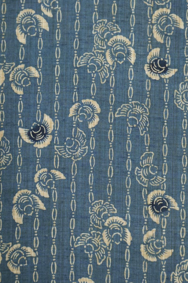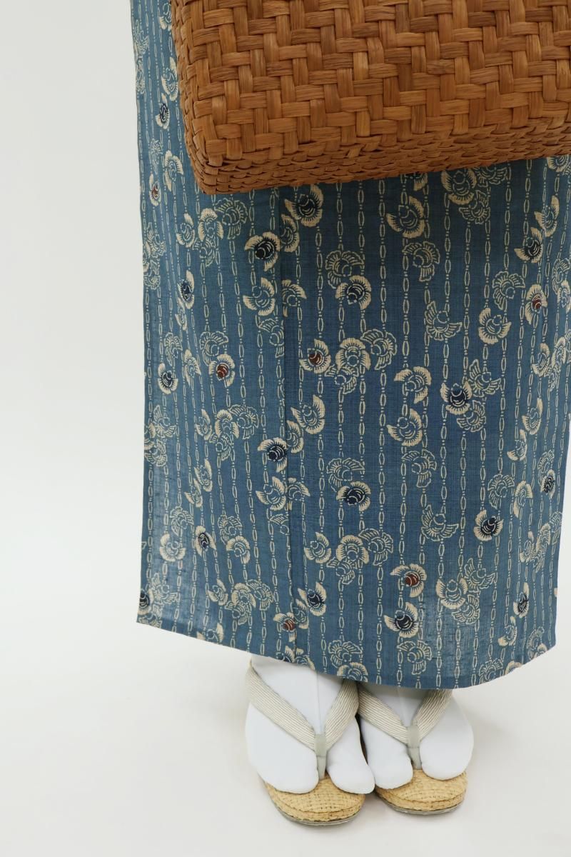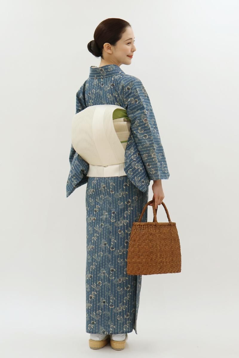 程よく落ち着いたお色目に小ぶりの福良雀が愛らしく映えるお品、上質な木綿地に小紋感覚の染ですので、浴衣としてはもちろん、画像の様に半衿を付けて木綿着物としての装いもお楽しみいただけますね。この夏のお支度にいかがでしょうか。