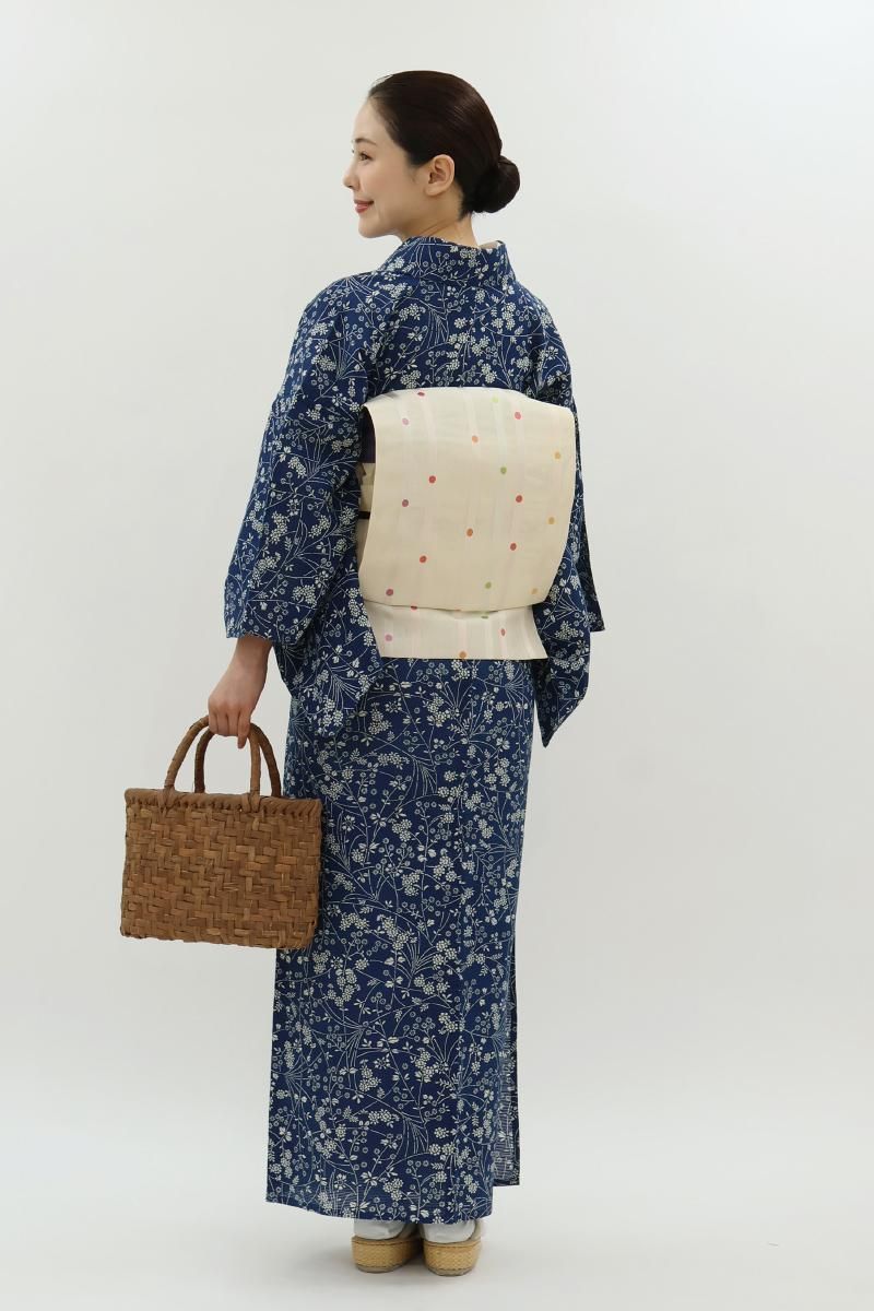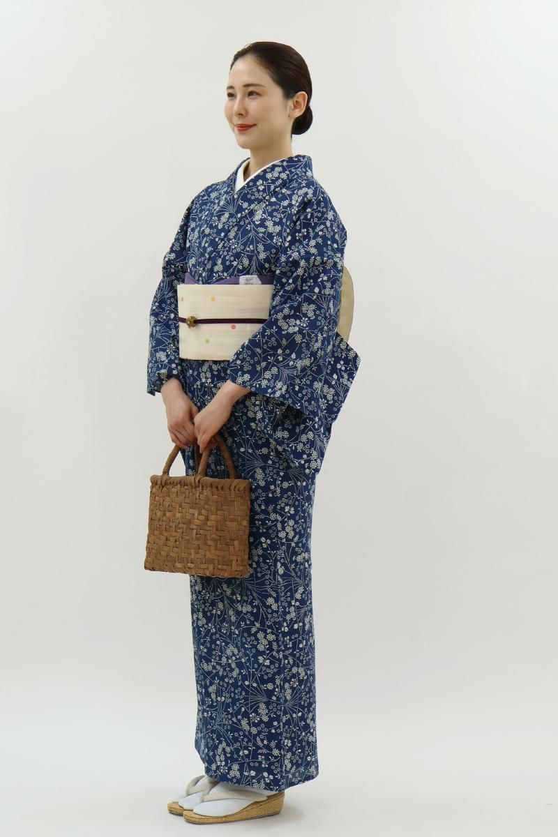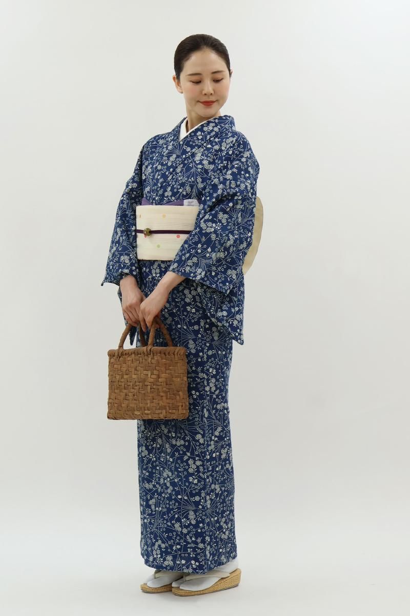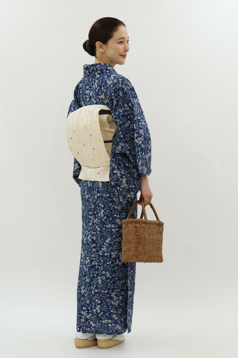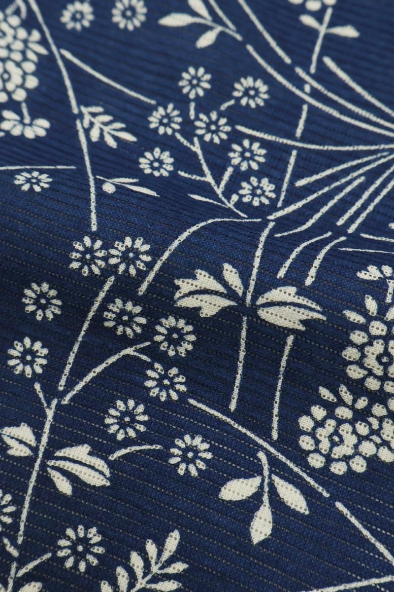 6メートルもの長さの板に生地を張り、反物の両面に狂いなく型の糊置きをする長板中形藍染めは、その技術を伝える職人さんが殆どいなくなりつつあります。こちらは紺青色が近いでしょうか、ごく深い青色の地に様々な花をあしらったお品、上質感のある綿絽素材ですので八寸名古屋帯などを合わせて少しきちんと感のある装いも素敵ですね。澄んだ藍と白とのコントラストがつくる凜とした清涼感をぜひお楽しみ下さいませ。
