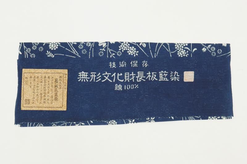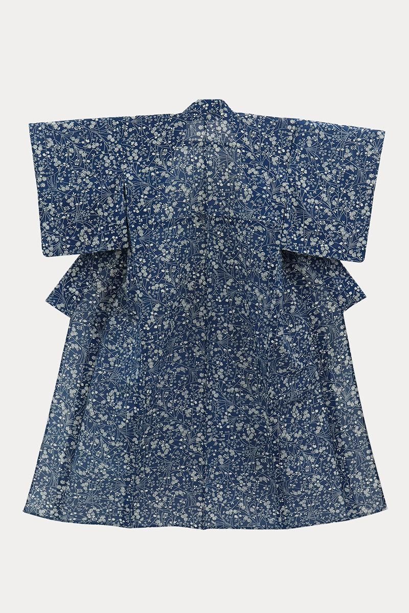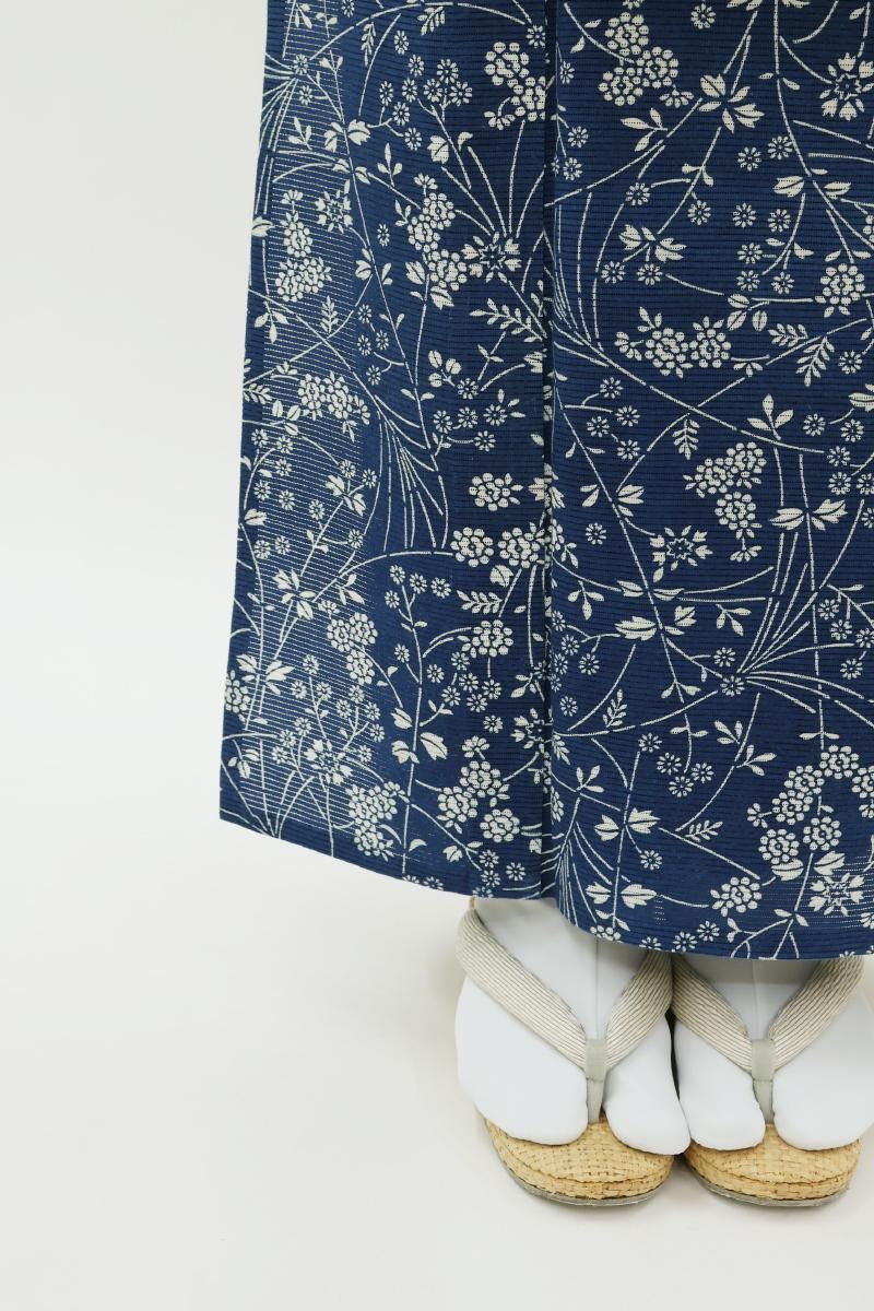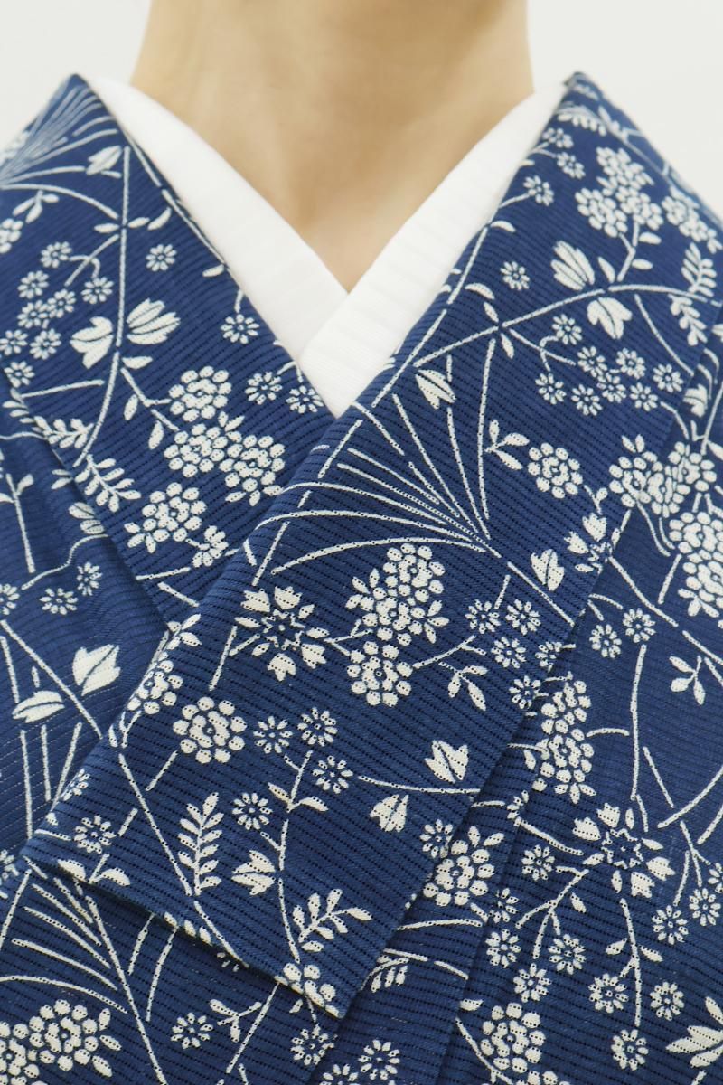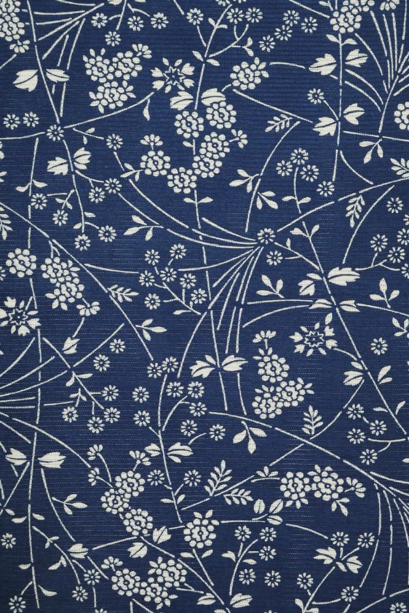 6メートルもの長さの板に生地を張り、反物の両面に狂いなく型の糊置きをする長板中形藍染めは、その技術を伝える職人さんが殆どいなくなりつつあります。こちらは紺青色が近いでしょうか、ごく深い青色の地に様々な花をあしらったお品、上質感のある綿絽素材ですので八寸名古屋帯などを合わせて少しきちんと感のある装いも素敵ですね。澄んだ藍と白とのコントラストがつくる凜とした清涼感をぜひお楽しみ下さいませ。