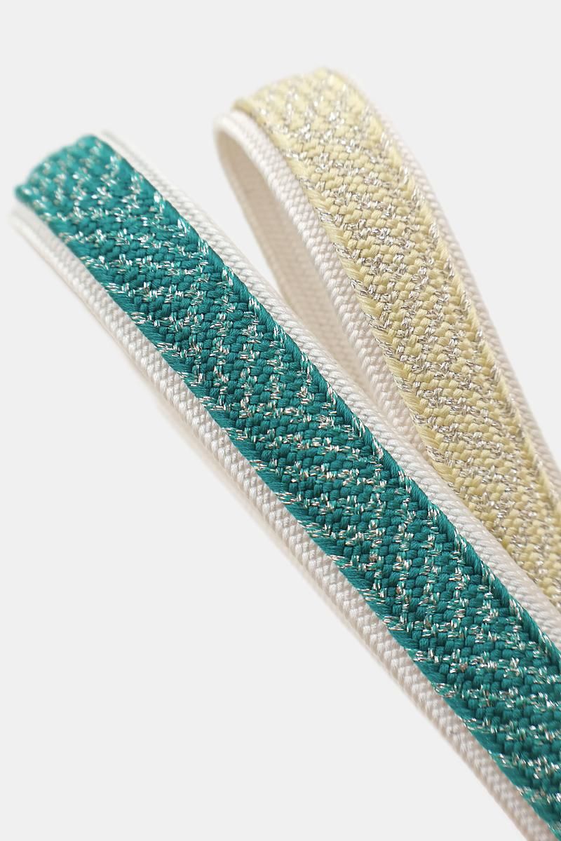 こちらは白を縁取りに取り合わせの良い三色を暈かしに配し、煌びやかな銀糸を組み込んだお品。やや幅の広めな安定感のある一本は、確かな存在感と高い格調でフォーマルな袋帯を美しく引き立ててくれることと思います。お色は明るいクリームイエローをベースとして鮮やかな青緑系の濃淡の暈しの組み合わせ。心華やぐ晴れやかな表情がとても印象的ですね。この機会にぜひお手元にてご覧くださいませ。
