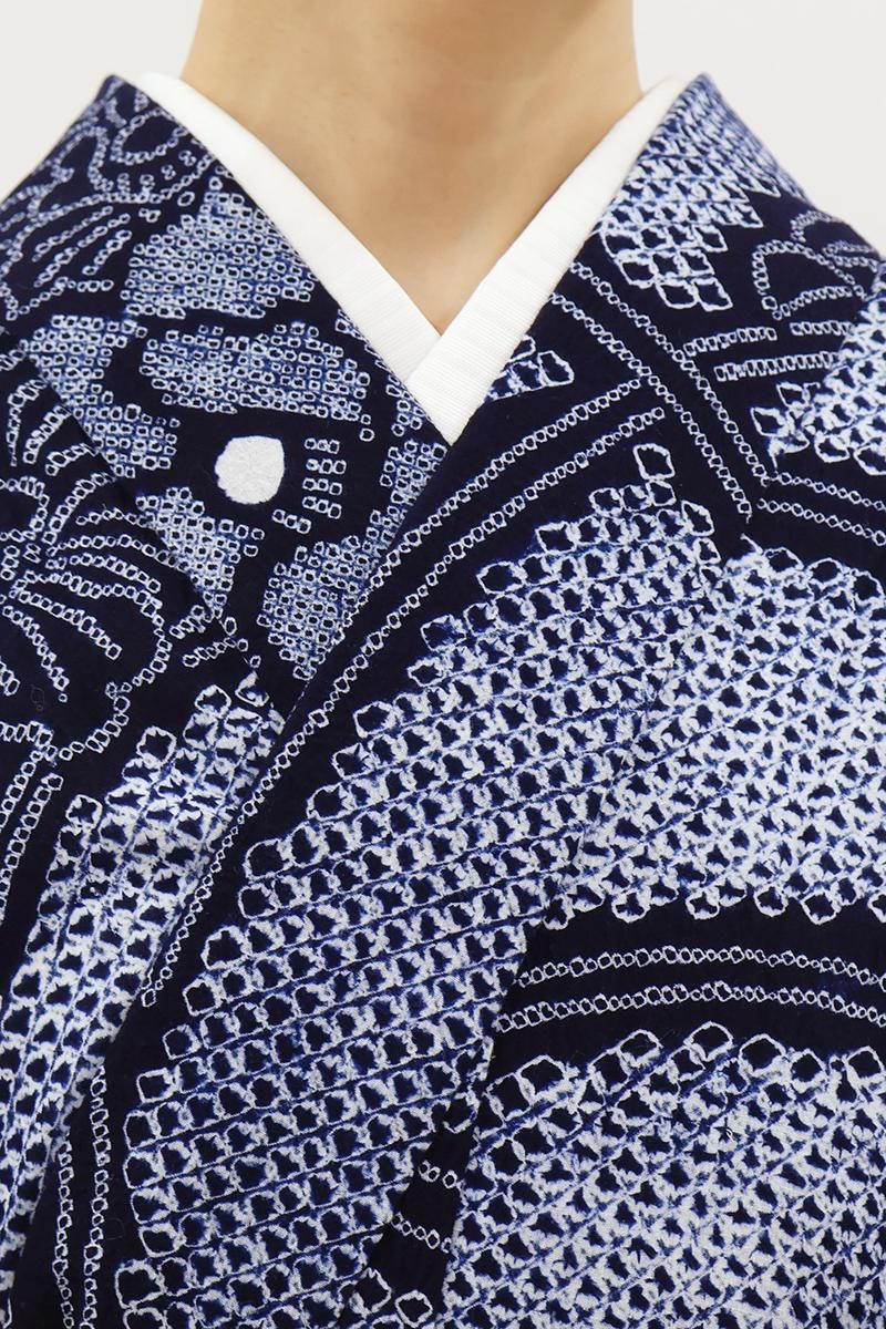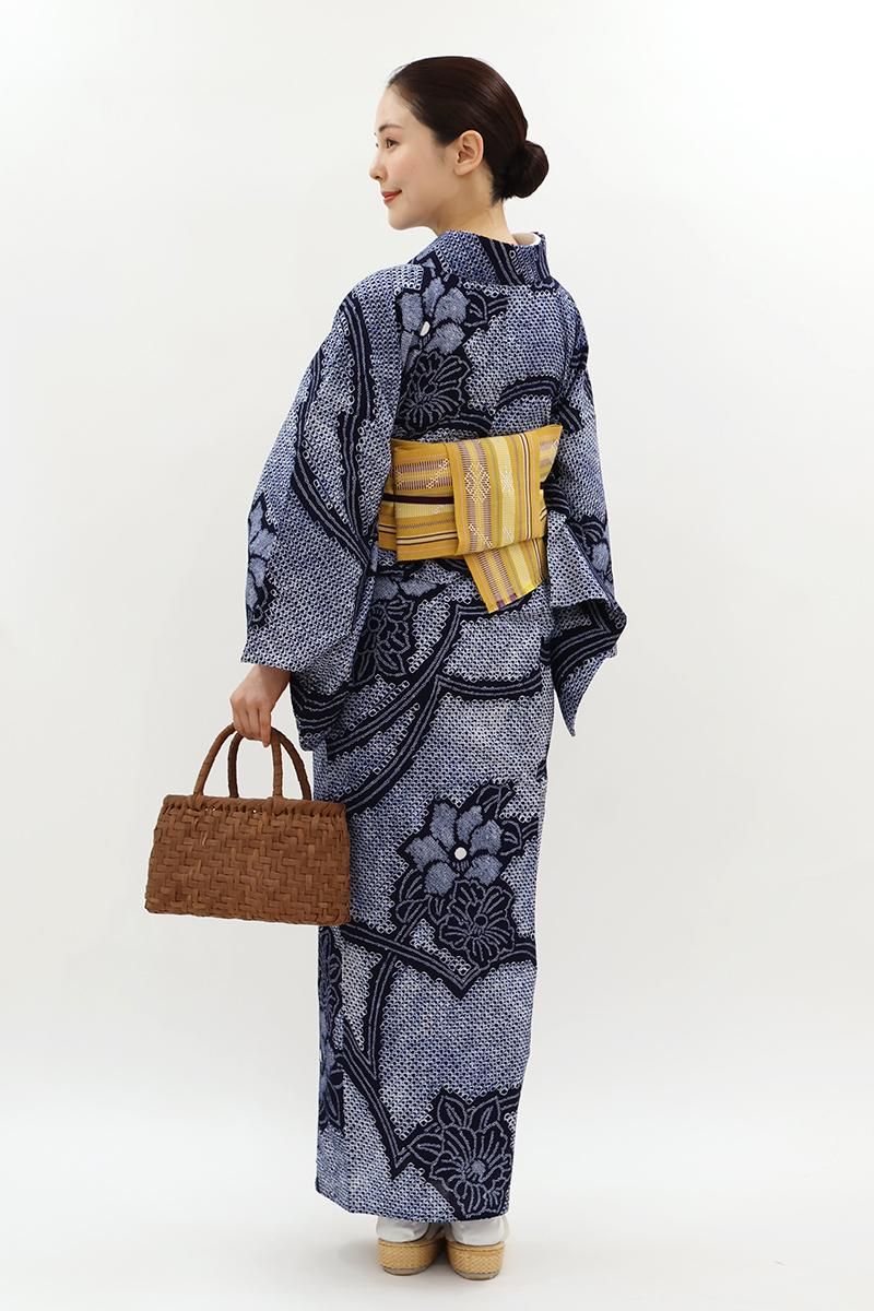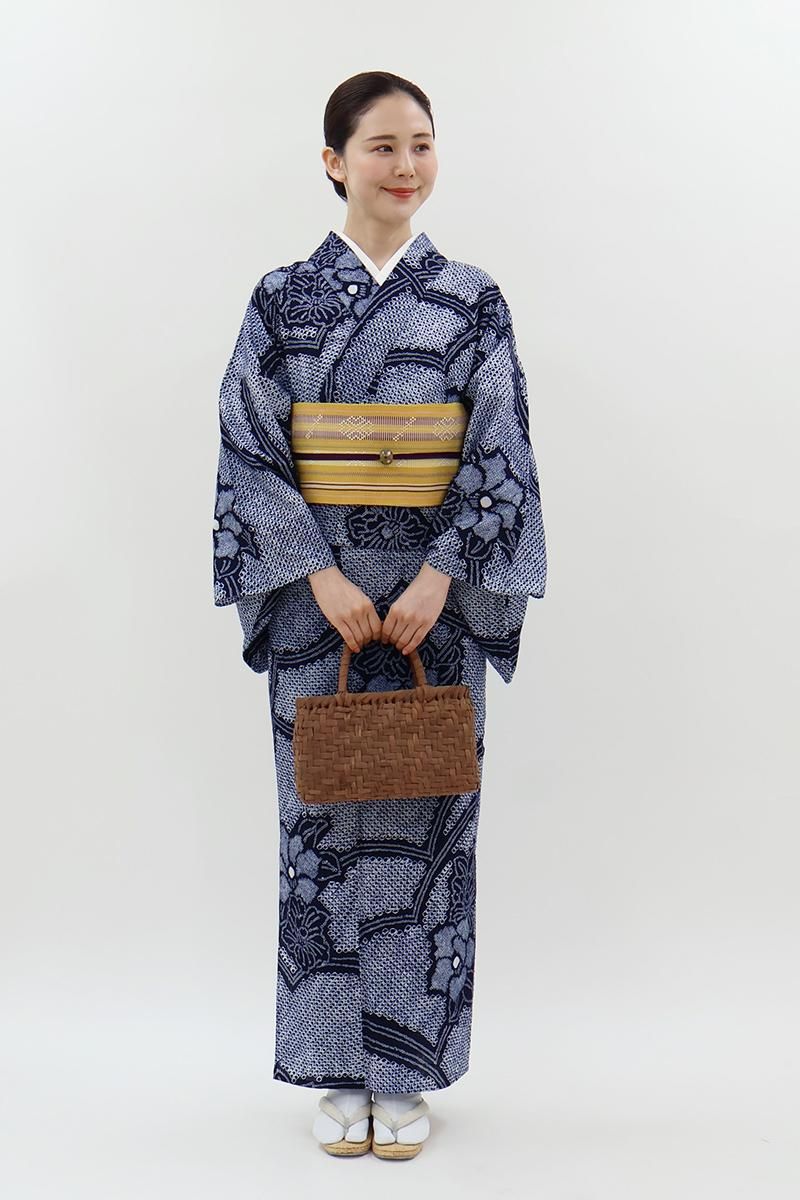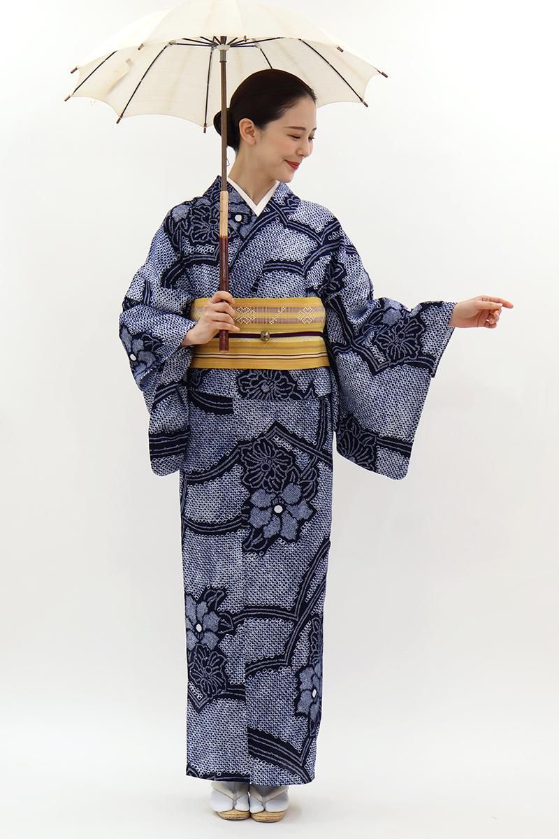 こちらは絞りの名門として知られる藤娘きぬたやさんのお品、地をふっくらと埋める細かな絞りの風合いが着る方を上品な華やぎで包んでいますね。まさに日本の夏ならではの風趣豊かな装いをお楽しみいただけることと思います。半幅帯だけでなく、夏の八寸名古屋帯などを合わせてきちんと感のある着こなしも素敵ですね。夏のお出かけに、軽やかな着心地をお楽しみくださいませ。