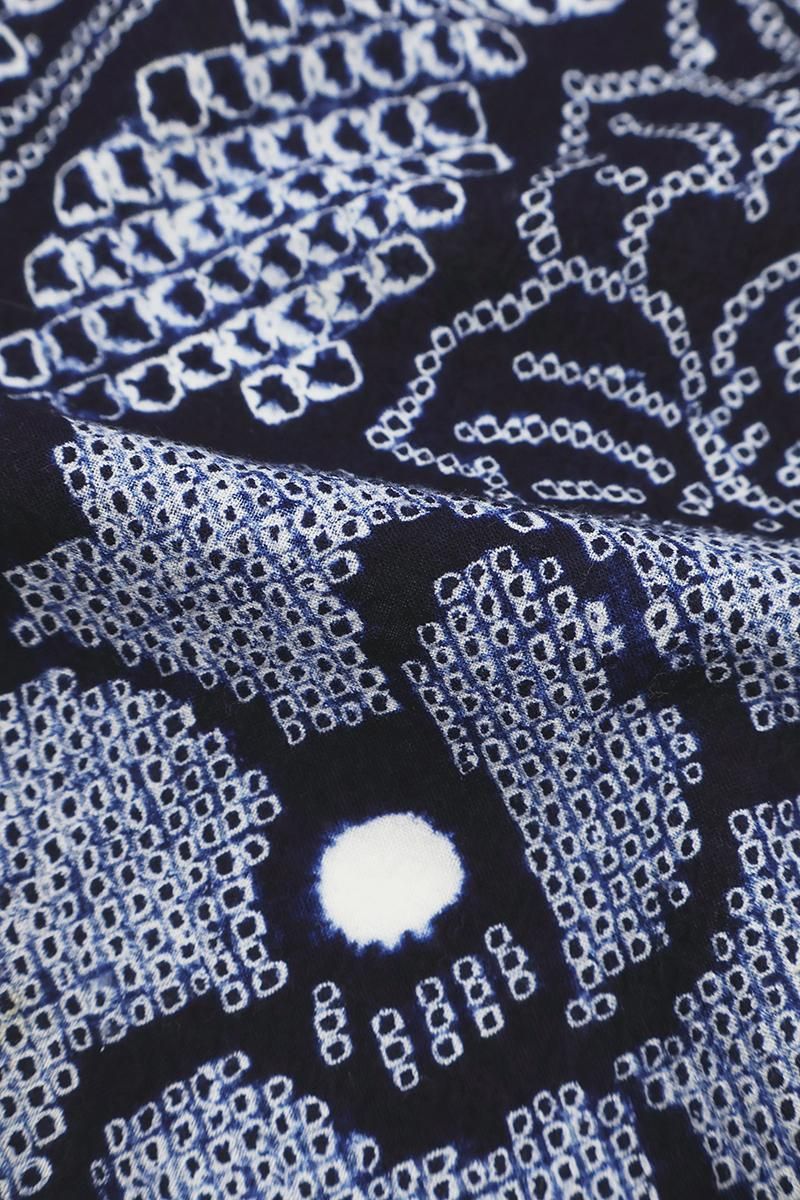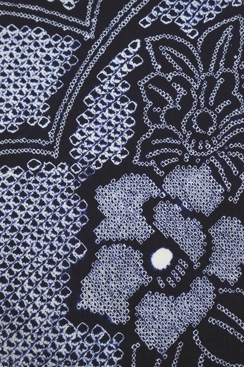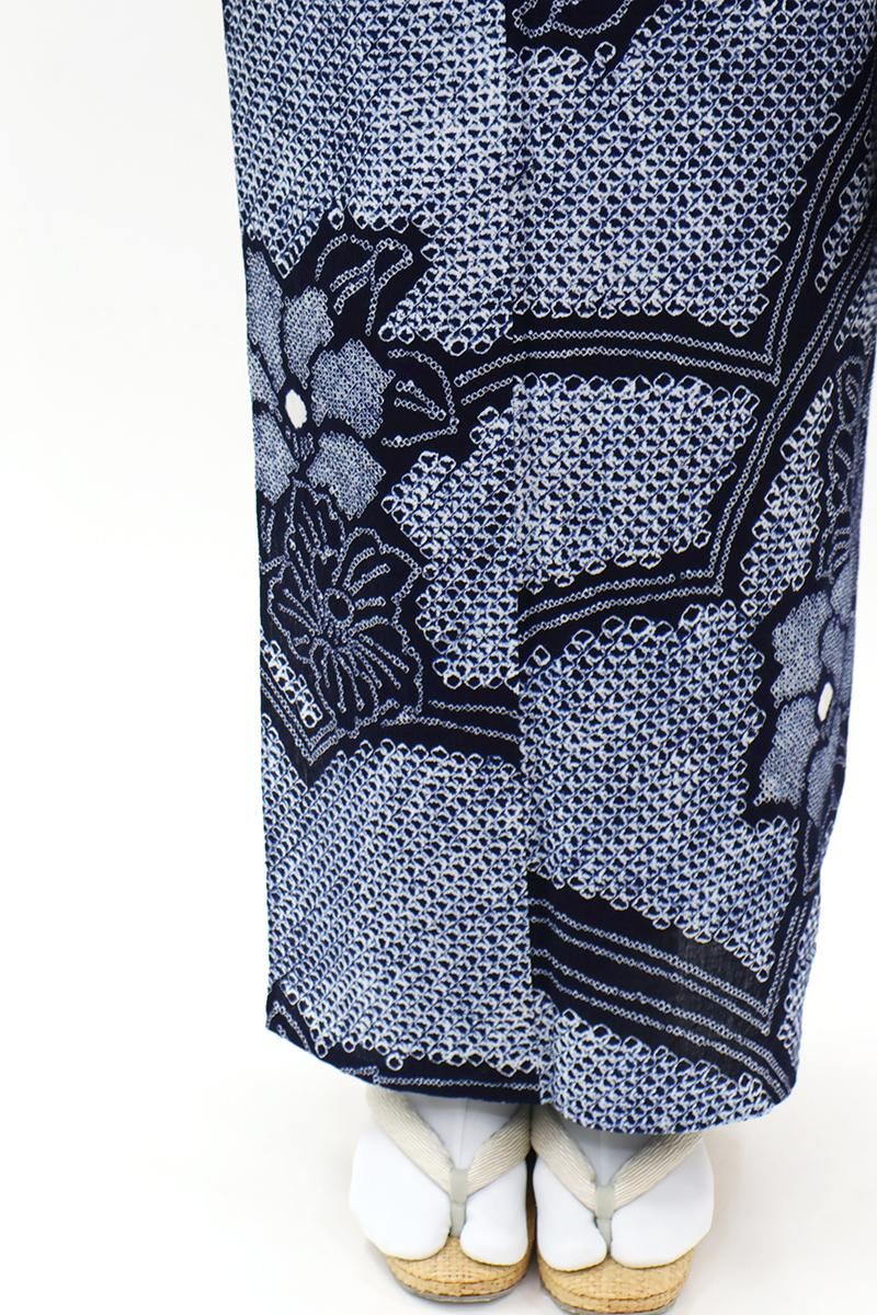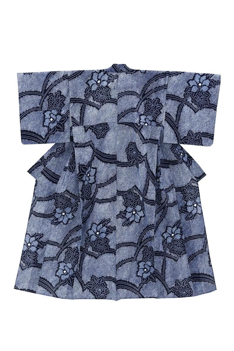 深い紫みの青でおおらかな花の図を配した絞り染めの浴衣です。
