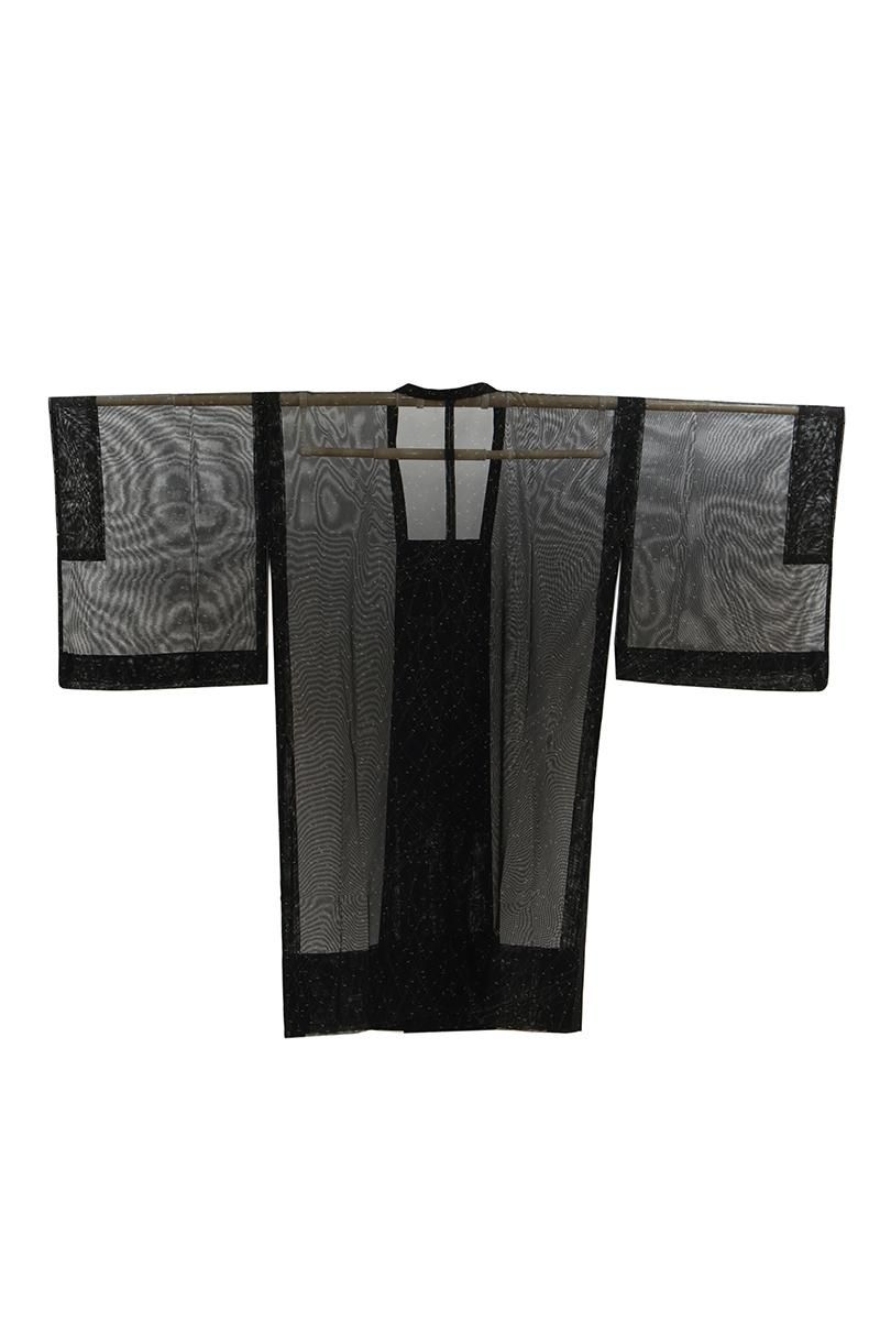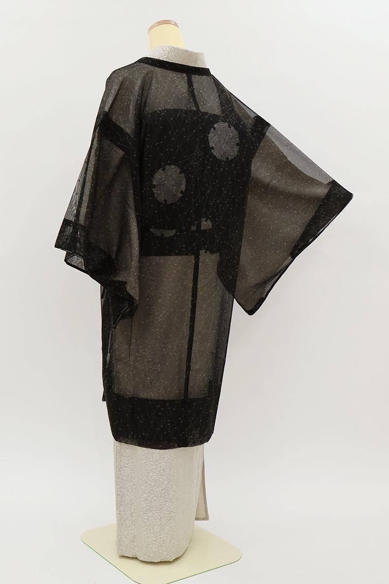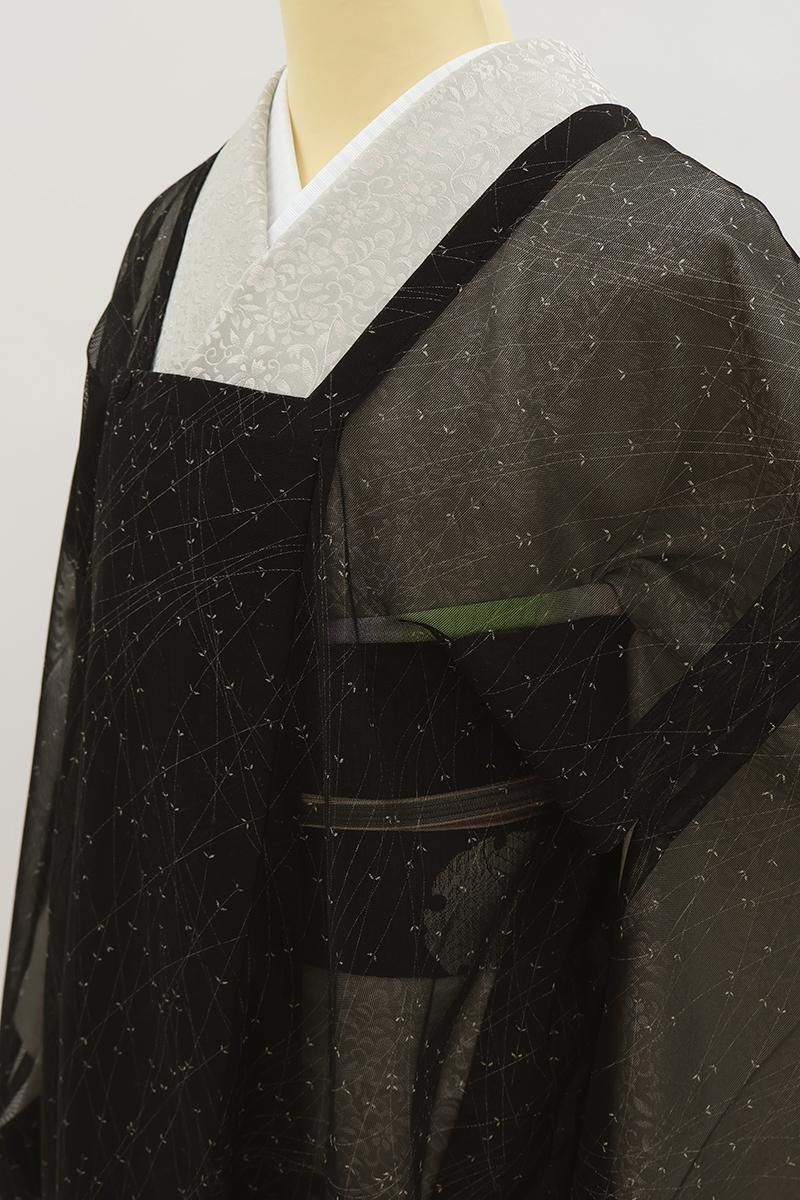 黒色の紗地に抽象的な植物のモチーフを全体に配した道行コートです。