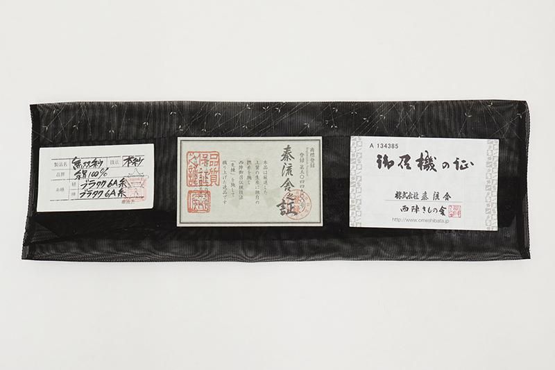 こちらは西陣の織元・秦流舎製のお品、ごく薄手ながら張りのあるしゃりっとした風合いの地が風を通し、暖かくなるこれからの季節にも快適にお召しいただけることと思います。濃色のコートは淡色の着物を重ねることで透け感が際立ち、一層の清涼感を運んでくれますね。防寒が不要の春夏の時期でもやはり、塵除けとして一枚羽織っていただくと安心です。ぜひこの機会にご用意下さいませ。