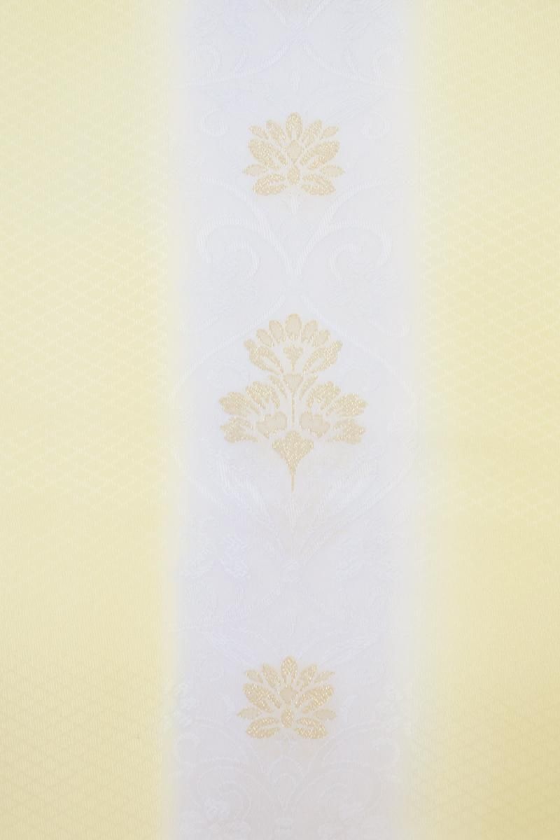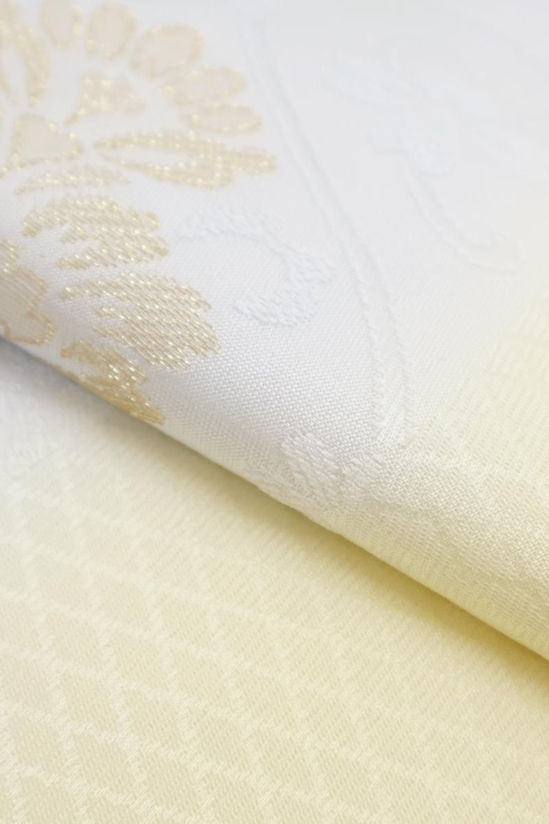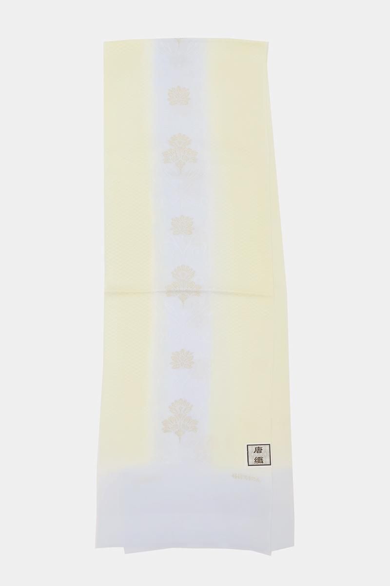 こちらは金糸を用いた繊細な織りで唐花を配したお品。胸元からちらりと覗く煌めきと美しい淡彩が、装いに一層の格調を添えてくれますね。こちらは淡いレモンイエローをベースに、ごく淡い青紫色がアクセントとなる一枚。どなたにも好感度の高い洗練された彩りが、装いを上品にまとめてくれることと思います。改まったお席の装いにいかがでしょうか。
