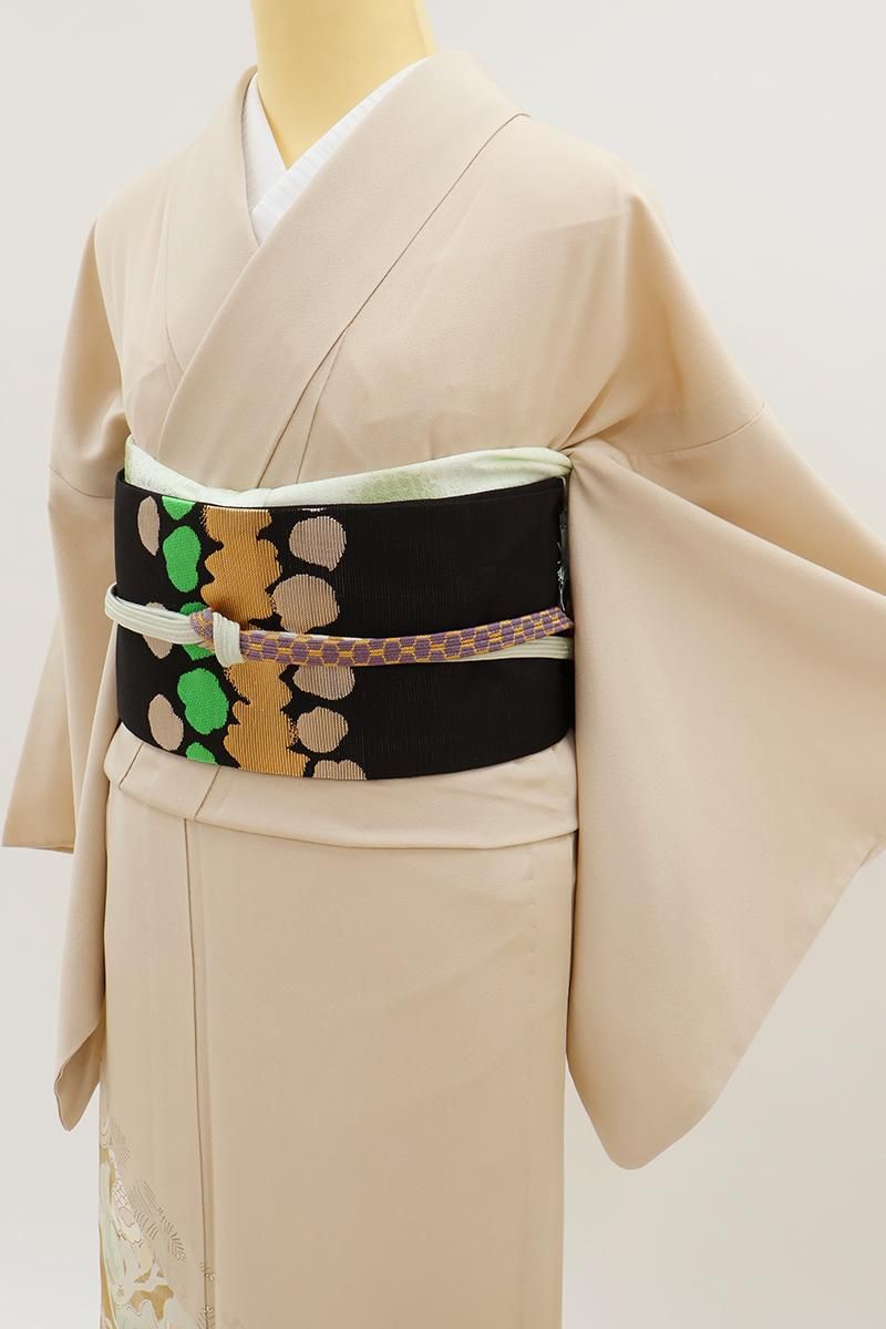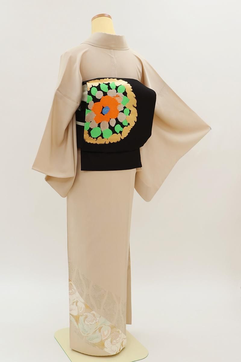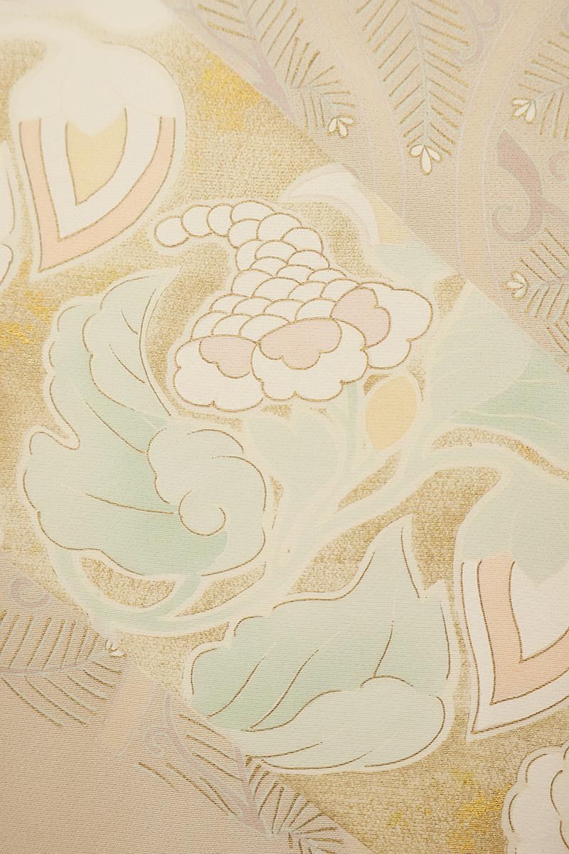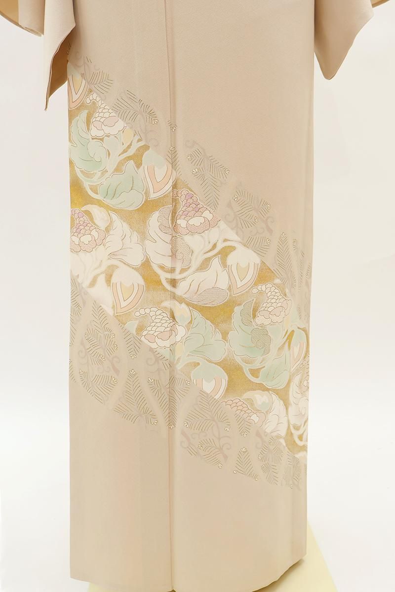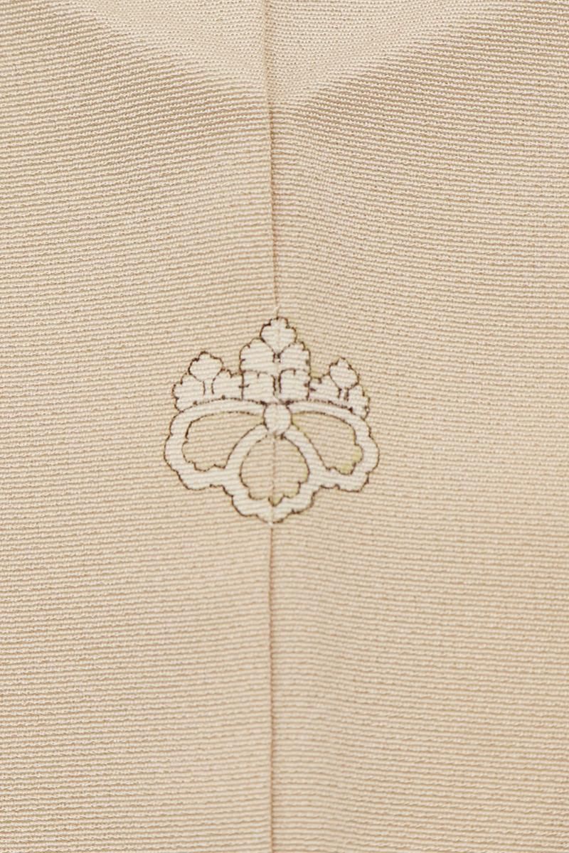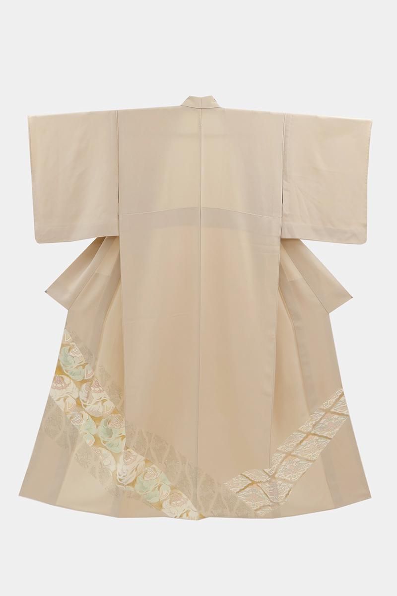 薄香色が近いでしょうか、さらりとした淡いベージュの地に、斜め段に松葉立涌や唐花の丸などを配した単衣の色留袖です。