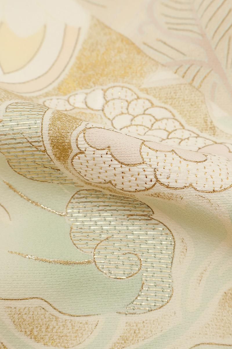 地色に馴染むような柔らかな色遣いに現代的な洗練の光る一枚、金糸や金彩、ふっくらとした繍いが華やぎと格調を添え、晴れの日の装いを美しく引き立ててくれそうですね。色留袖のかたちですが、一ッ紋ですので訪問着に近い感覚でより幅広い場面でお召しいただけることと思います。この機会にいかがでしょうか。