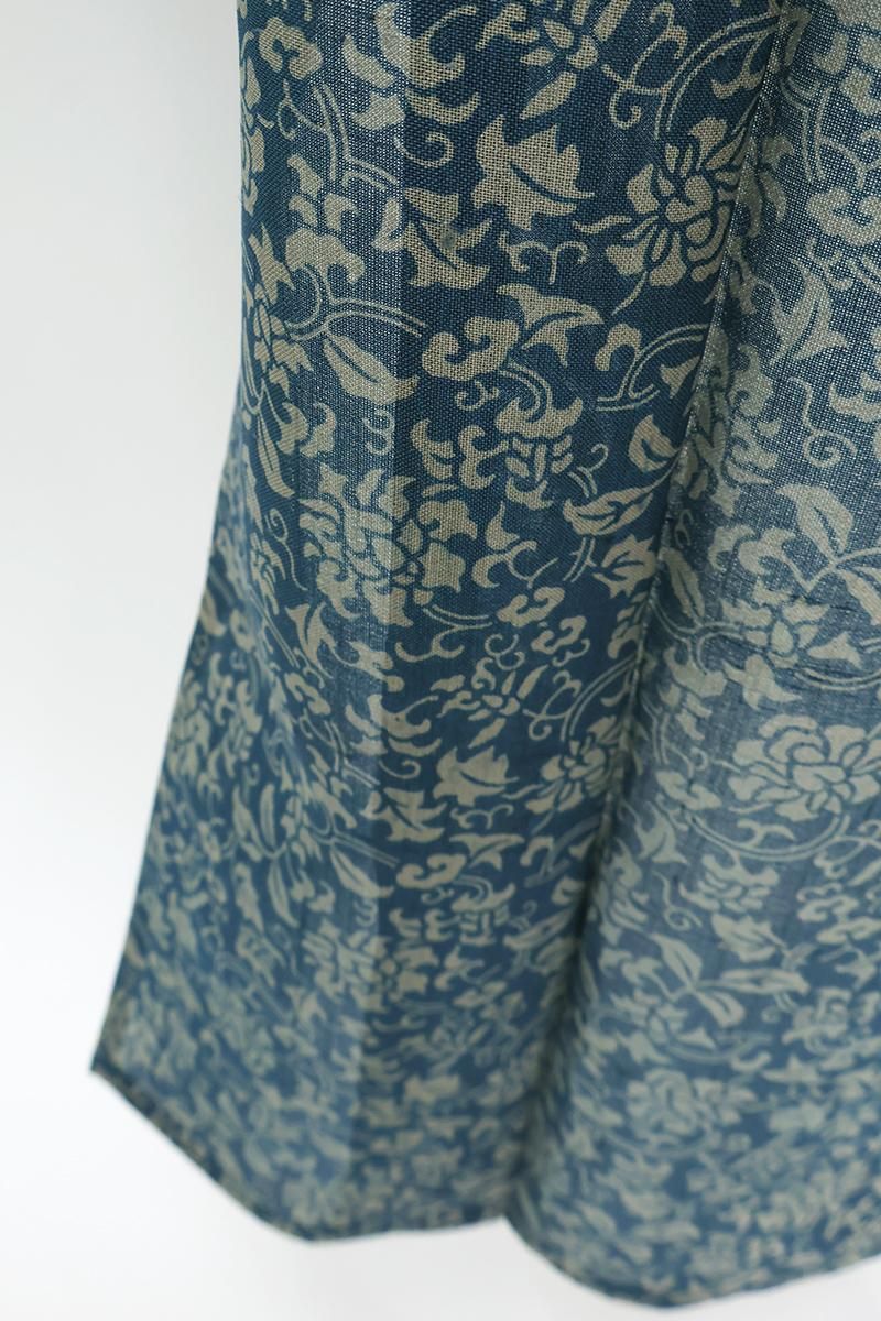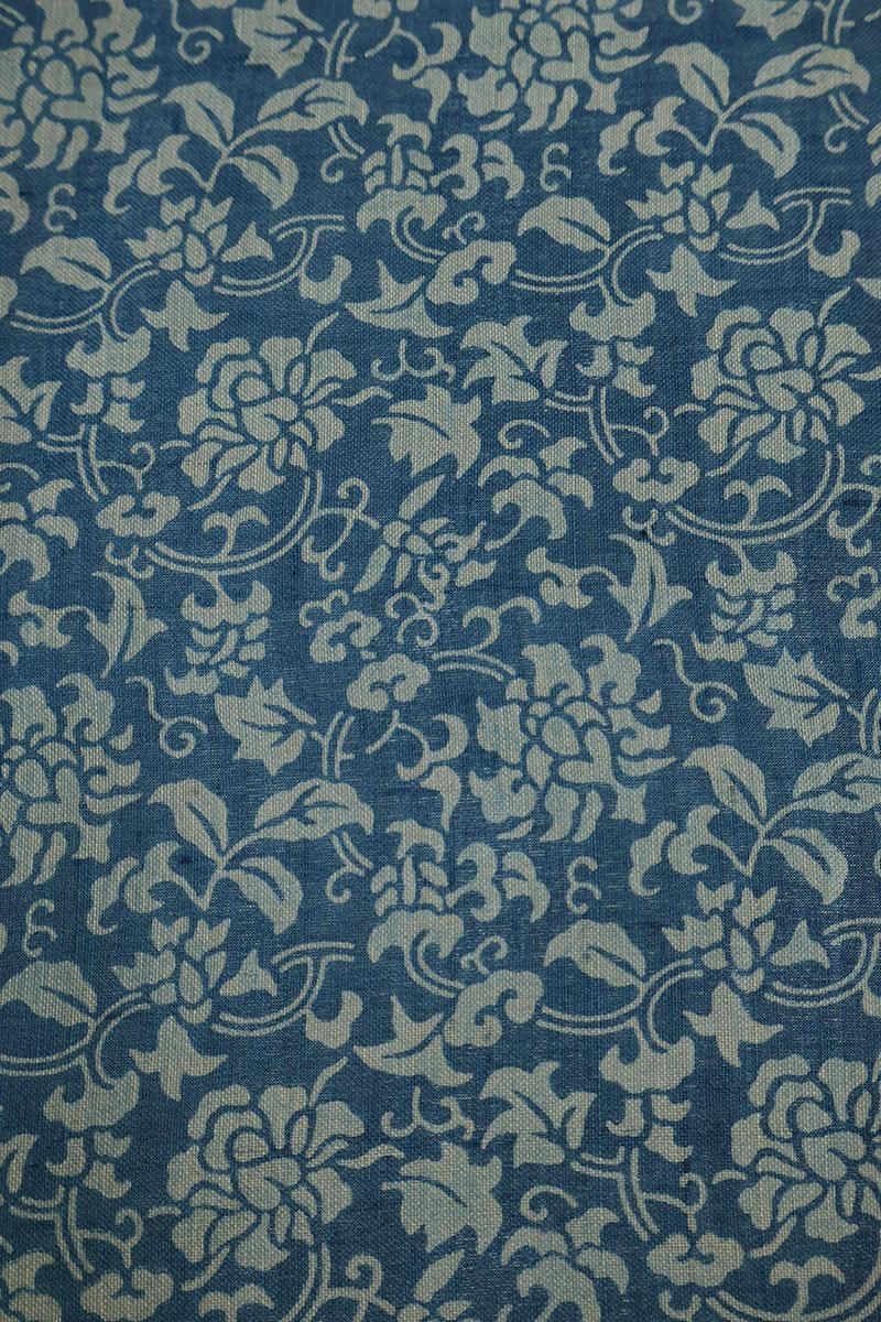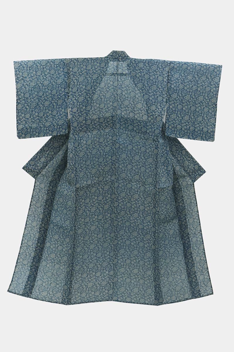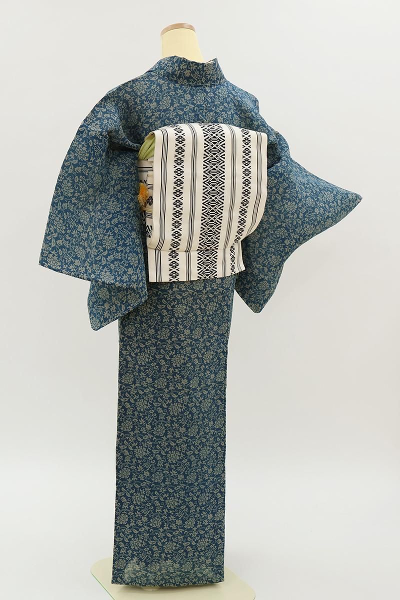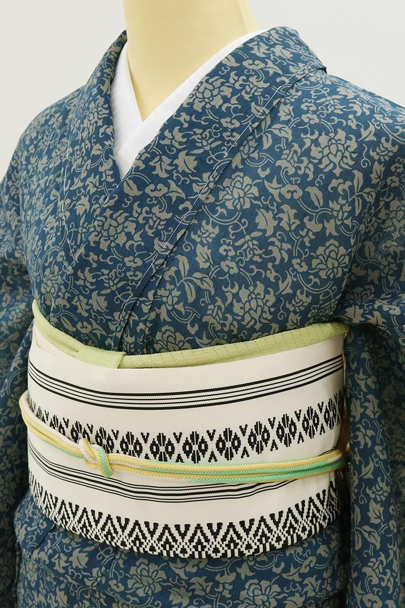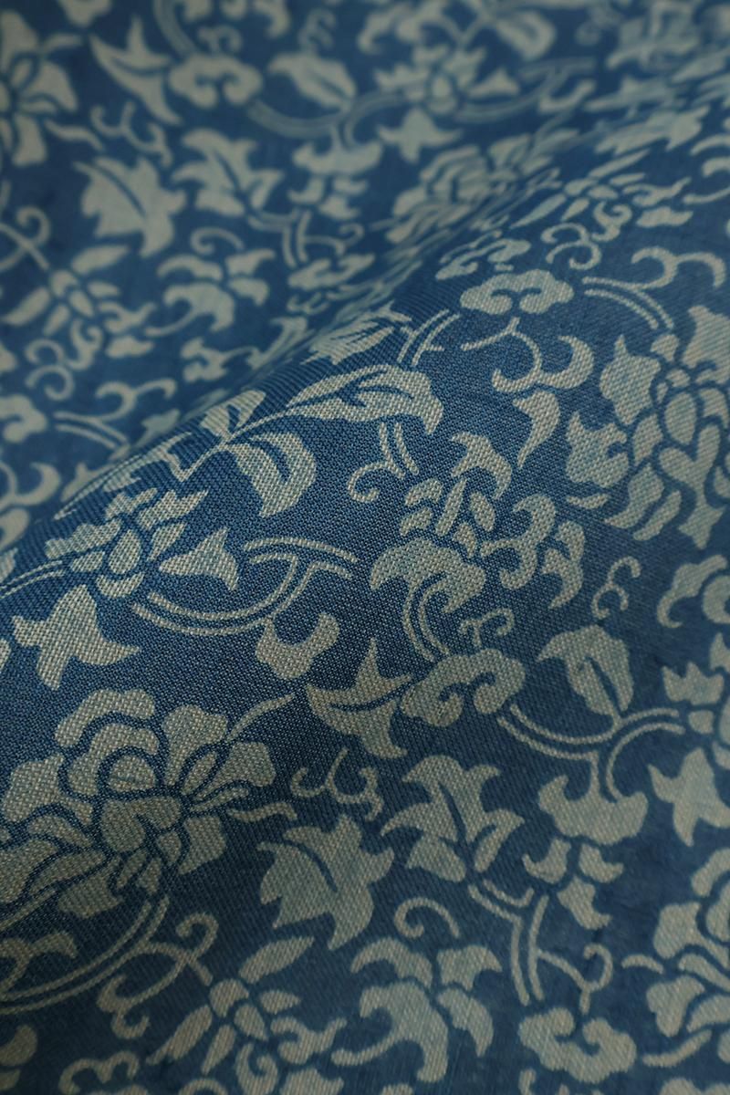 藍色が近いでしょうか、深い青色の夏紬地に、牡丹唐草文を染めた小紋です。