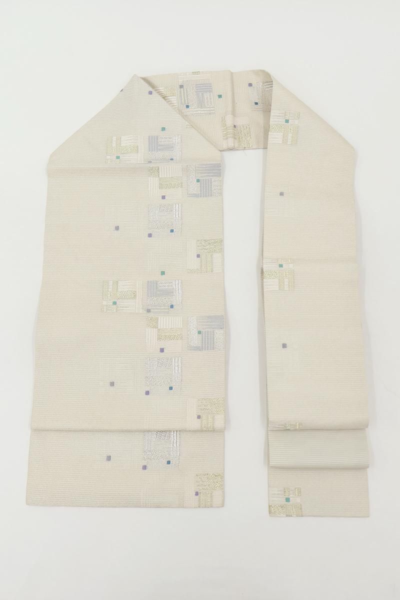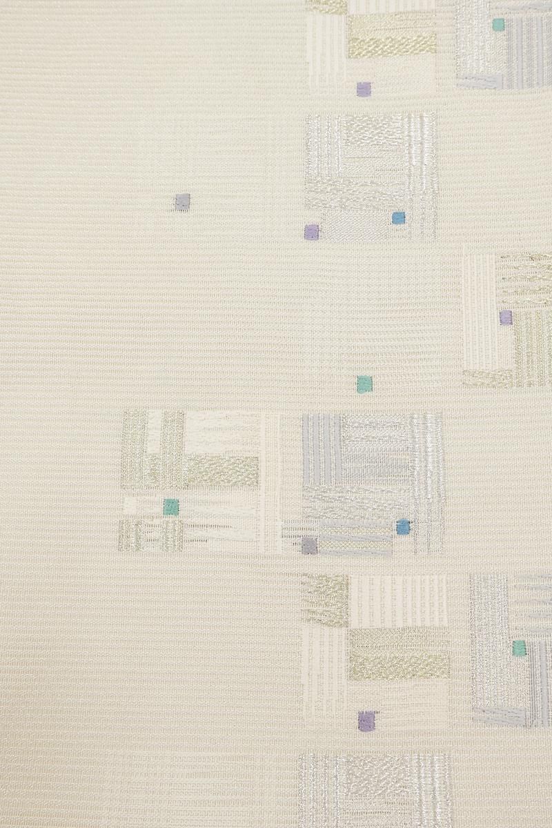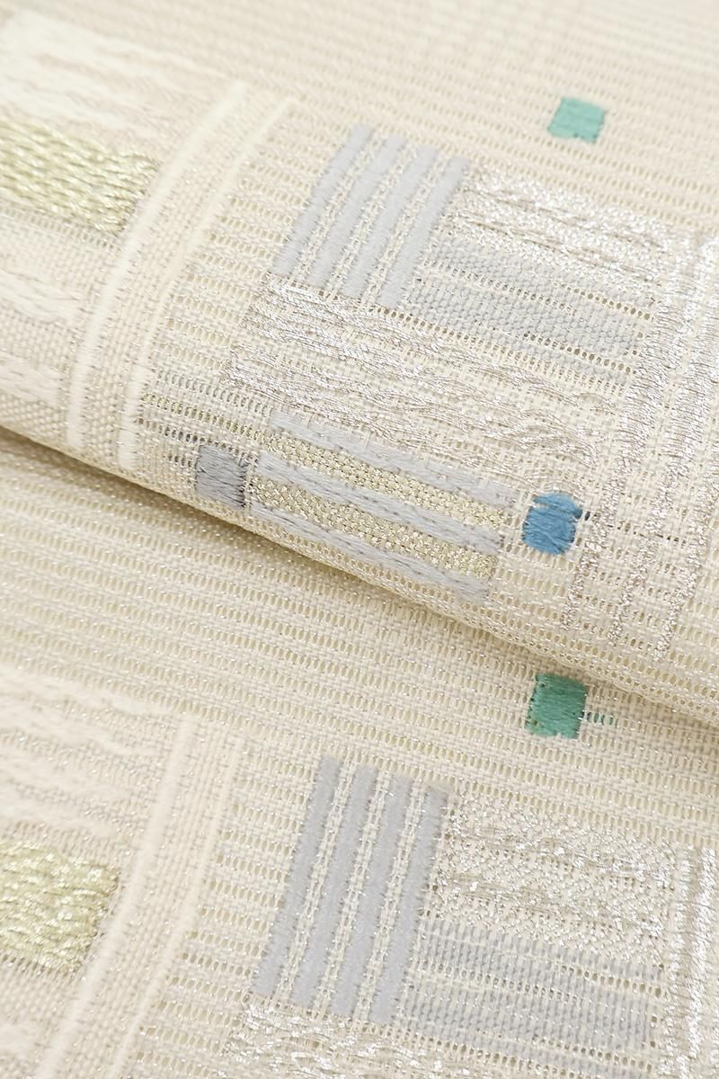 乳白色が近いでしょうか、銀糸を織り込んだアイボリー系の地に、幾何文を織り出した絽の名古屋帯です。細やかな銀糸が煌めく、さっくりとした透け感のある地風に、品良く置かれたモチーフがモダンな表情のお品、涼感溢れるシンプルな色柄がすっきりとした着姿を演出してくれそうですね。格高の小紋や色無地などに合わせて、爽やかな装いをお楽しみくださいませ。