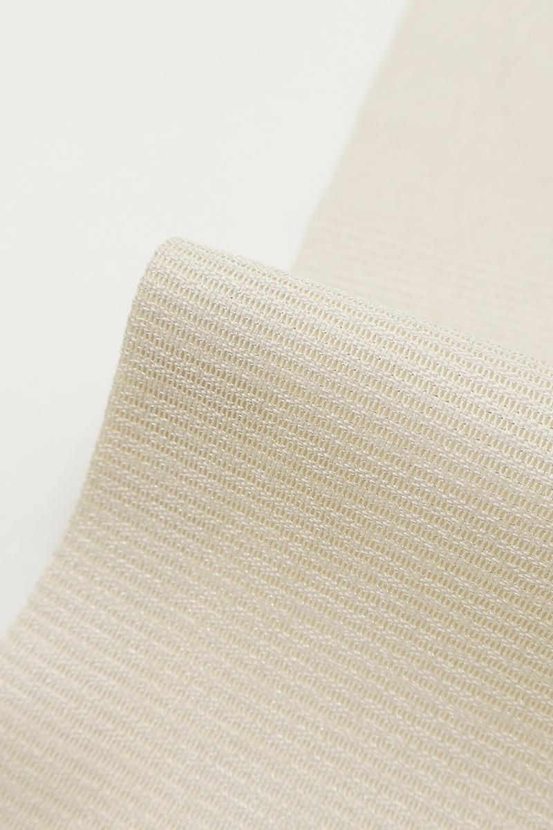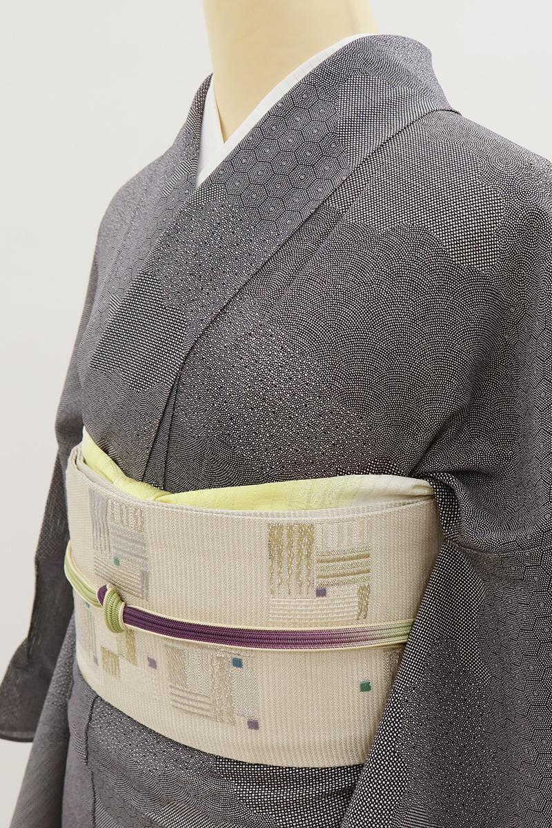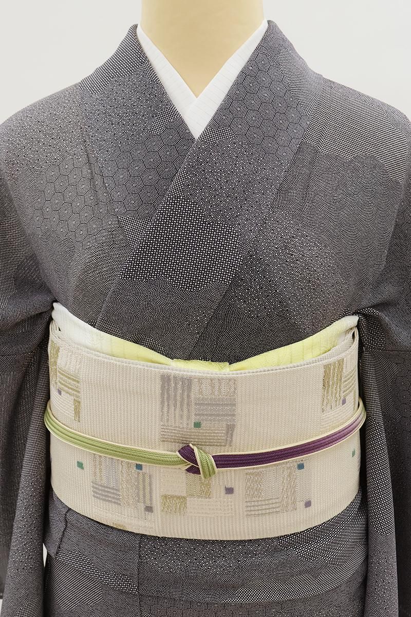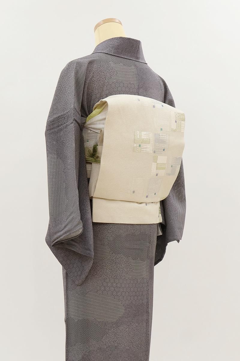 乳白色が近いでしょうか、銀糸を織り込んだアイボリー系の地に、幾何文を織り出した絽の名古屋帯です。細やかな銀糸が煌めく、さっくりとした透け感のある地風に、品良く置かれたモチーフがモダンな表情のお品、涼感溢れるシンプルな色柄がすっきりとした着姿を演出してくれそうですね。格高の小紋や色無地などに合わせて、爽やかな装いをお楽しみくださいませ。
