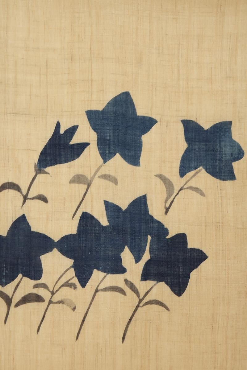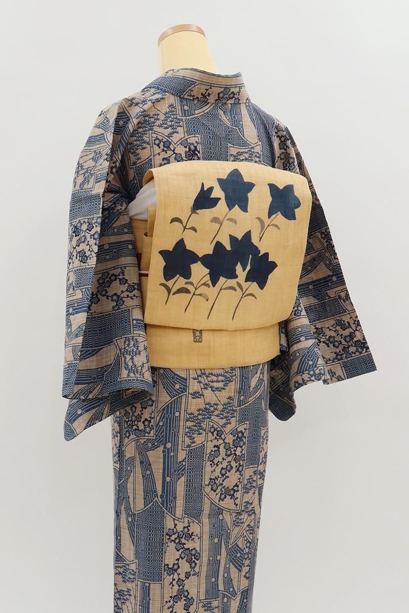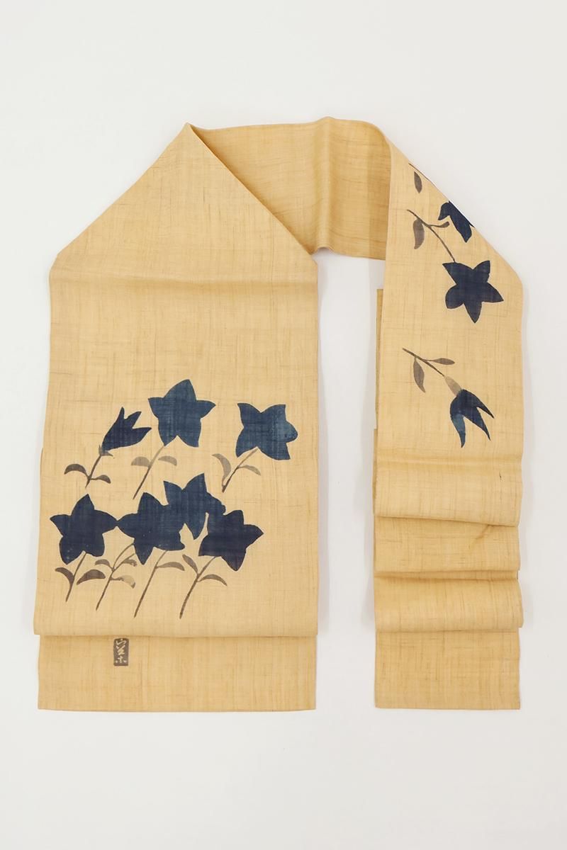 優しい中間色を生かした軽やかな意匠で独自の世界をつくる臈纈染め作家・故 高久空木さんの染名古屋帯です。こちらは桑色が近いでしょうか、こっくりとしたベージュの麻地に、風に揺れる桔梗の花が描かれたお品、削ぎ落とした末の飄々としておおらかな構図が装いに独特の洗練を添え、後ろ姿を印象的に引き立ててくれることと思います。一見控えめながら着物に合わせればはっとするような存在感を見せる空木さんの帯、夏紬や上布、絽や紗の小紋などに合わせて、風情豊かな装いをいかがでしょうか。