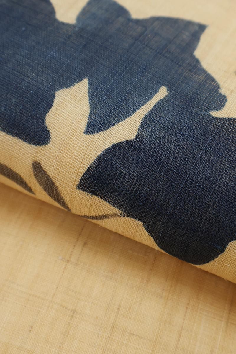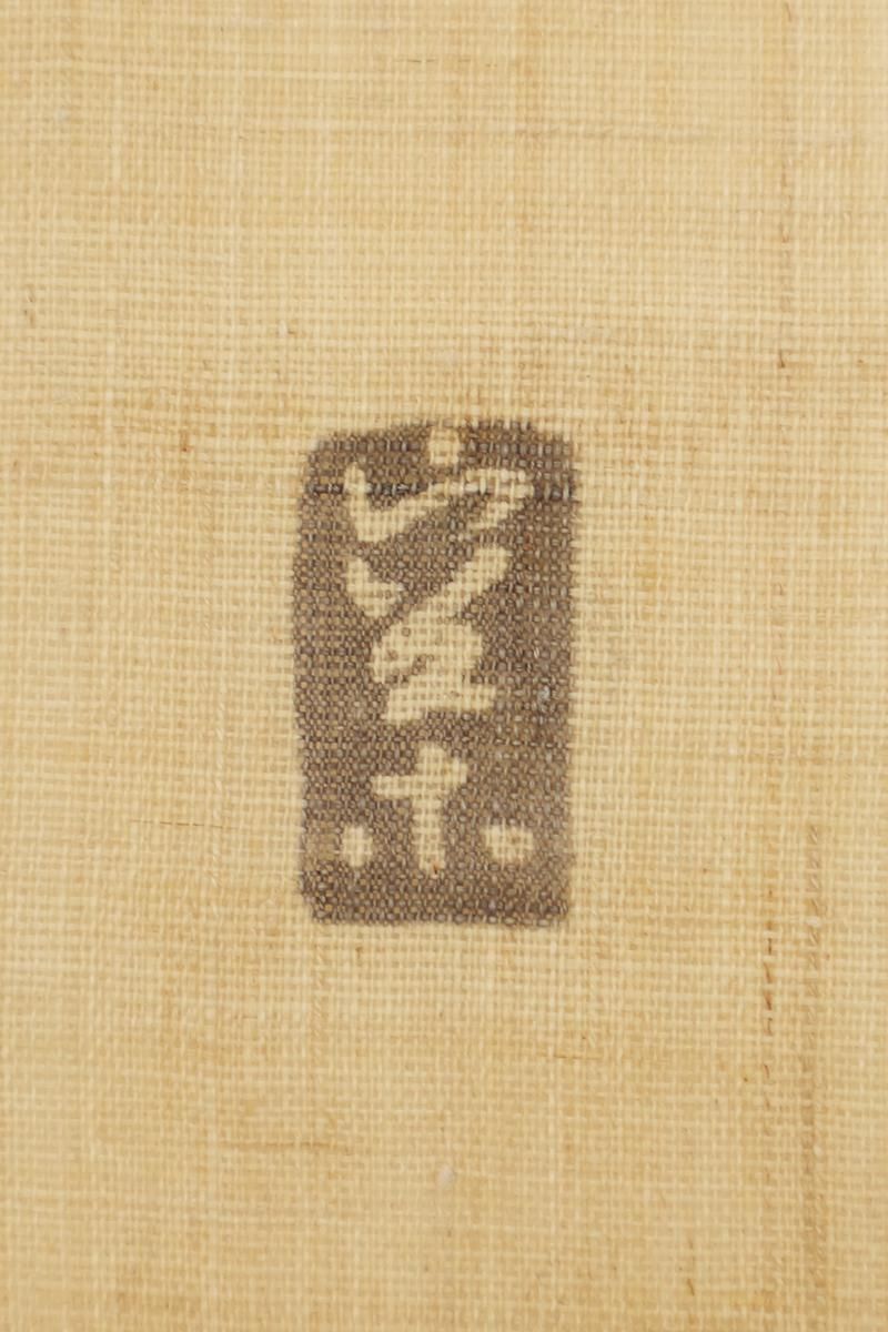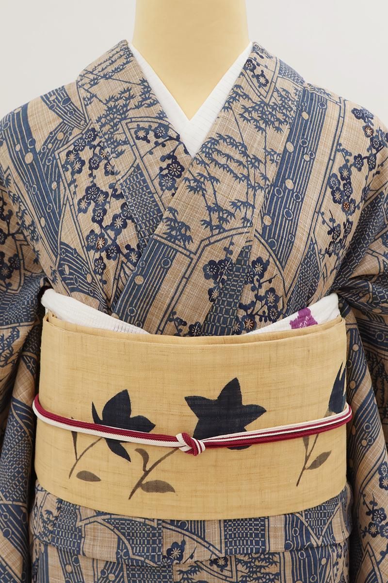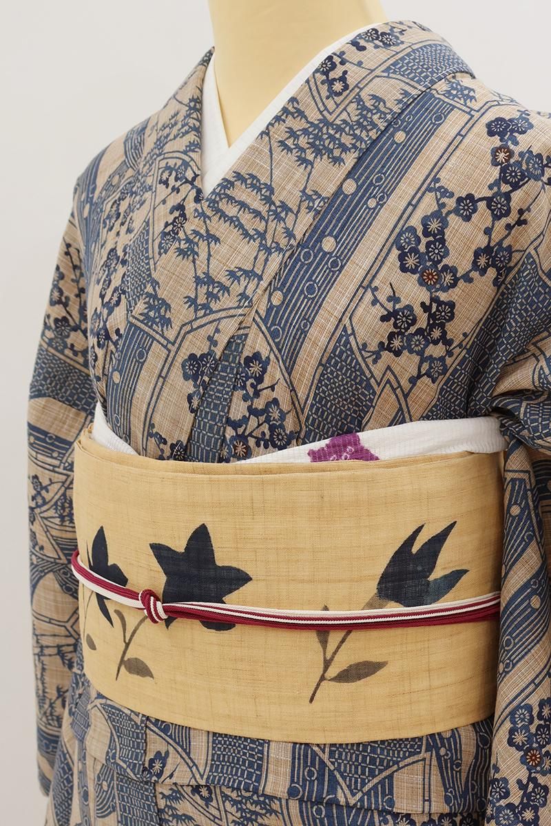 優しい中間色を生かした軽やかな意匠で独自の世界をつくる臈纈染め作家・故 高久空木さんの染名古屋帯です。こちらは桑色が近いでしょうか、こっくりとしたベージュの麻地に、風に揺れる桔梗の花が描かれたお品、削ぎ落とした末の飄々としておおらかな構図が装いに独特の洗練を添え、後ろ姿を印象的に引き立ててくれることと思います。一見控えめながら着物に合わせればはっとするような存在感を見せる空木さんの帯、夏紬や上布、絽や紗の小紋などに合わせて、風情豊かな装いをいかがでしょうか。