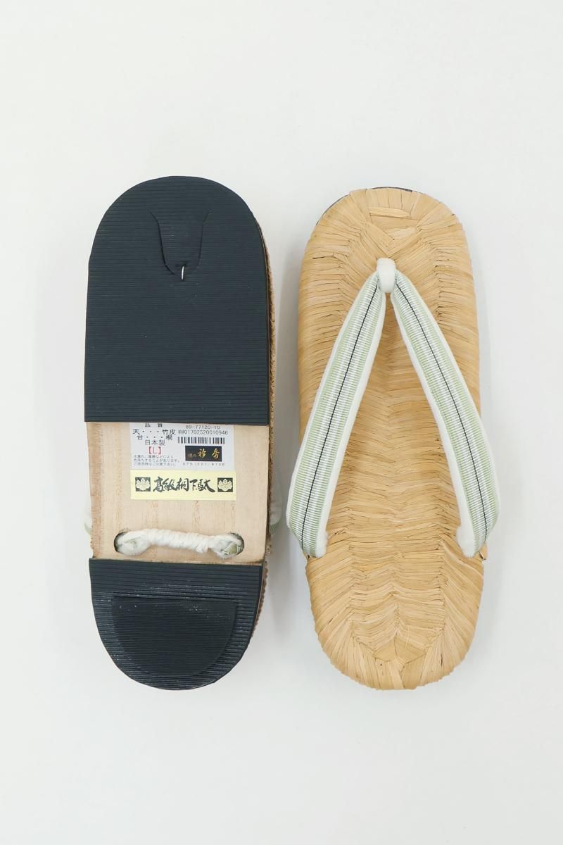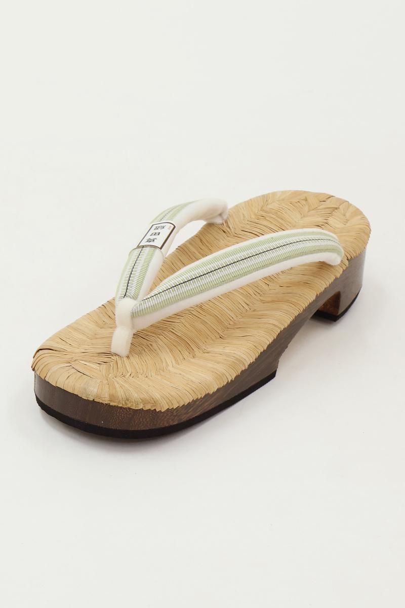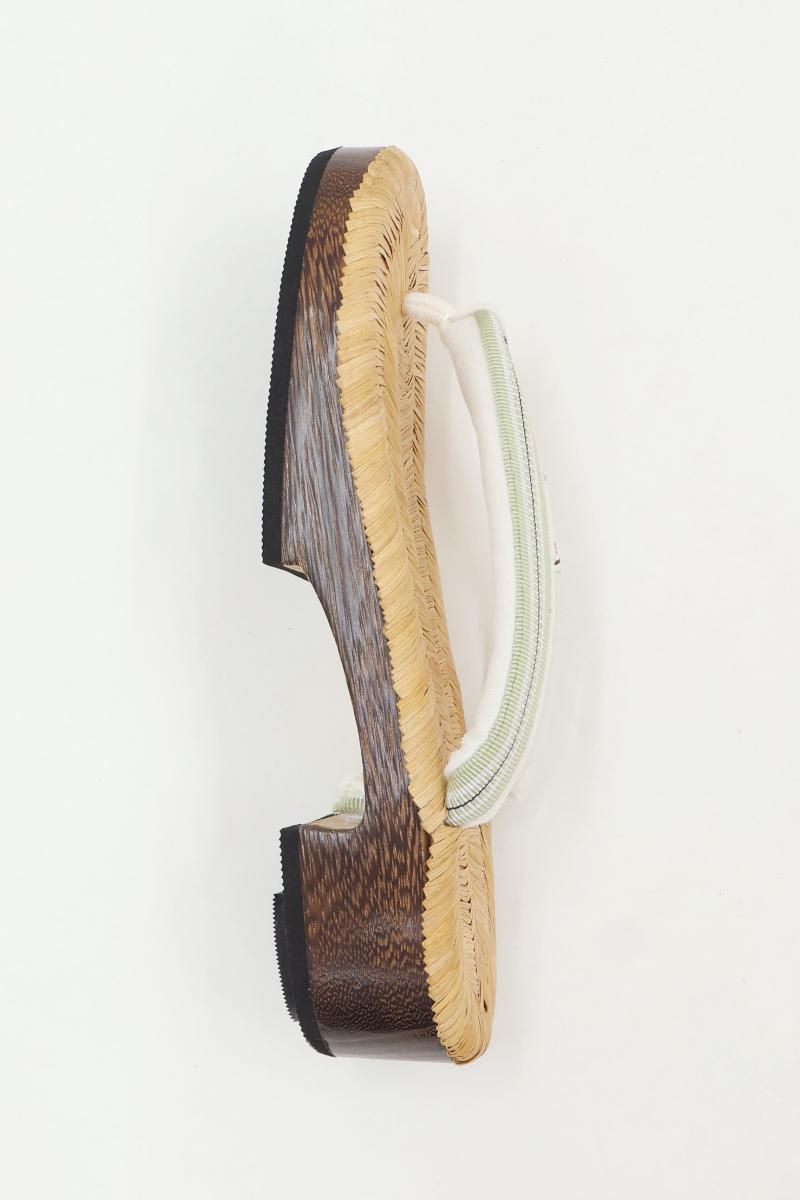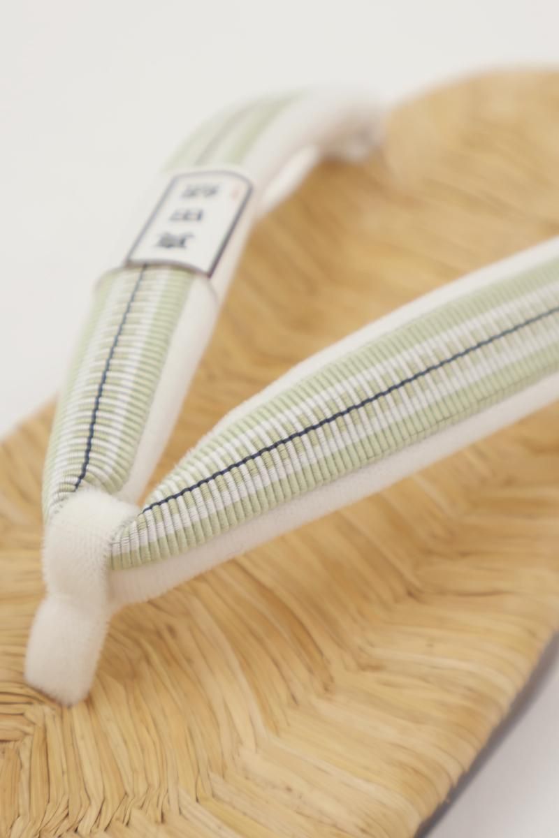 着物まわりの小物を幅広く手がける老舗として定評ある京都・衿秀さんから、畳表の台の下駄のご紹介です。こちらは桐の巻に畳表の台を合わせたお品、鼻緒は薄緑色に黒色を効かせた真田紐、優しい表情で様々な装いに寄り添ってくれることと思います。巾広の鼻緒は足に馴染みやすく、優しい足あたりで、底がゴムなので長時間履いても疲れにくいのが嬉しいですね。季節を問わず気軽なお出かけに重宝することお思います。この機会にぜひお手にとってご覧下さいませ。