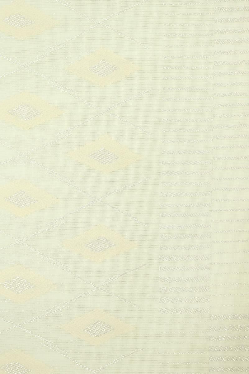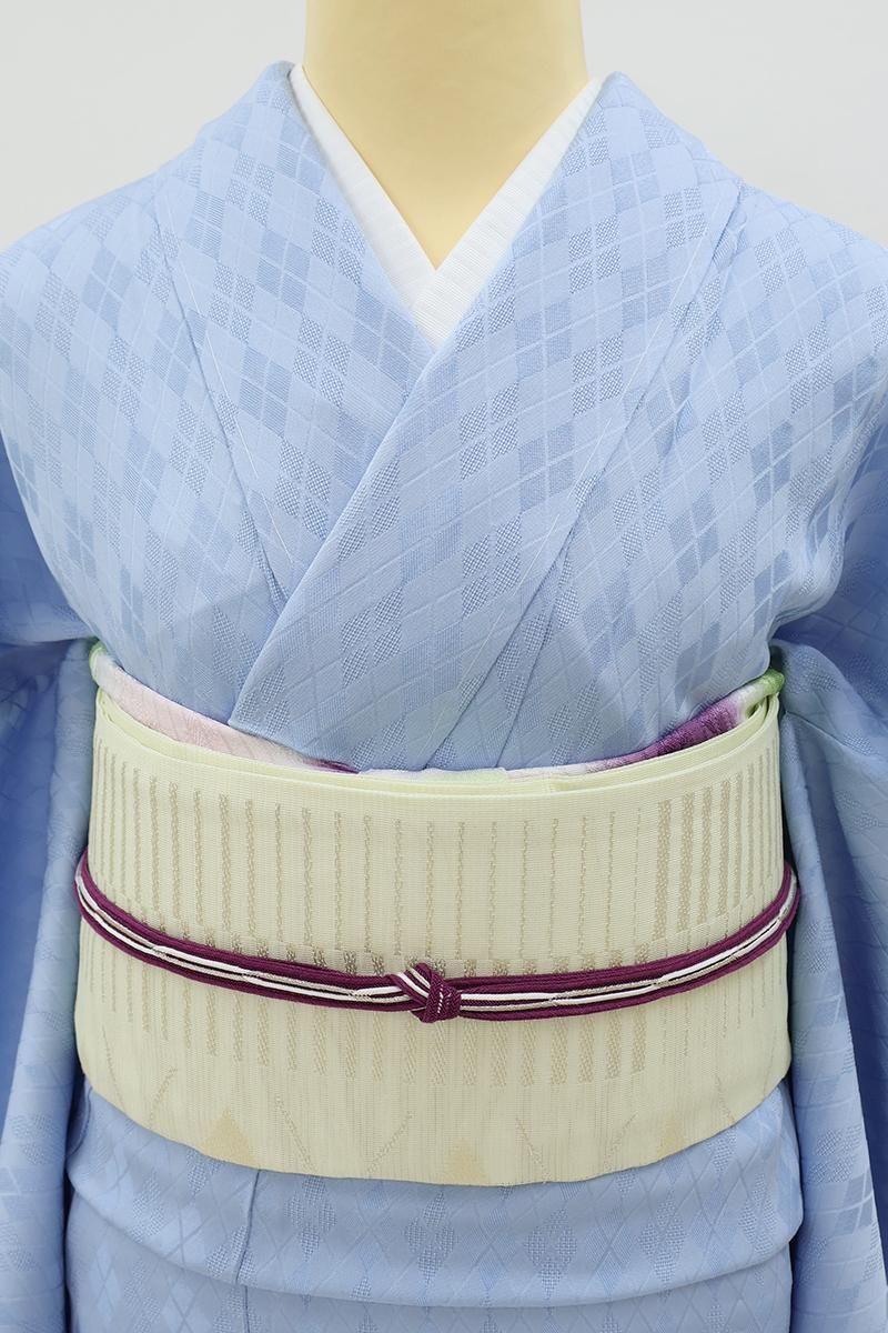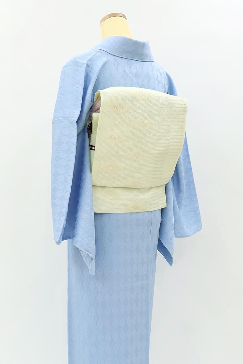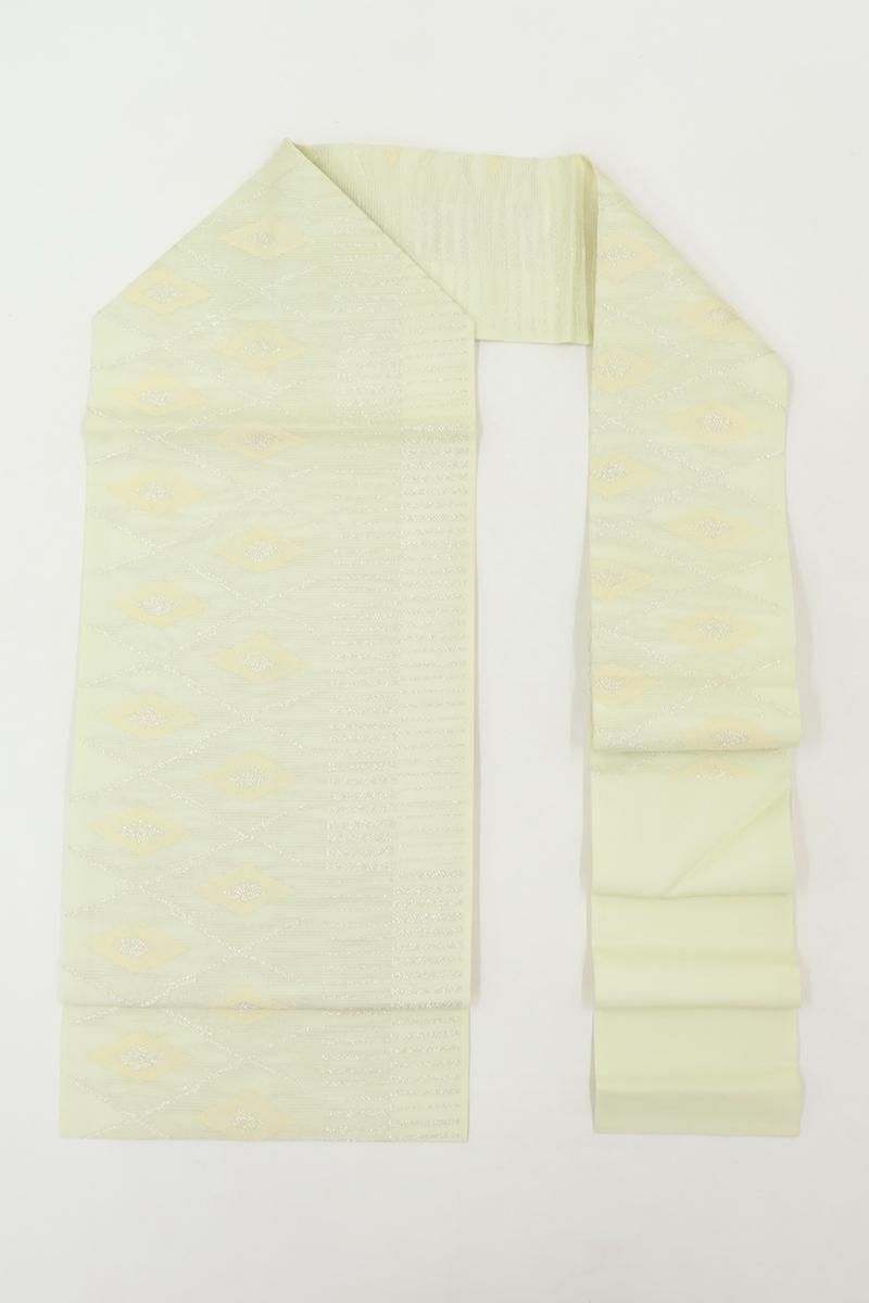 色を薄めたねこやなぎ色が近いでしょうか、ごく淡い黄緑色の地に、幾何文を織り出した絽の名古屋帯です。こちらは透け感ゆたかなしゃりっとした地風と清々しいお色目が端正で涼やかな表情のお品、銀糸のきらめきが一層の気品を添えますね。楚々とした印象でどなたからも好感度の高い装いをお楽しみいただけることと思います。小紋から色無地、軽い付下げなどに合わせてちょっとしたパーティやお食事会などにいかがでしょうか。