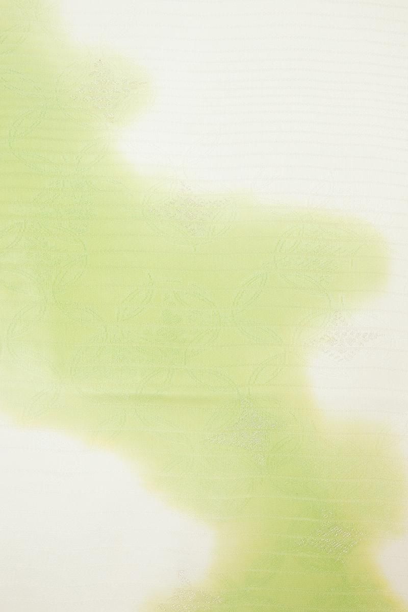 こちらは銀糸を用いた繊細な織りで七宝を配した絽地に優美なお色目で霞暈しを染めたお品。胸元からちらりと覗く煌めきと美しい淡彩が、装いに一層の格調を添えてくれますね。こちらは白色をベースに、灰みの薄緑色がアクセントとなる一枚。程よく落ち着いた爽やかな彩りが、装いを上品にまとめてくれることと思います。改まったお席の装いにいかがでしょうか。