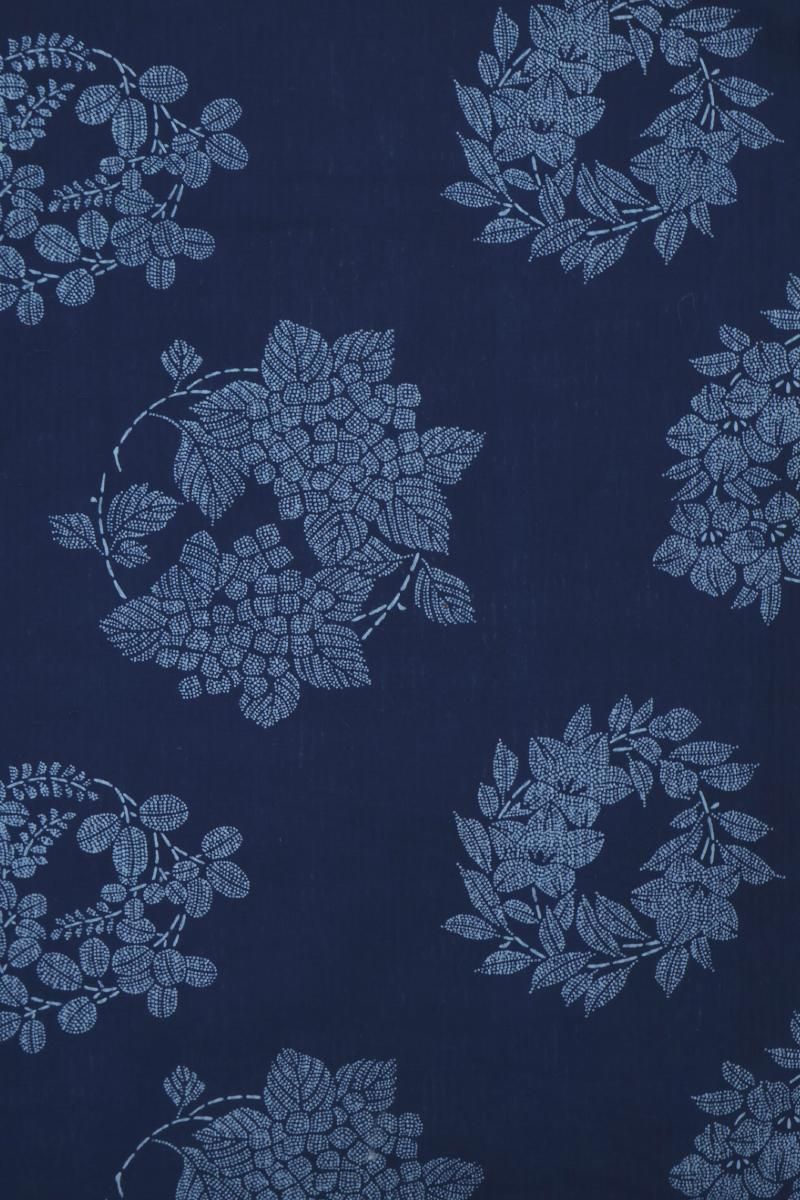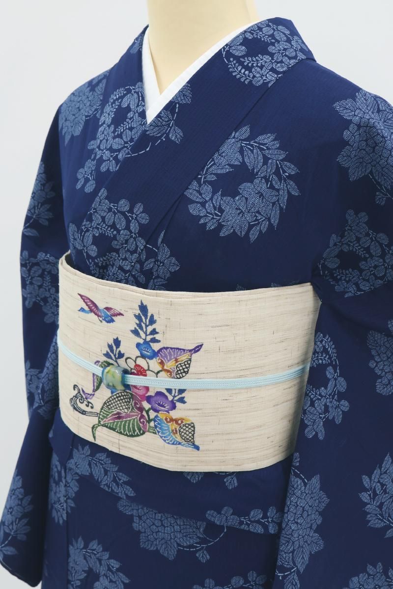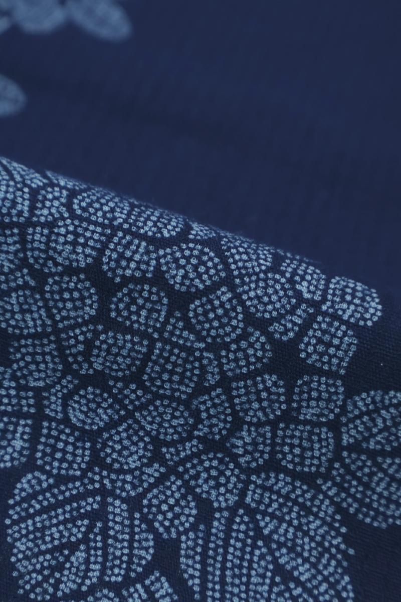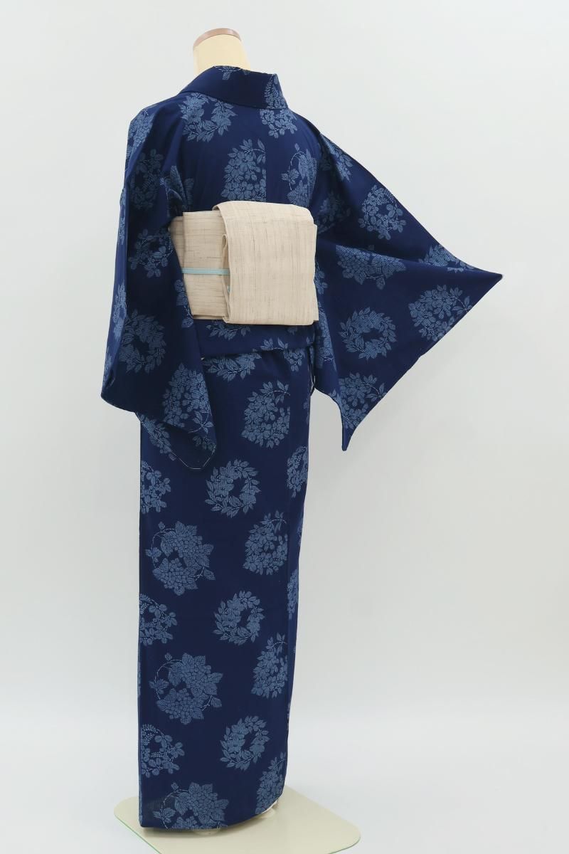 こちらは紺色が近いでしょうか、ほのかな透け感のある深い青色の木綿地に花の丸を染めたお品、大人の愛らしさ薫るモチーフが浴衣らしい凜とした華やぎを見せていますね。半幅帯やカジュアルな八寸帯などを合わせて、この夏のお出かけにいかがでしょうか。