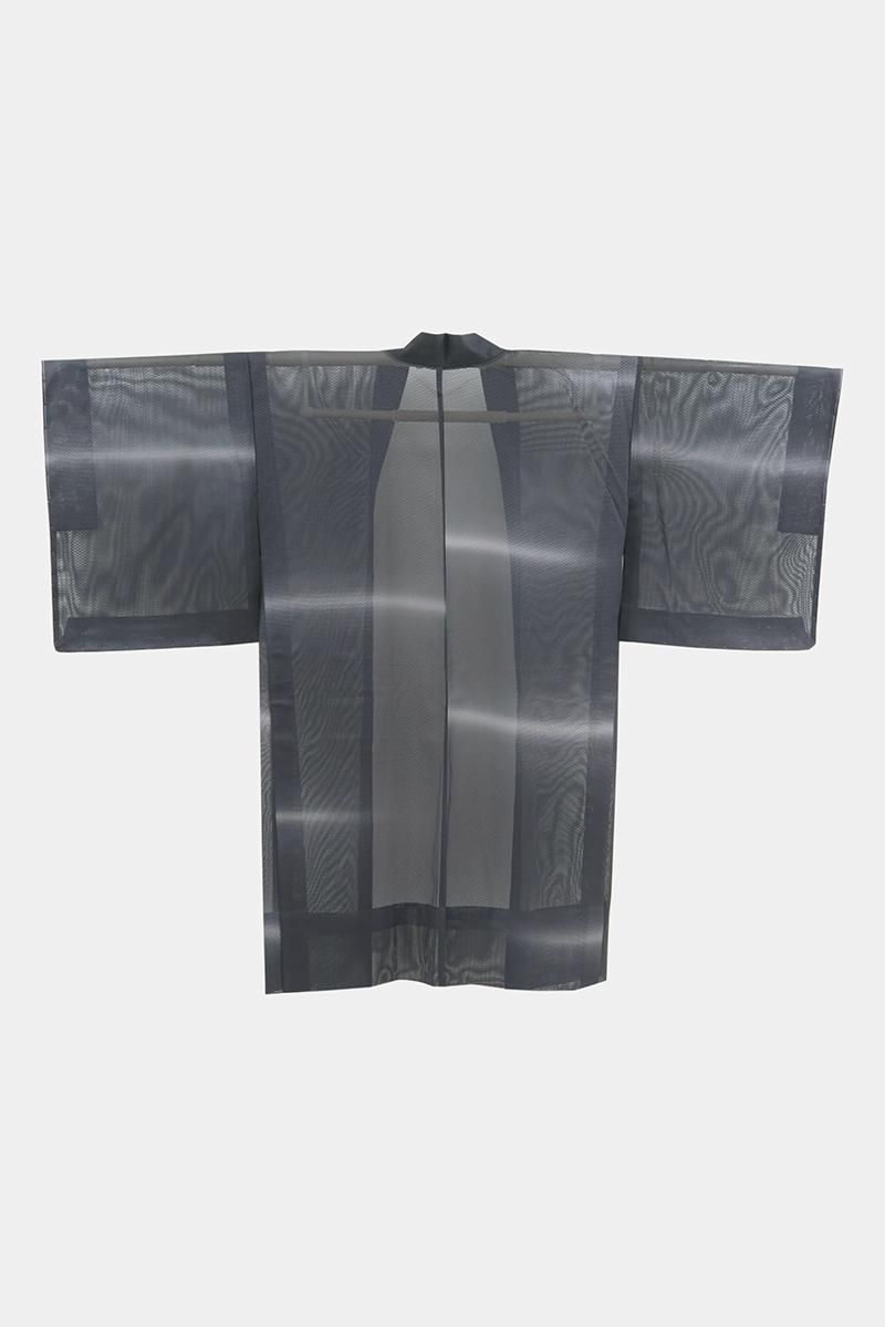 青みの深いグレーの地にほっそりとした横段暈しを染めた紋紗の羽織です。