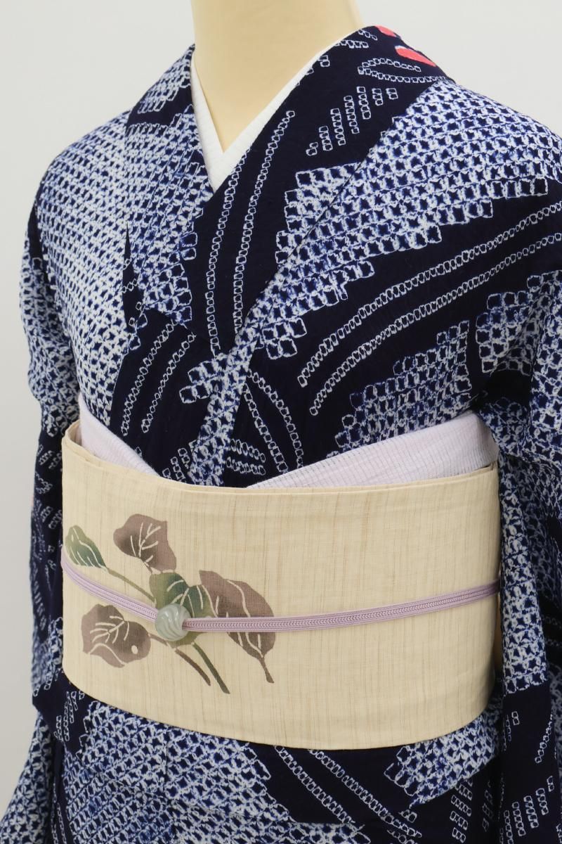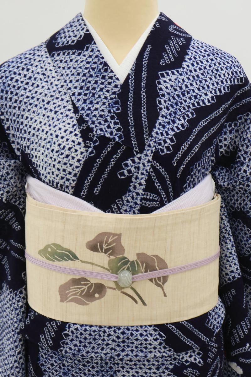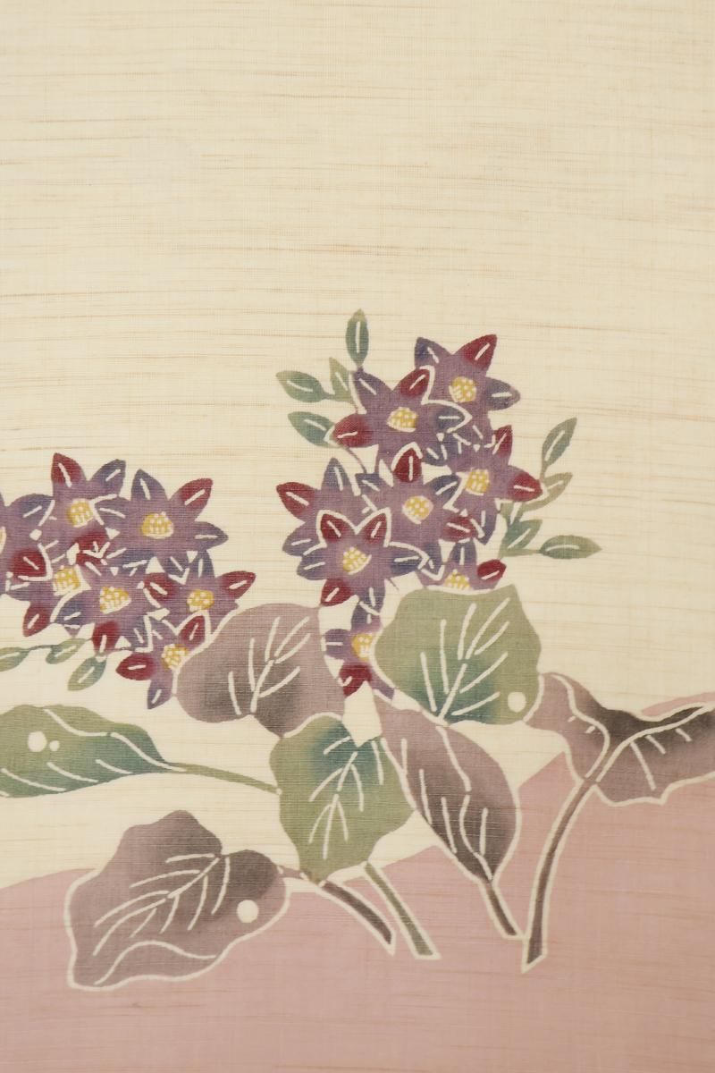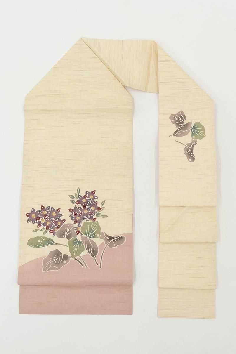 麻独特のさっくりとした野趣ある風合いに、可憐な花の姿を女性らしい彩りで表したお品、浴衣から夏紬、小紋などの装いに品良い甘さを添えて風情豊かに引き立ててくれることと思います。お友達との気軽なお出かけなどにいかがでしょうか。