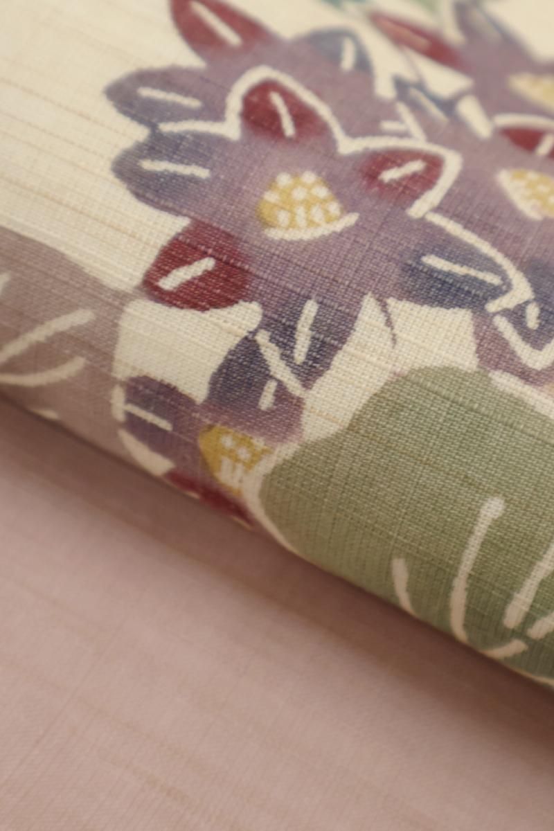 鳥の子色が近いでしょうか、ナチュラルな明るいベージュの地を灰みのピンクで場を分け、花の図を型染で配した名古屋帯です。