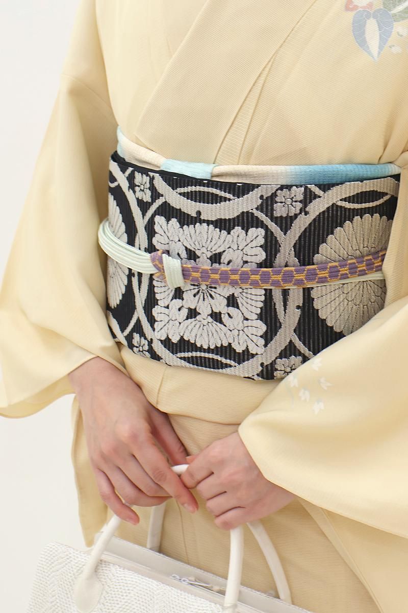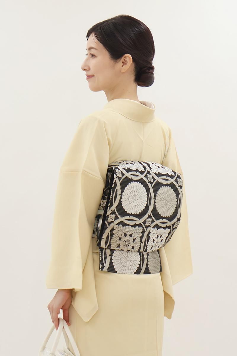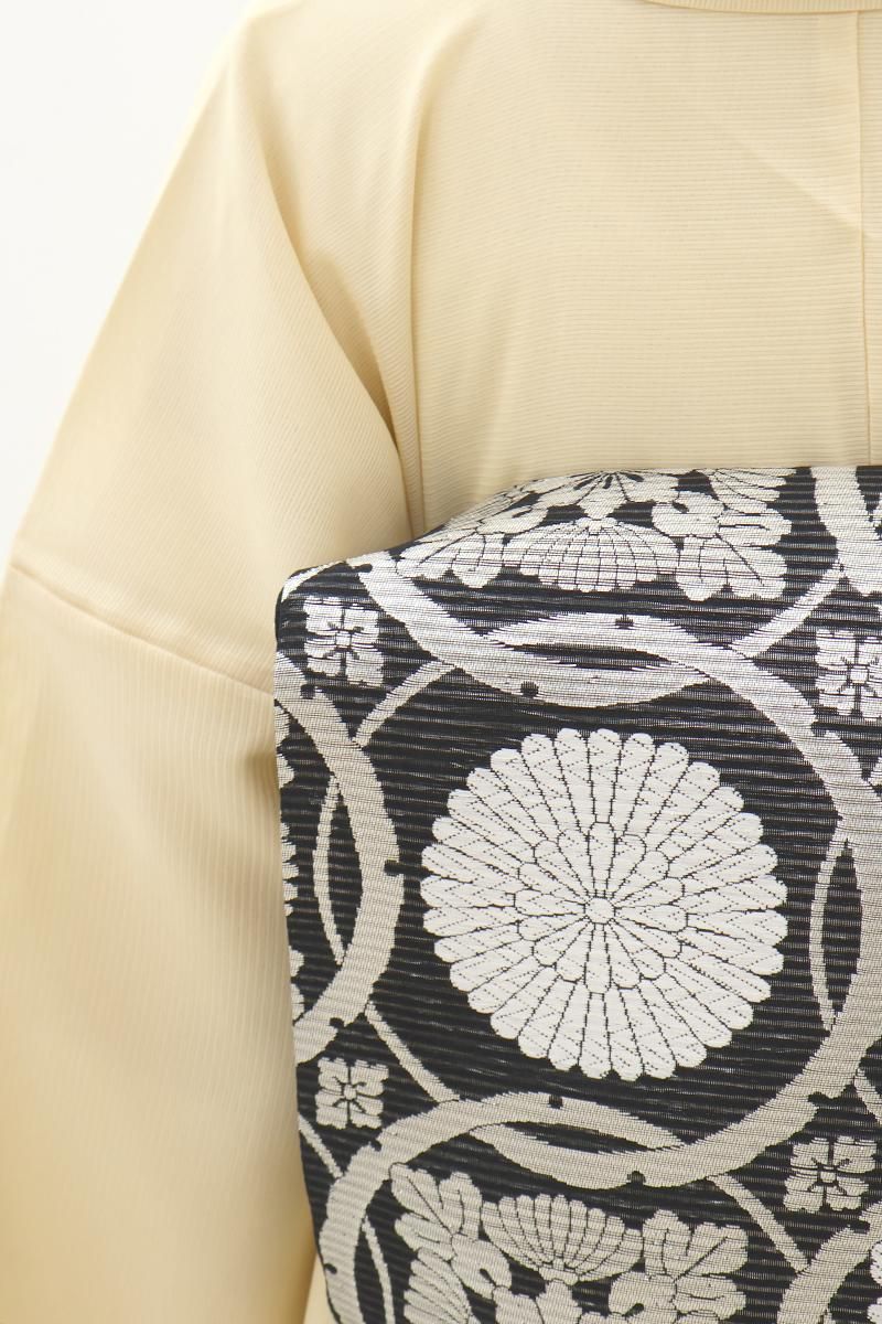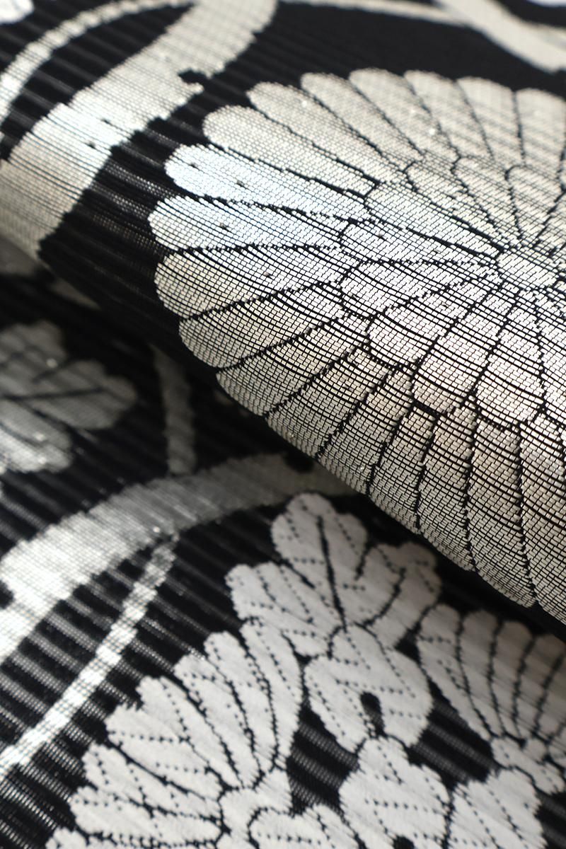 こちらはさっくりと軽やかな黒色の地に、たっぷりの銀糸と淡いグレーの糸で菊華雪輪繋ぎ文を織り出したお品、きりりとモダンなお色目がフォーマルの装いを格調高く、涼しげな表情でまとめ上げてくれそうですね。夏姿を品良く引き立てる一本、夏のパーティや改まったお席の装いにいかがでしょうか。