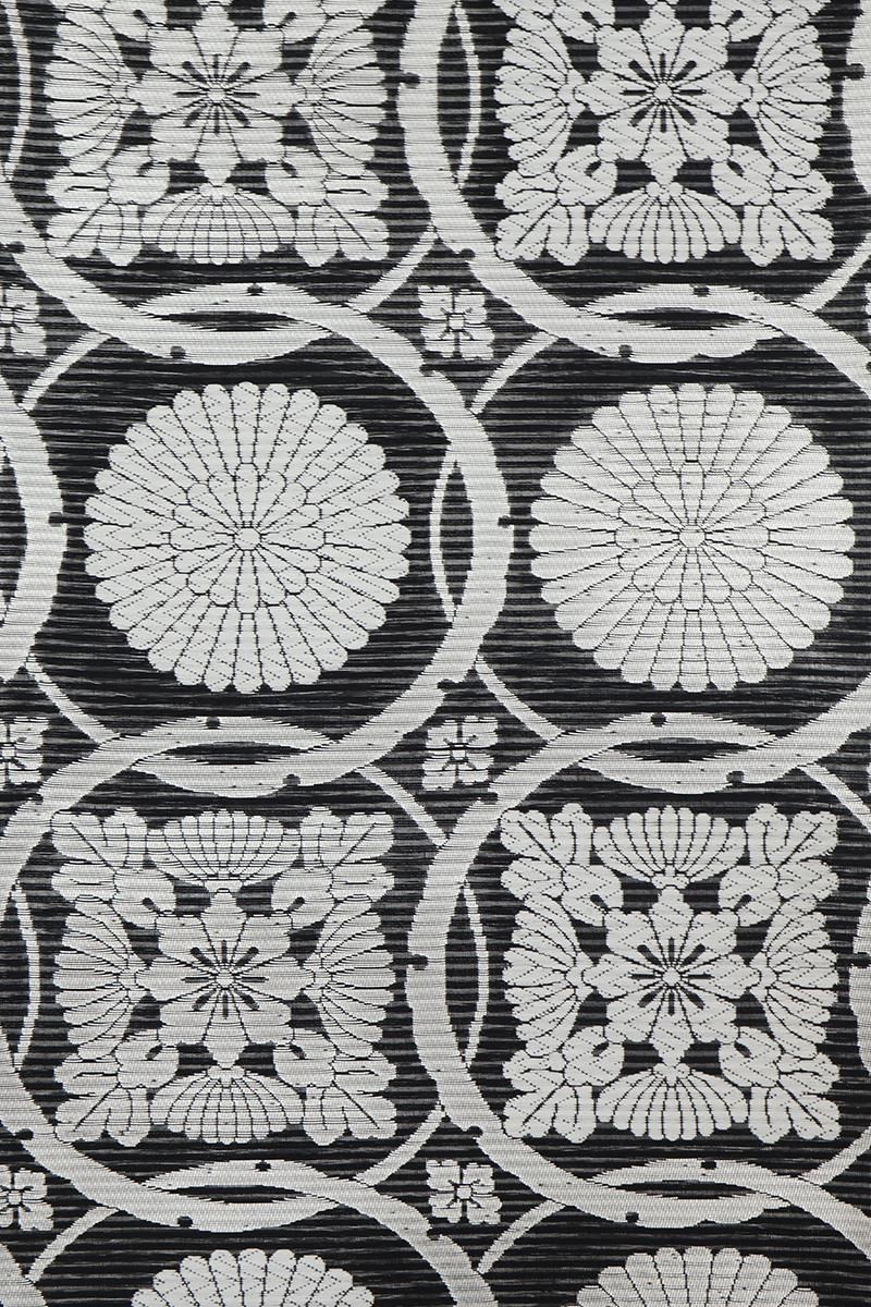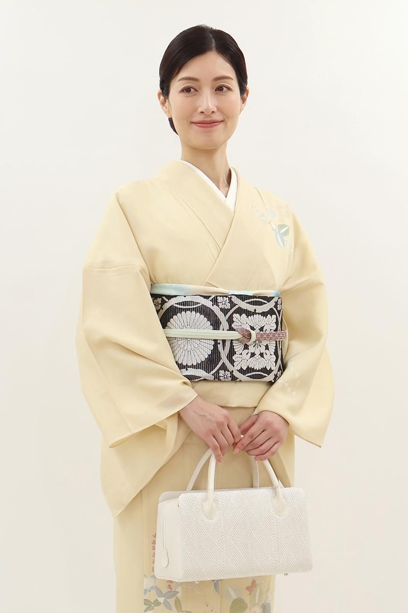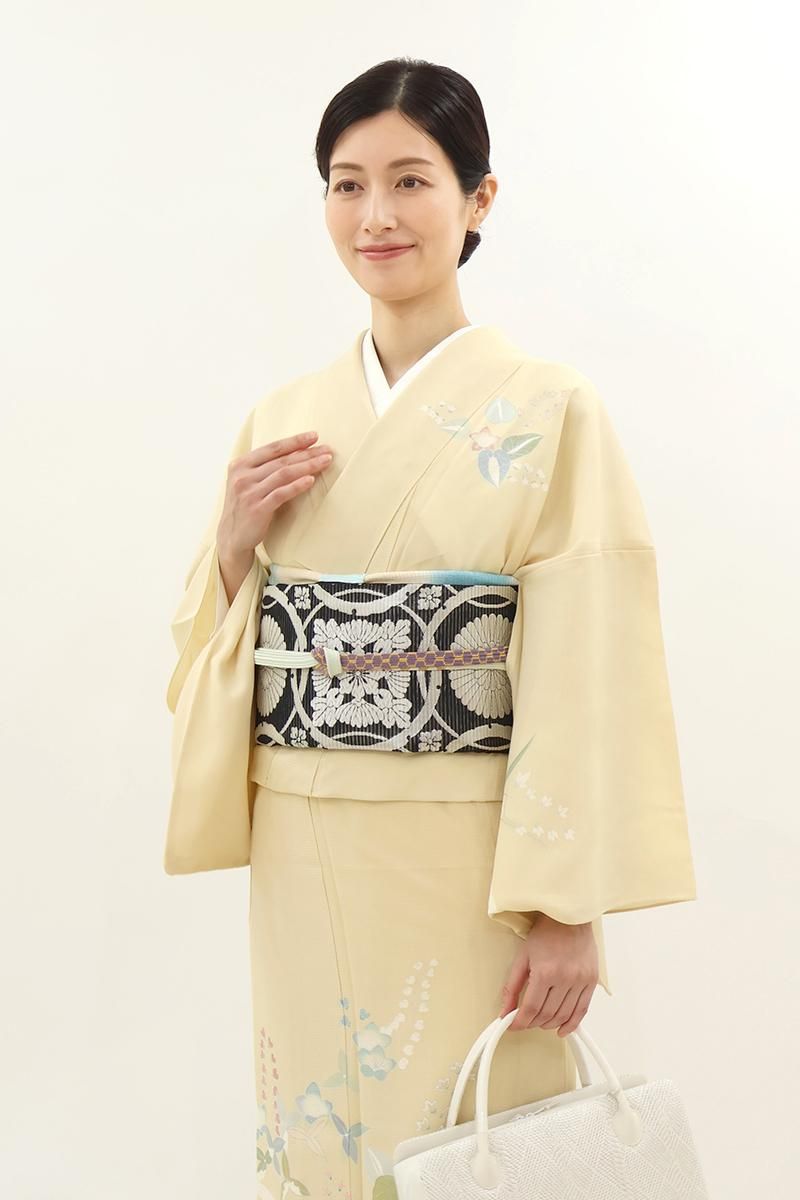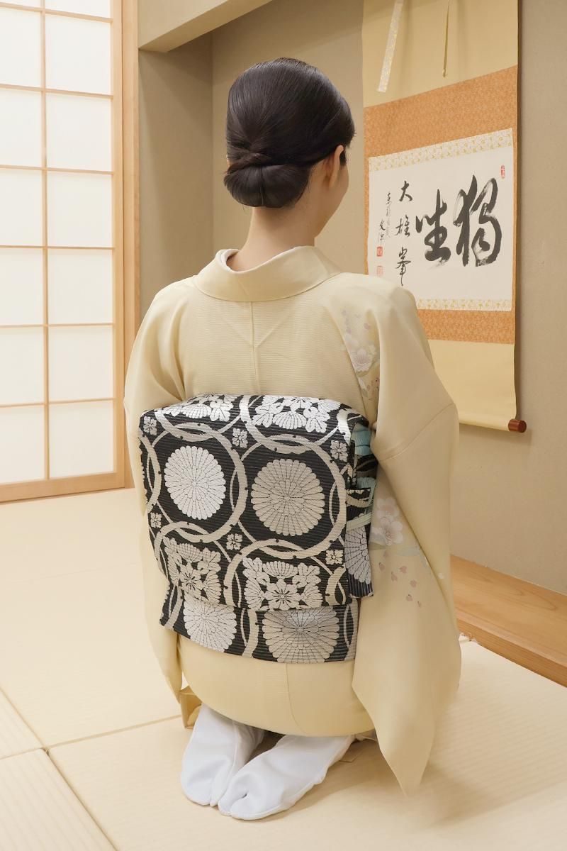 こちらはさっくりと軽やかな黒色の地に、たっぷりの銀糸と淡いグレーの糸で菊華雪輪繋ぎ文を織り出したお品、きりりとモダンなお色目がフォーマルの装いを格調高く、涼しげな表情でまとめ上げてくれそうですね。夏姿を品良く引き立てる一本、夏のパーティや改まったお席の装いにいかがでしょうか。