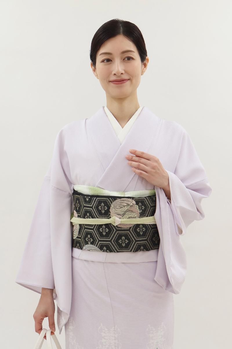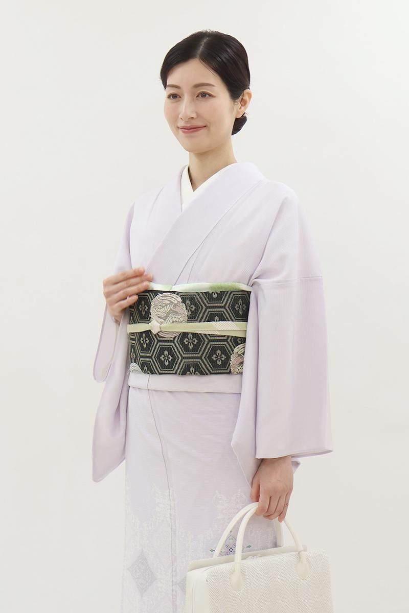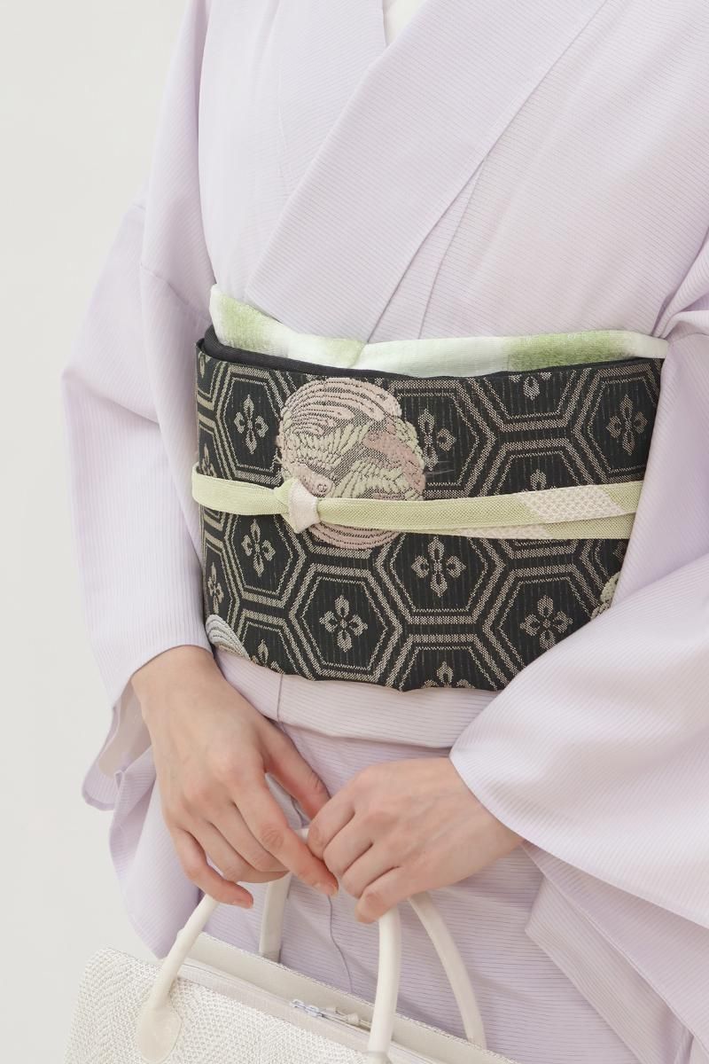 しゃりっとした地風のシックなお色目に、ふわりと優しいパステルカラーでふっくらと表現された意匠が上品な華やぎを見せるお品、黒色の帯は様々なお着物に合わせやすく、凜とした着姿をお楽しみいただけそうですね。色無地や付下げ、訪問着などに合わせて夏の改まったお出かけやお祝いのお席などにいかがでしょうか。