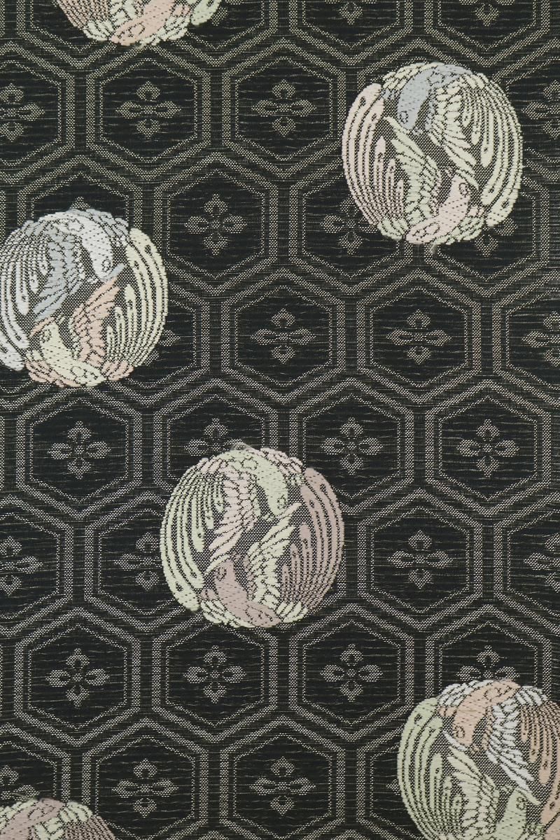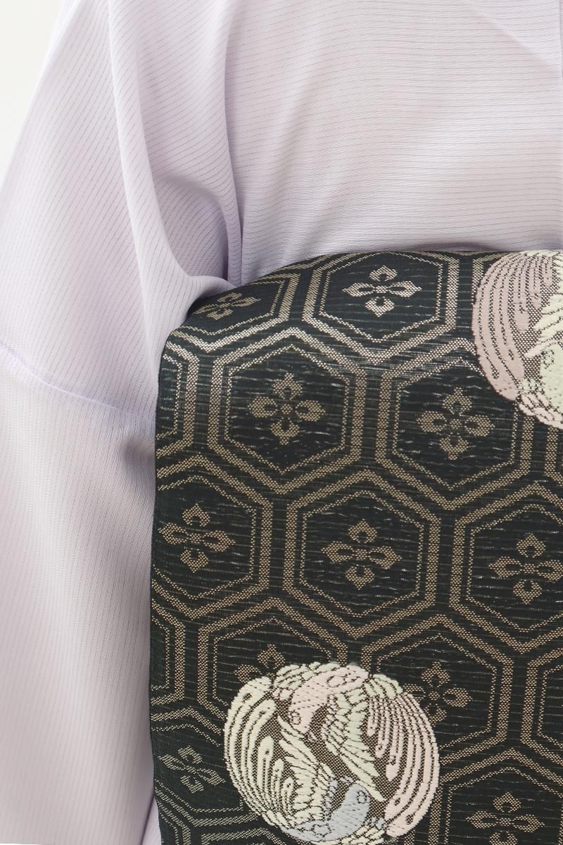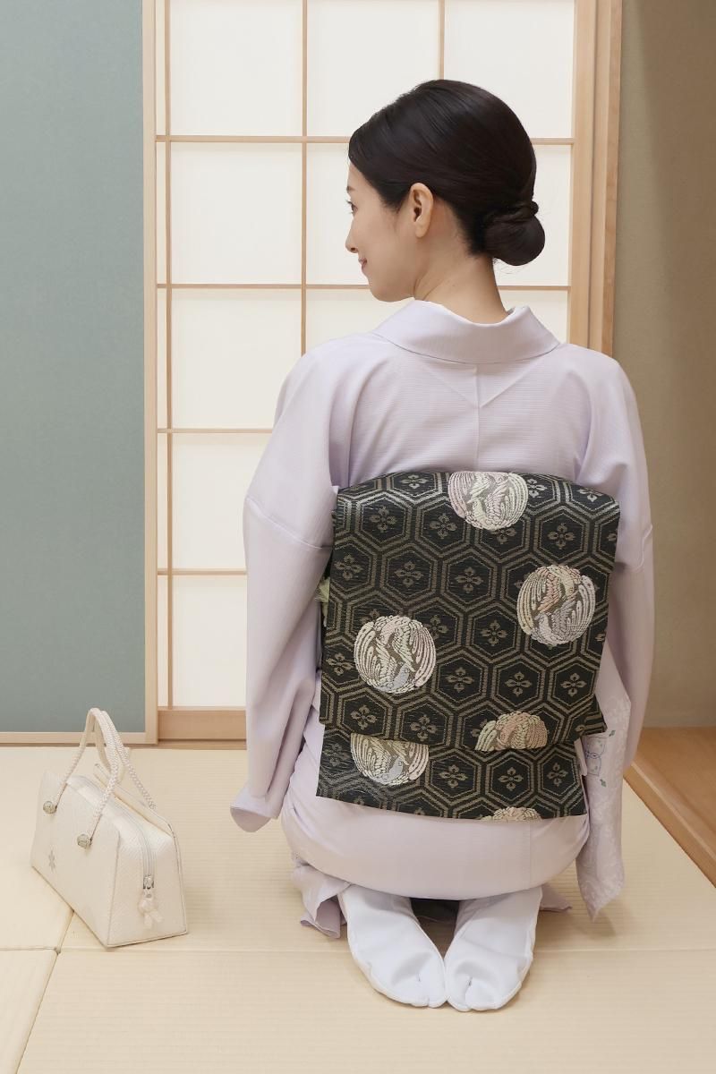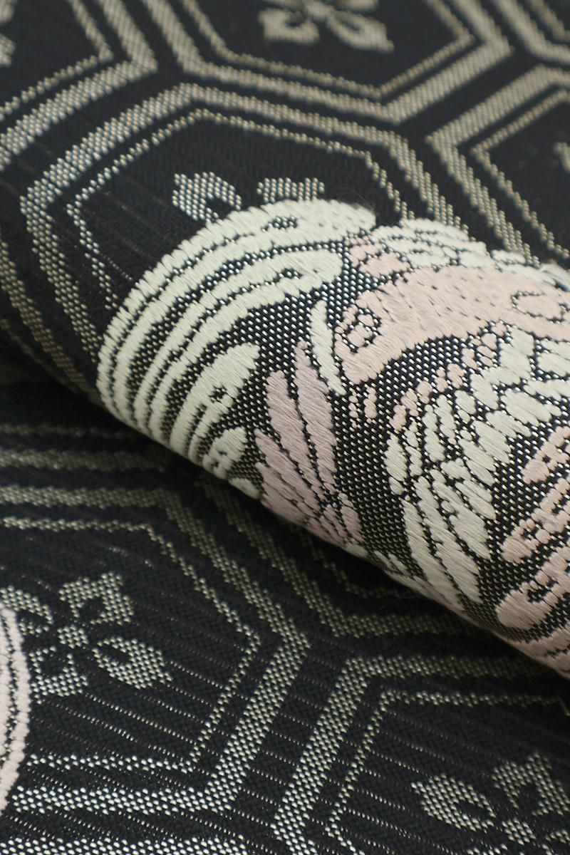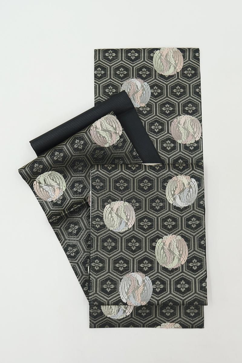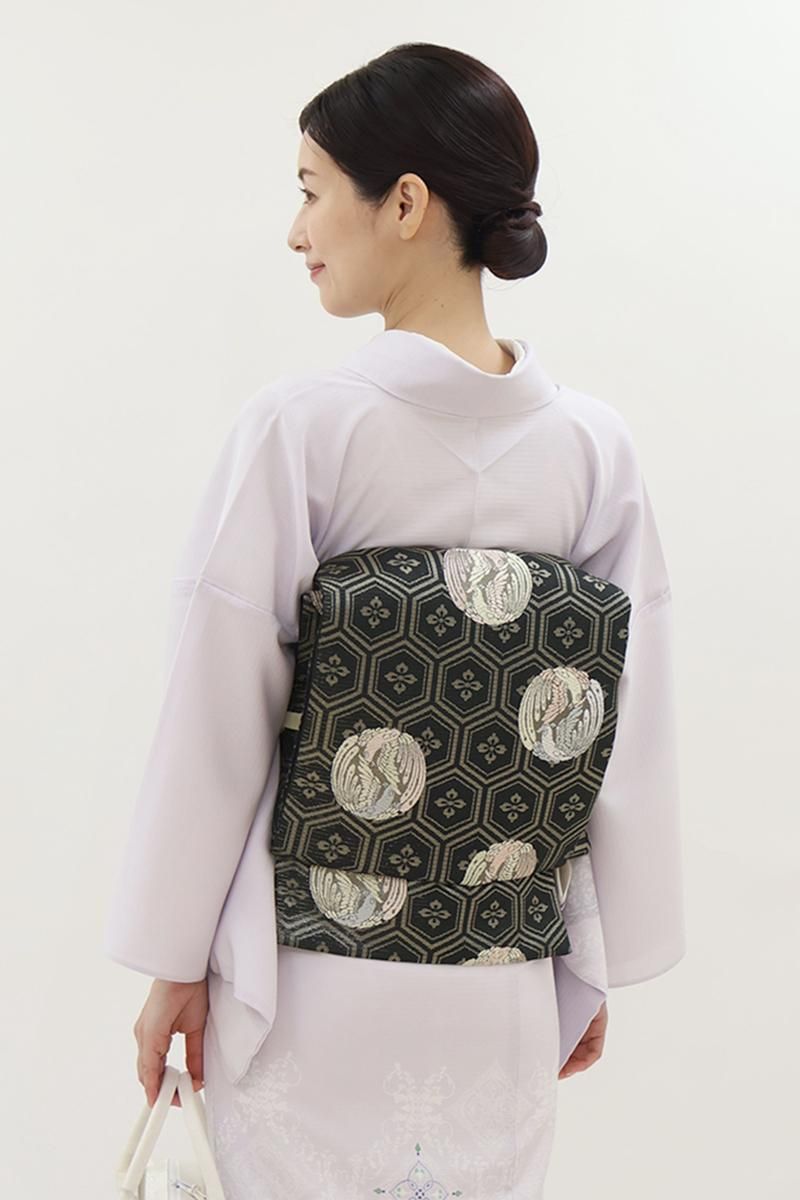 透け感豊かな黒色の地に、亀甲花菱を背景に向かい鳳凰文を織りだした絽の袋帯です。