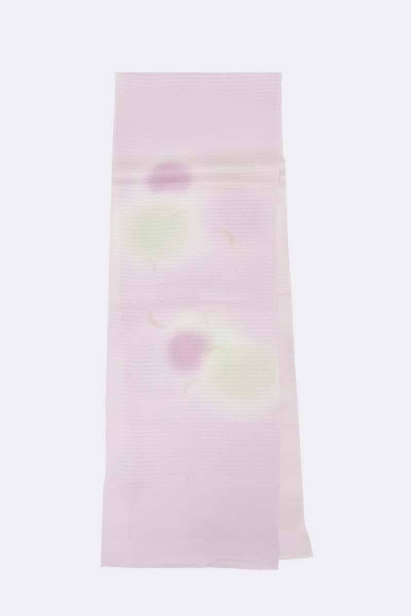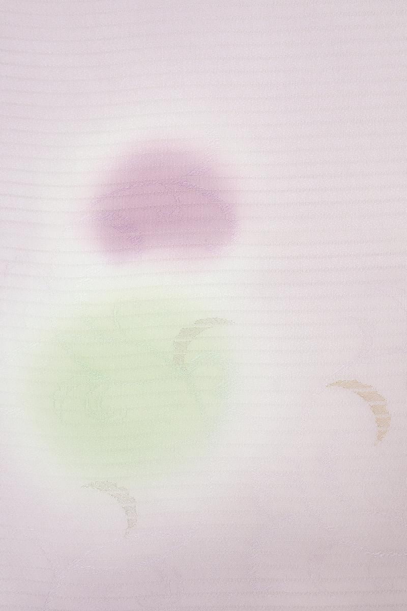 こちらは唐草文が織り出された淡い薄紫色の絽地に、ふんわりと暈かしを配したお品、清涼感あふれる彩りと控えめな金銀糸が程よいアクセントとなり、夏の装いにちらりと覗くさり気ないお洒落をお楽しみ頂けることと思います。夏のお出かけにはんなりとした涼やかな一枚をいかがでしょうか。