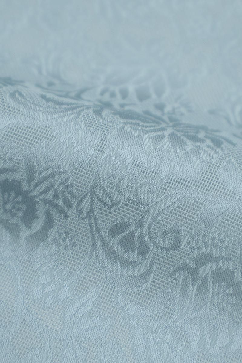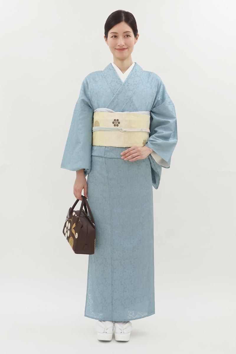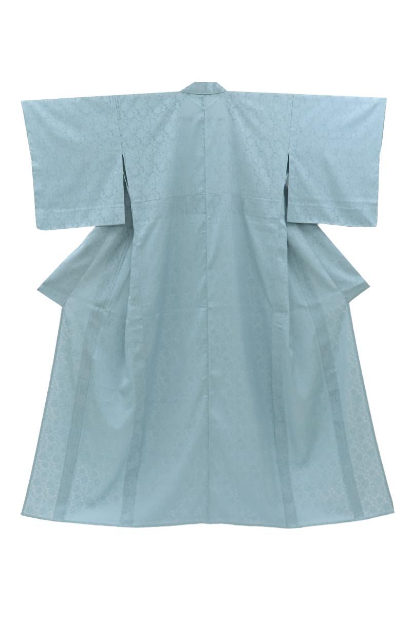 灰みの薄青色の地に花唐草の地紋の浮かぶ紋紗の色無地です。