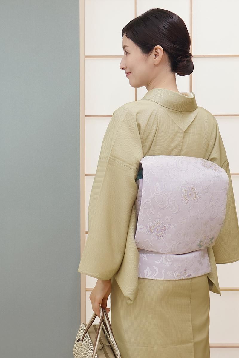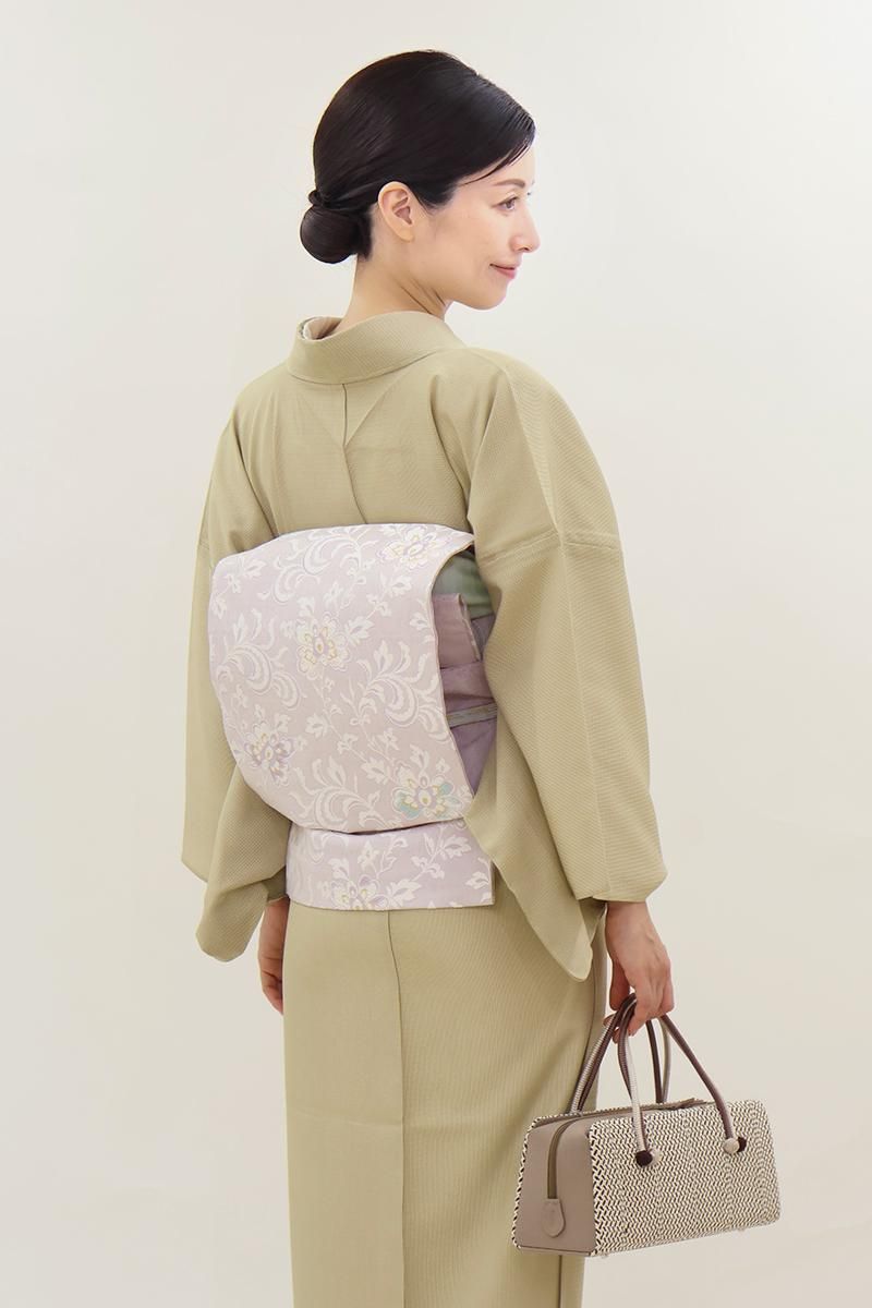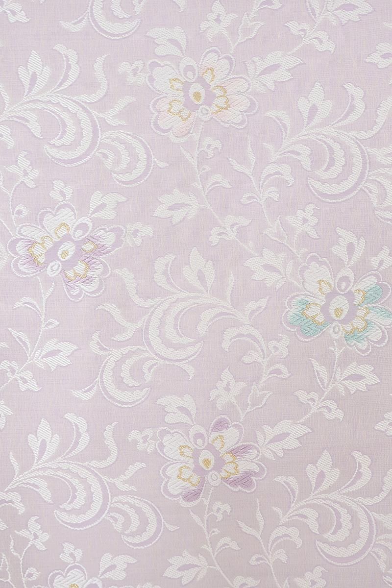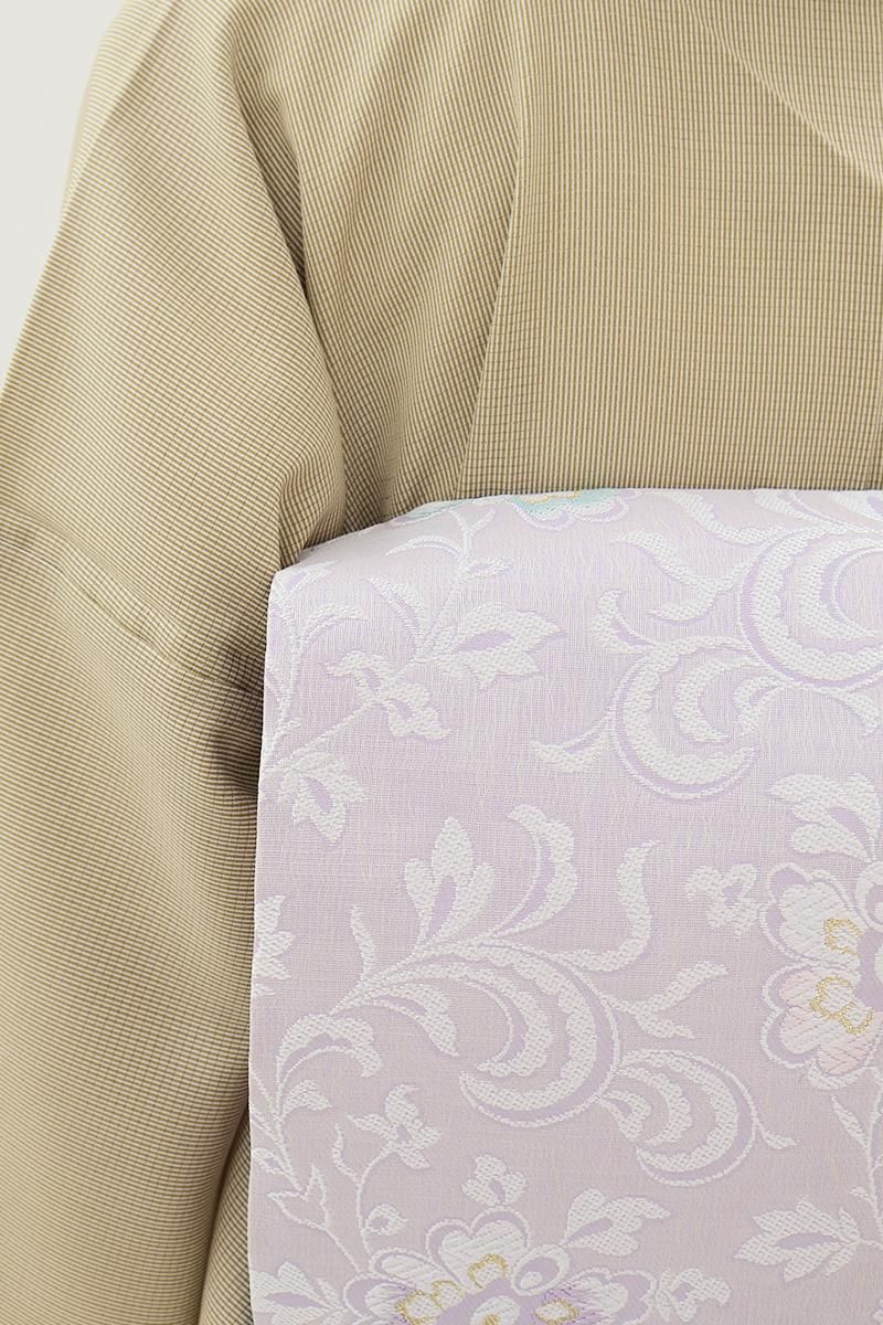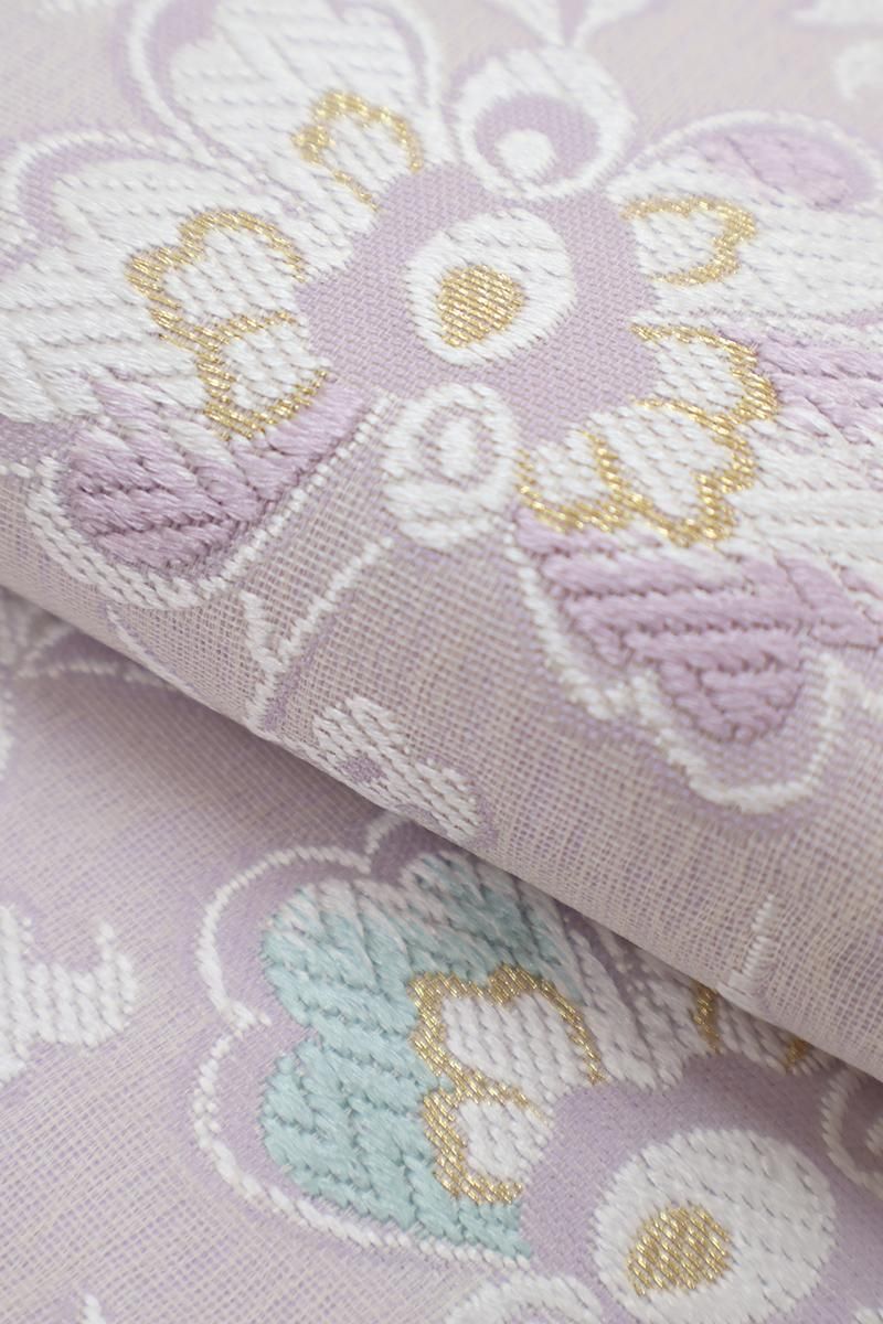 こちらは薄藤色が近いでしょうか、揺らぎのある表情の淡い紫色の地に、花唐草文を織り出したお品、白糸を基調としたモチーフに青磁色や金糸などがアクセントとなり、装いを品良く引き立ててくれることと思います。ほのかに透け感のあるさっくりとした風合いですので真冬を除いたスリーシーズンに気候に合わせてお楽しみいただけそうです。小紋や色無地などに合わせてお食事会や観劇などにいかがでしょうか。