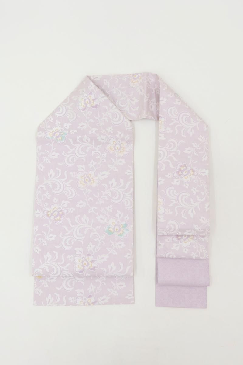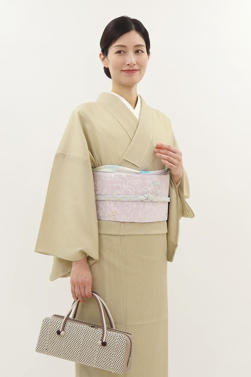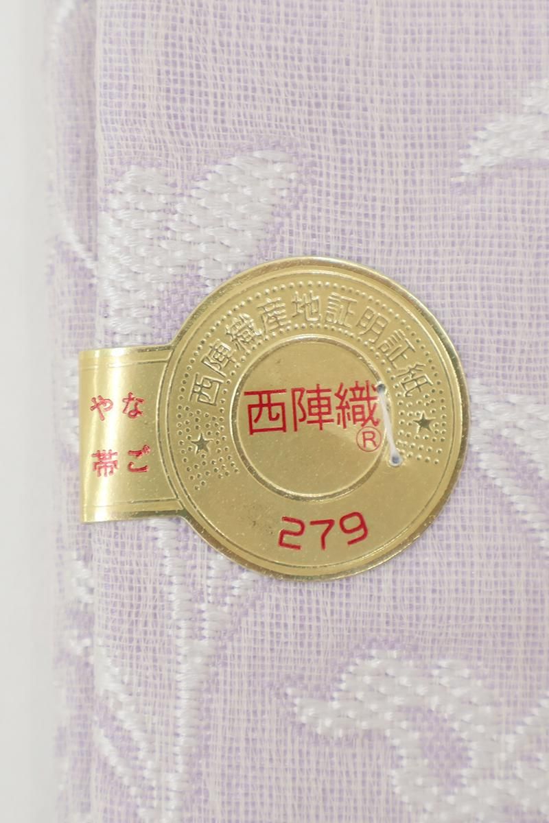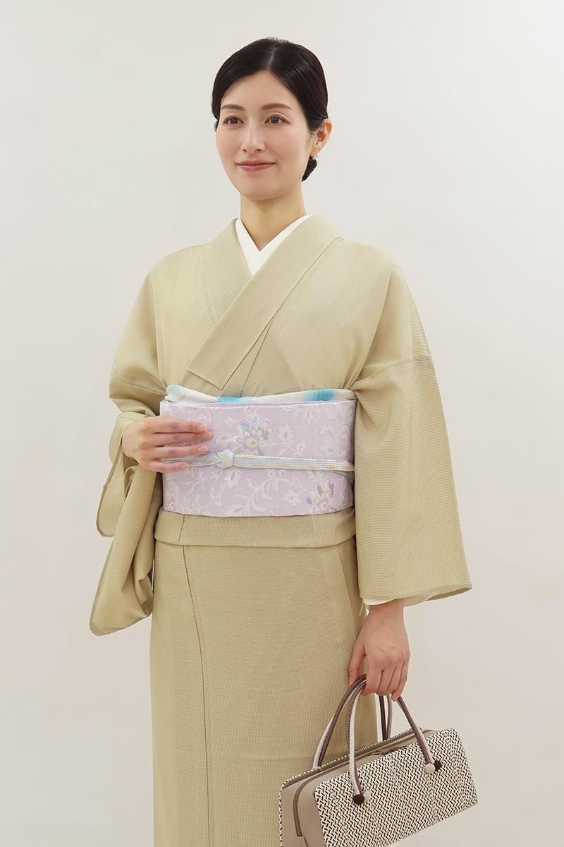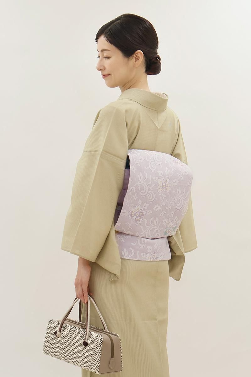 こちらは薄藤色が近いでしょうか、揺らぎのある表情の淡い紫色の地に、花唐草文を織り出したお品、白糸を基調としたモチーフに青磁色や金糸などがアクセントとなり、装いを品良く引き立ててくれることと思います。ほのかに透け感のあるさっくりとした風合いですので真冬を除いたスリーシーズンに気候に合わせてお楽しみいただけそうです。小紋や色無地などに合わせてお食事会や観劇などにいかがでしょうか。