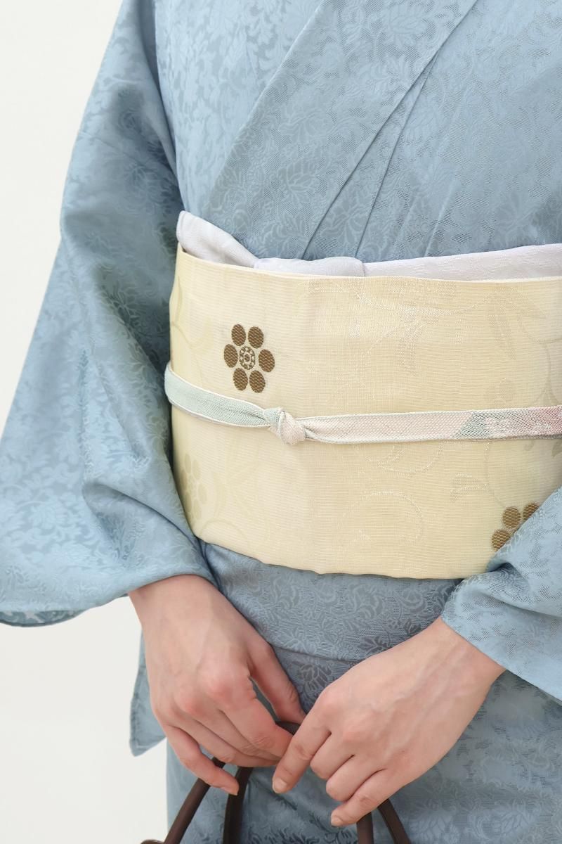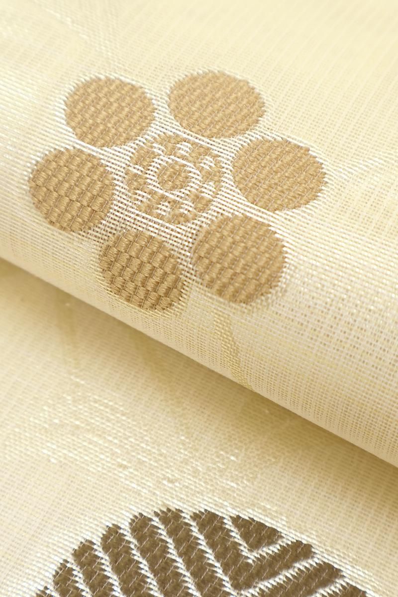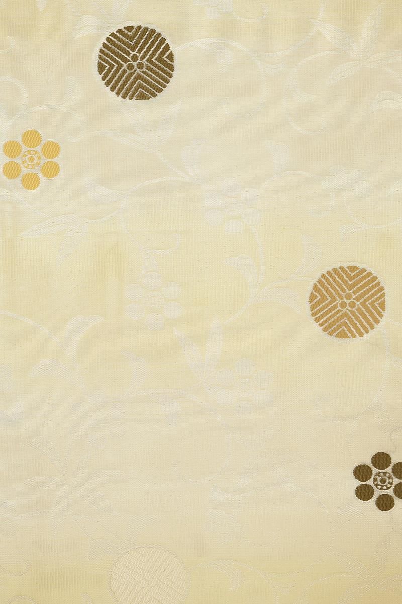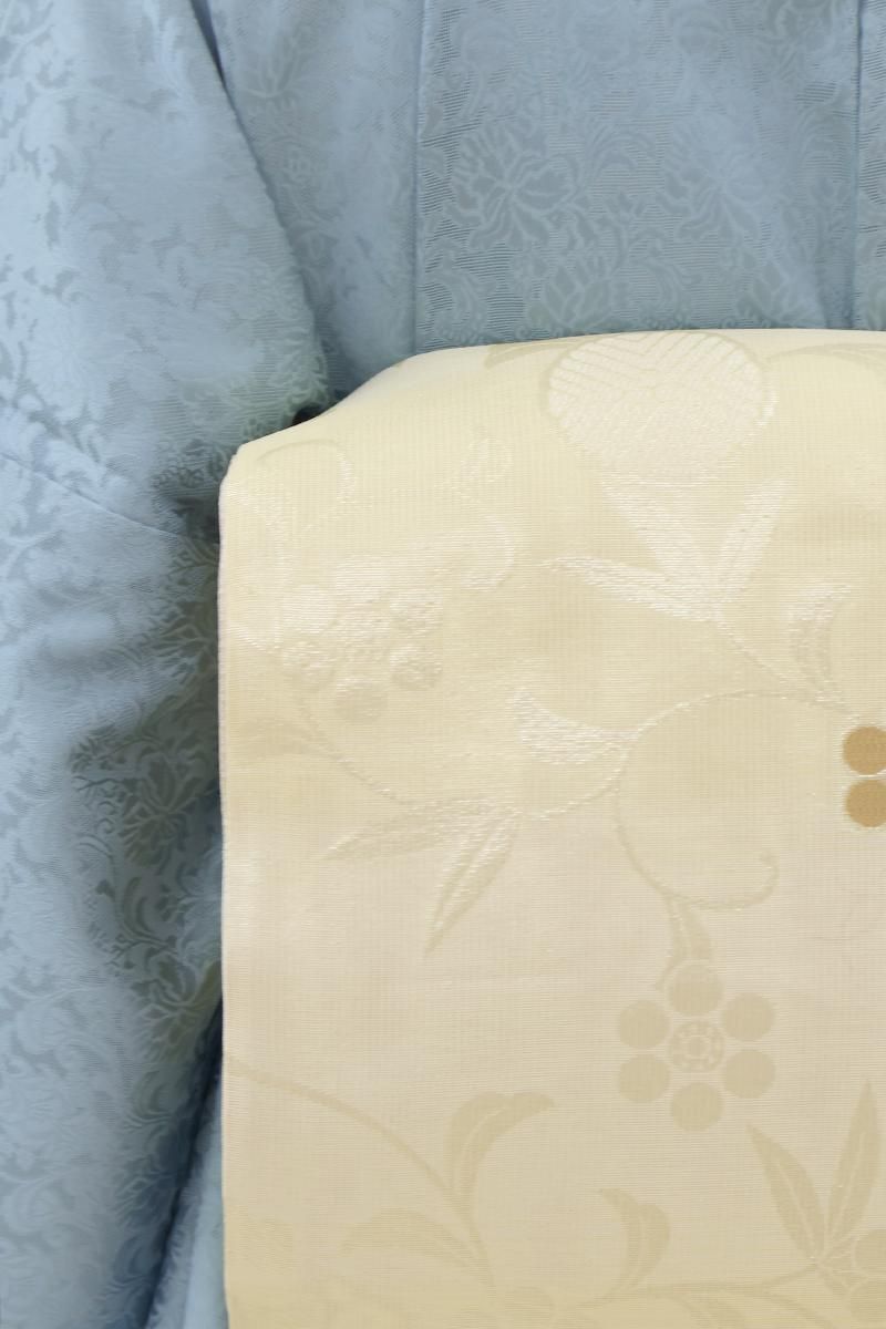 こちらはクリームイエローの濃淡の横段暈しを背に笹蔓文を織り出したお品、金を通した艶やかな地や同系の落ち着いた彩りに品格が感じられますね。透け感は控えめですので気候に合わせて長くお使いいただける一本、色無地や付け下げ、訪問着などに合わせてこれからの季節のお出かけにいかがでしょうか。