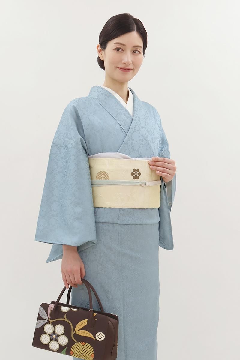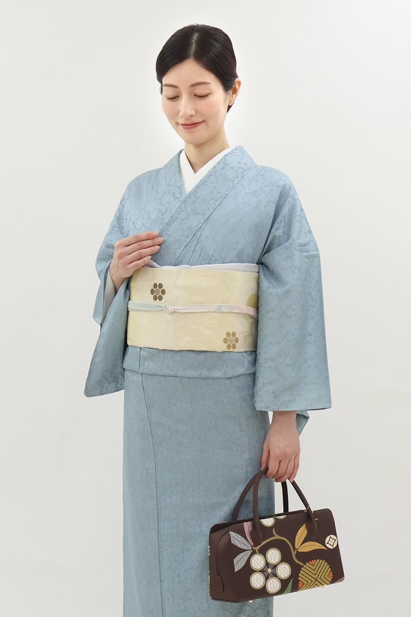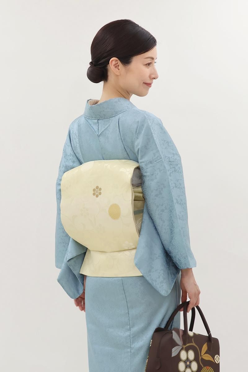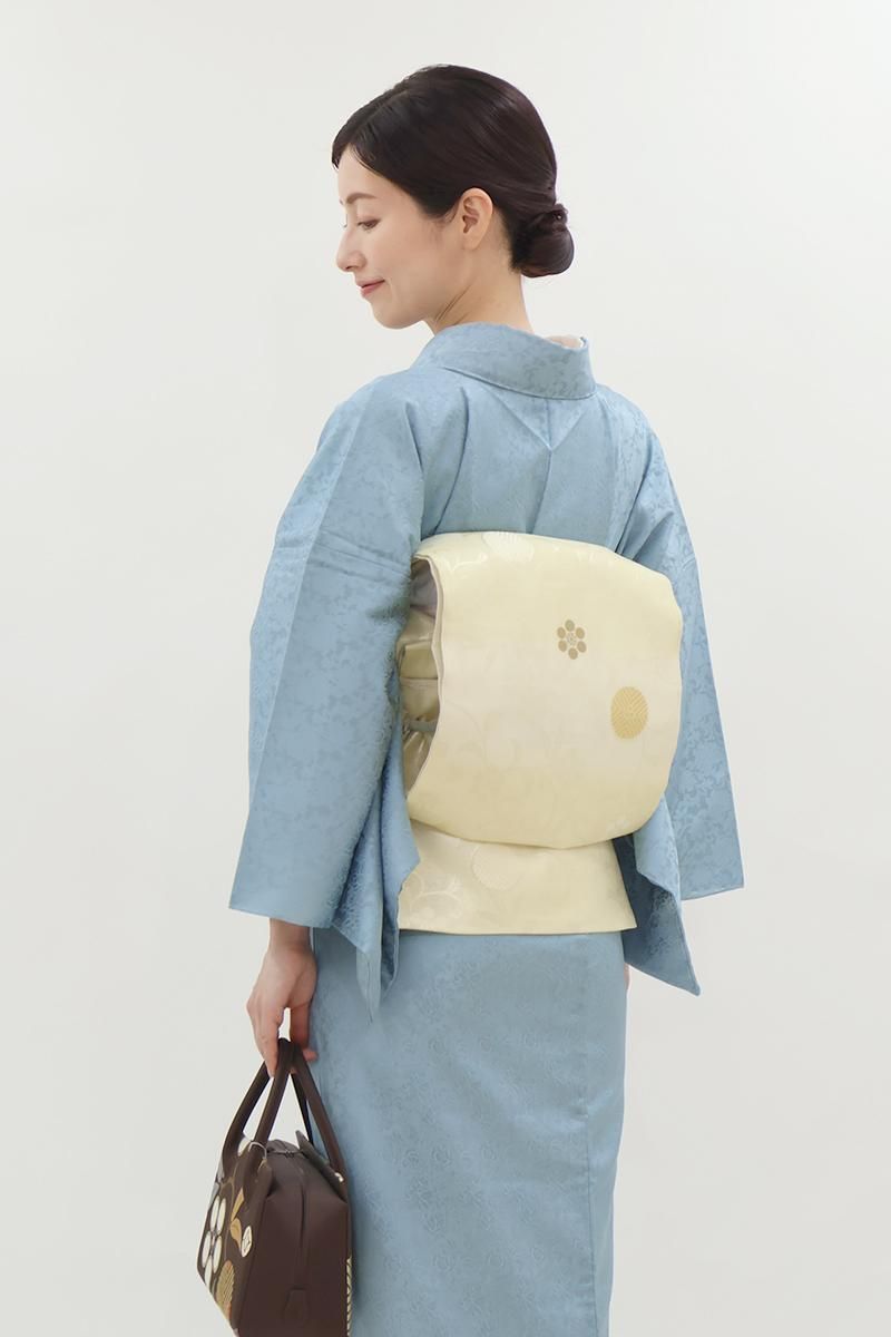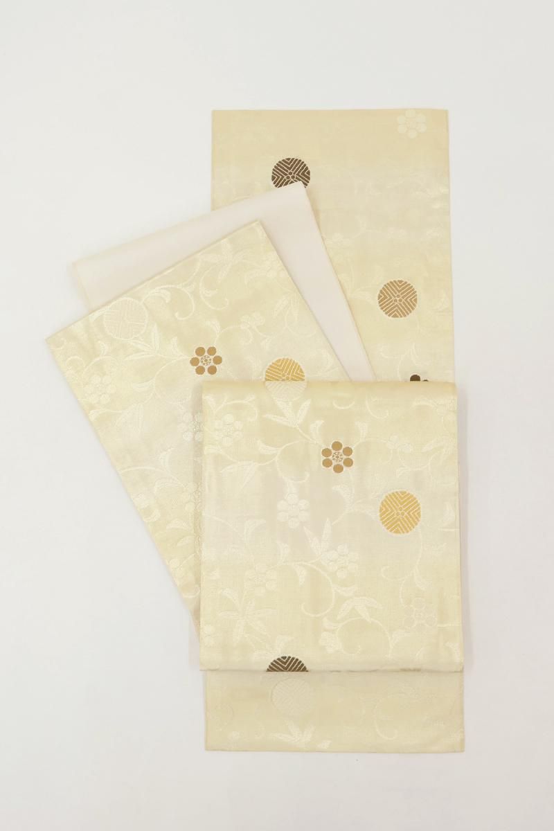 こちらはクリームイエローの濃淡の横段暈しを背に笹蔓文を織り出したお品、金を通した艶やかな地や同系の落ち着いた彩りに品格が感じられますね。透け感は控えめですので気候に合わせて長くお使いいただける一本、色無地や付け下げ、訪問着などに合わせてこれからの季節のお出かけにいかがでしょうか。