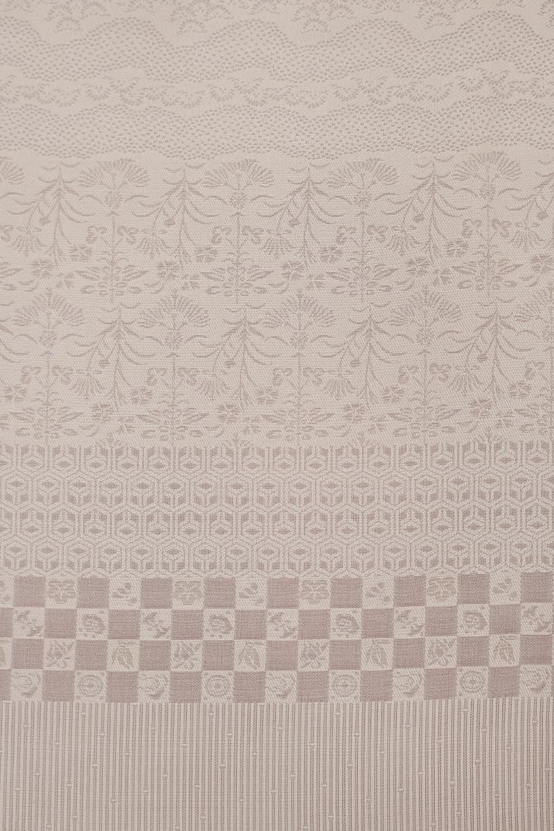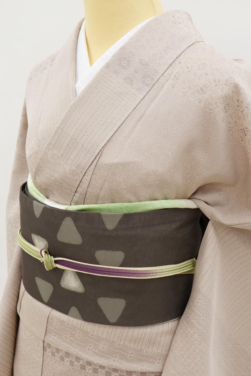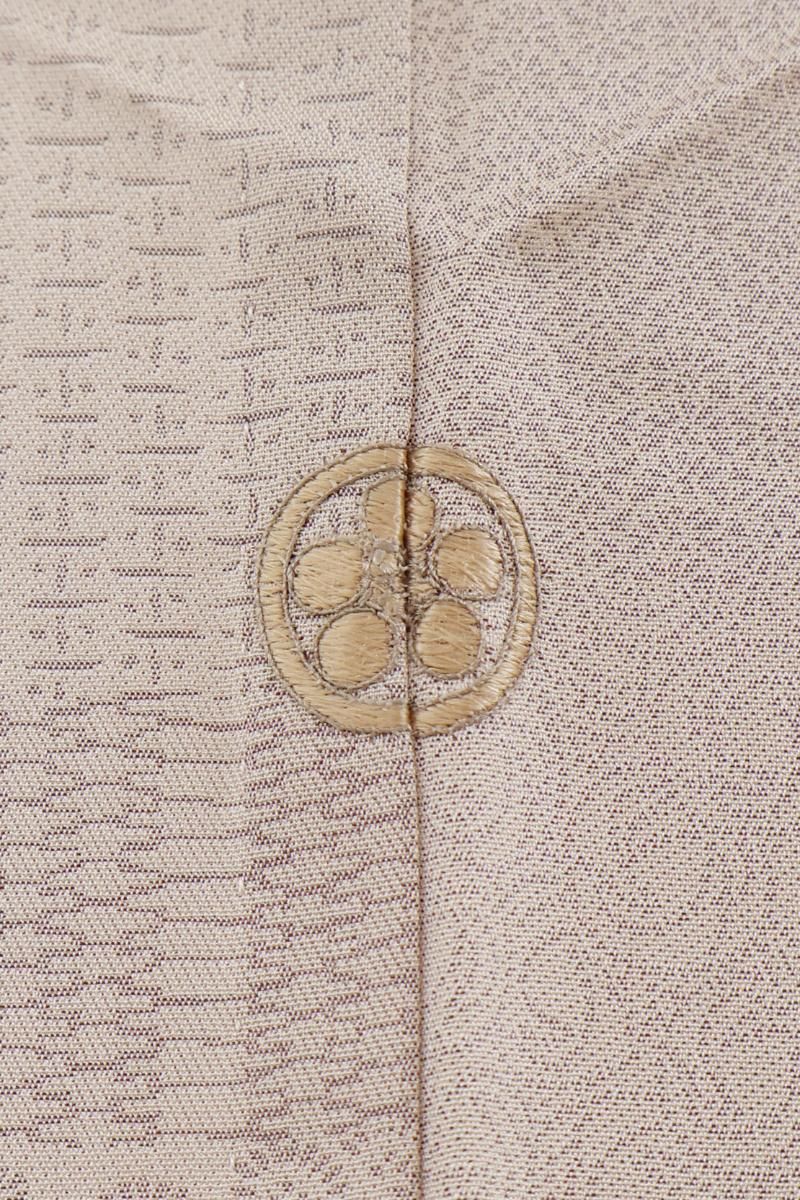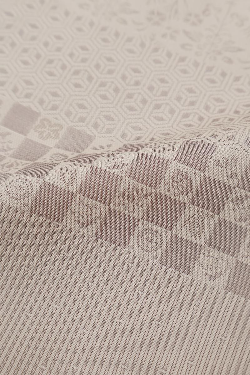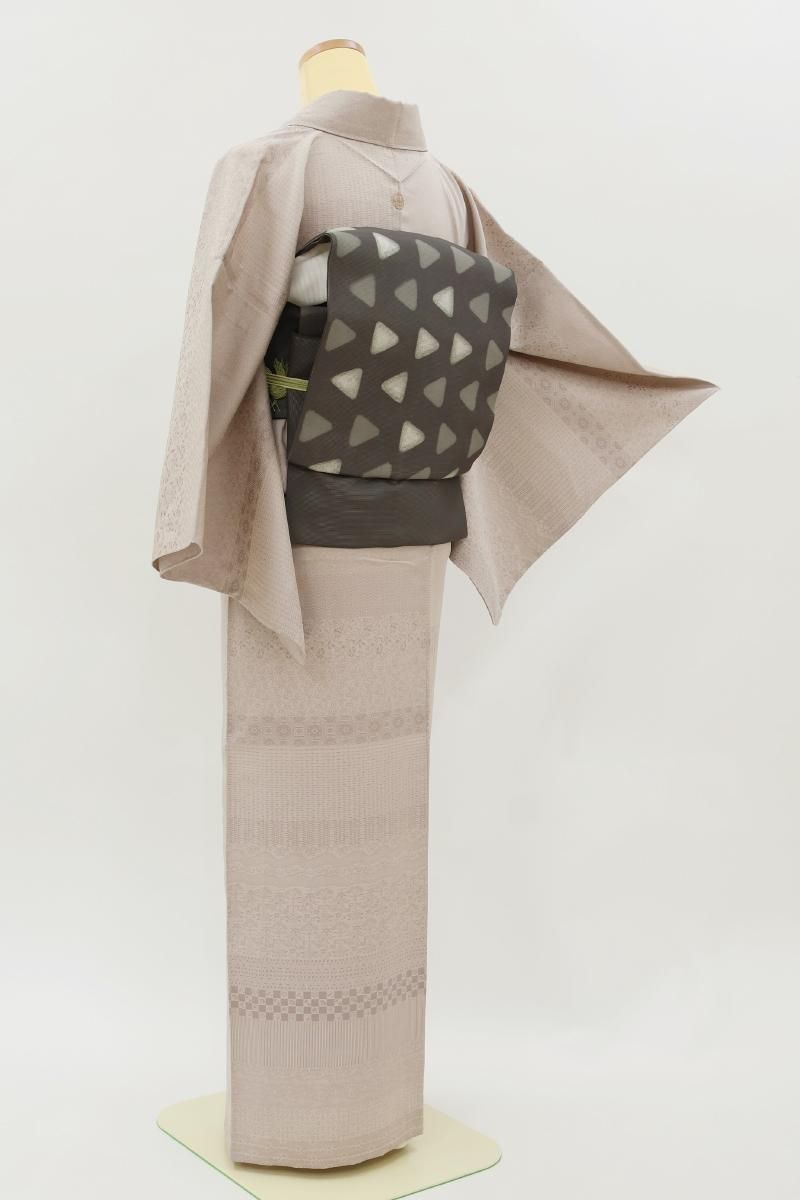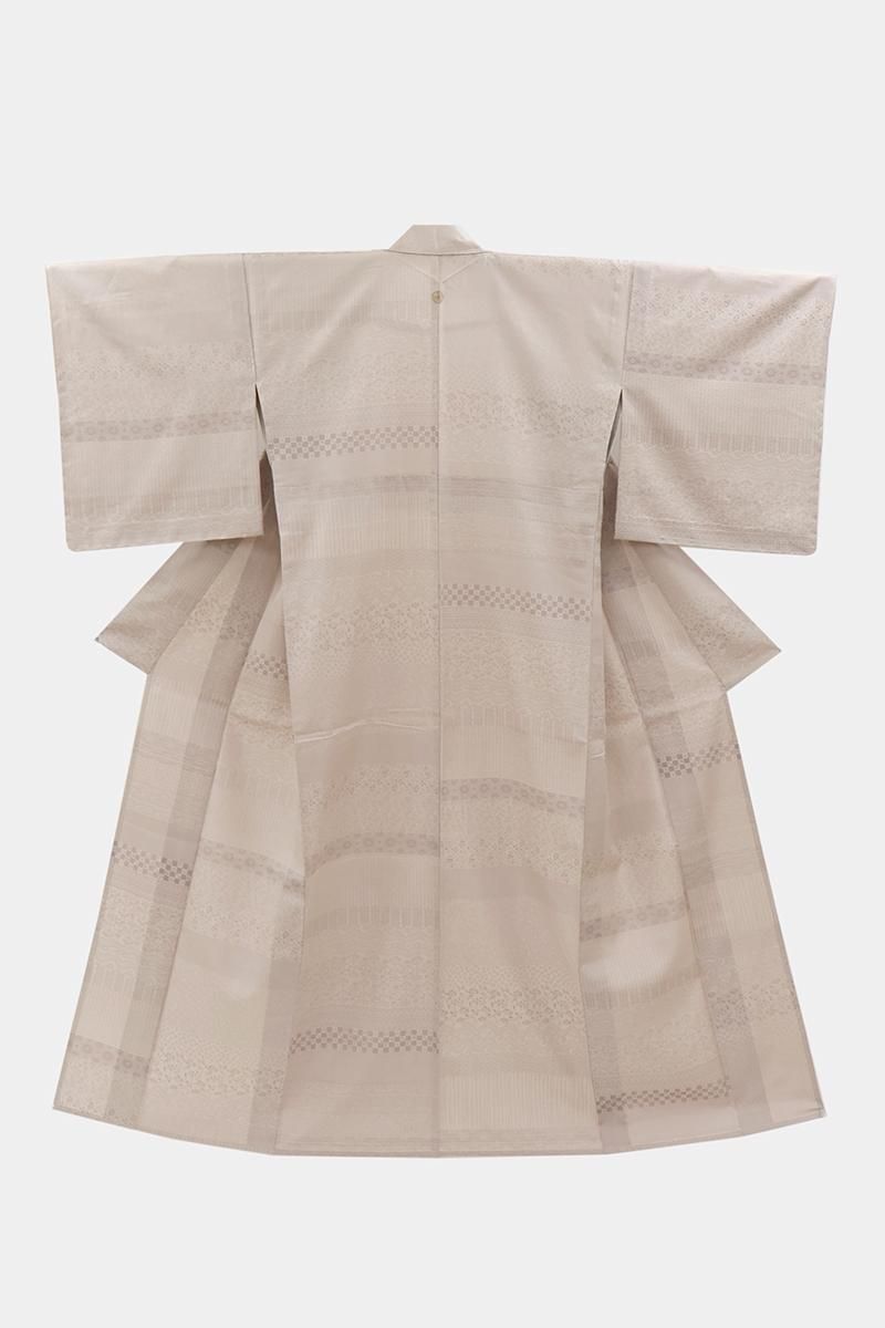 灰桜色が近いでしょうか、灰みの強いピンクベージュ系の地に、変わり段に千鳥や花唐草など様々な小紋柄を寄せた単衣の織着物です。こちらはしっとりと落ち着いたお色目がお召しになる方や年齢を選ばずお楽しみいただける一枚、程よく光沢感がありドレッシーな印象の地風に加え、繍一ッ紋が付いていますので、格高の染め帯や織名古屋帯、金糸の入らない袋帯など様々な帯を合わせてさりげない趣味性と格調を備えた装いをお楽しみいただけることと思います。この機会にいかがでしょうか。