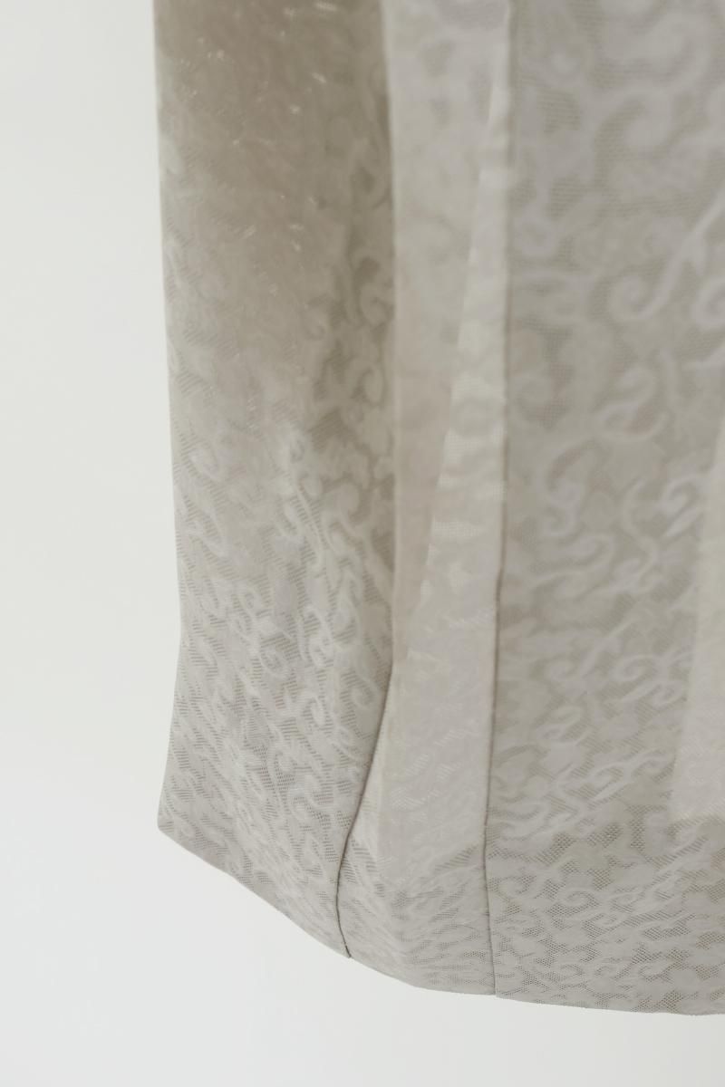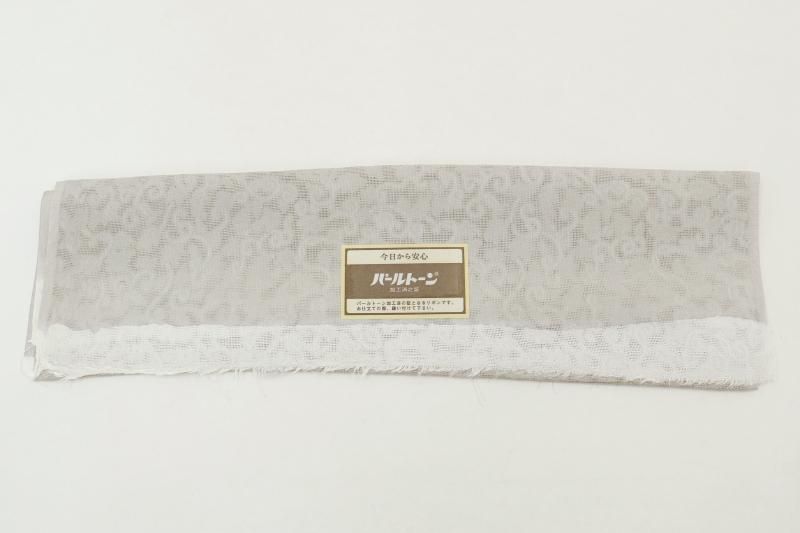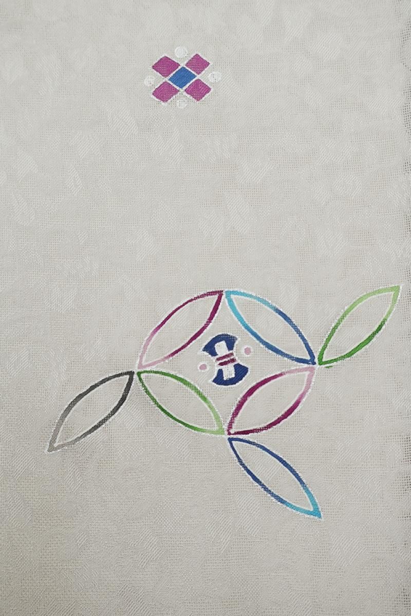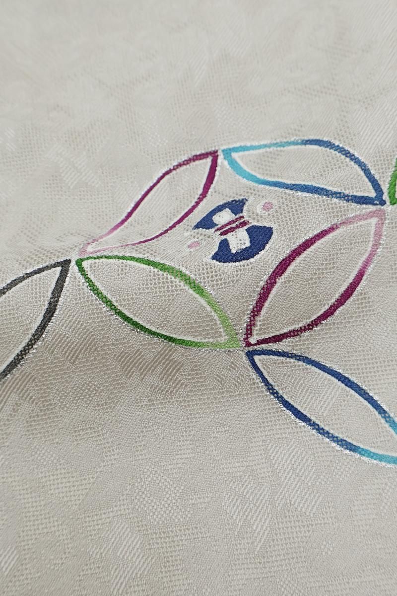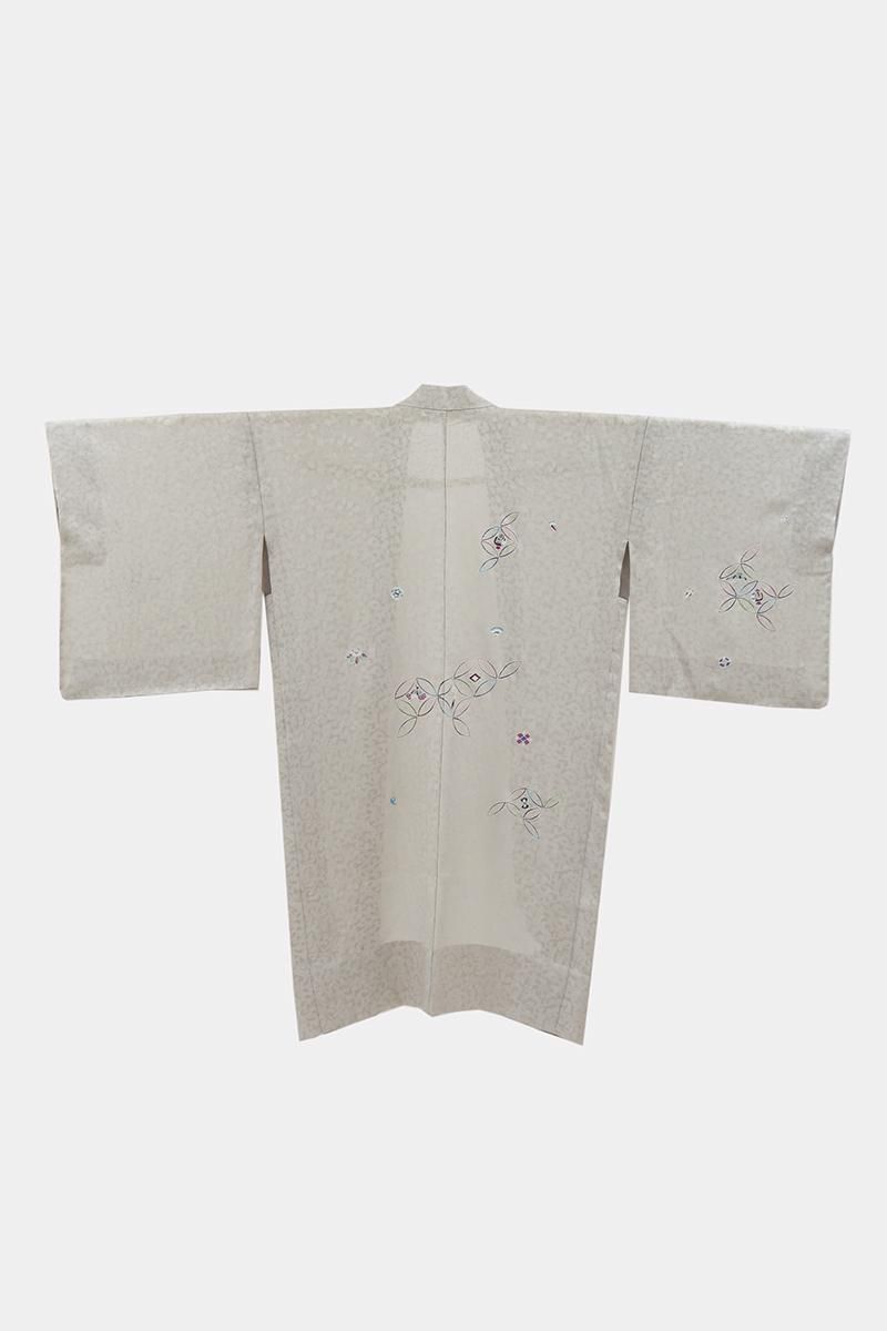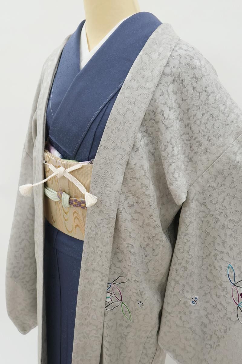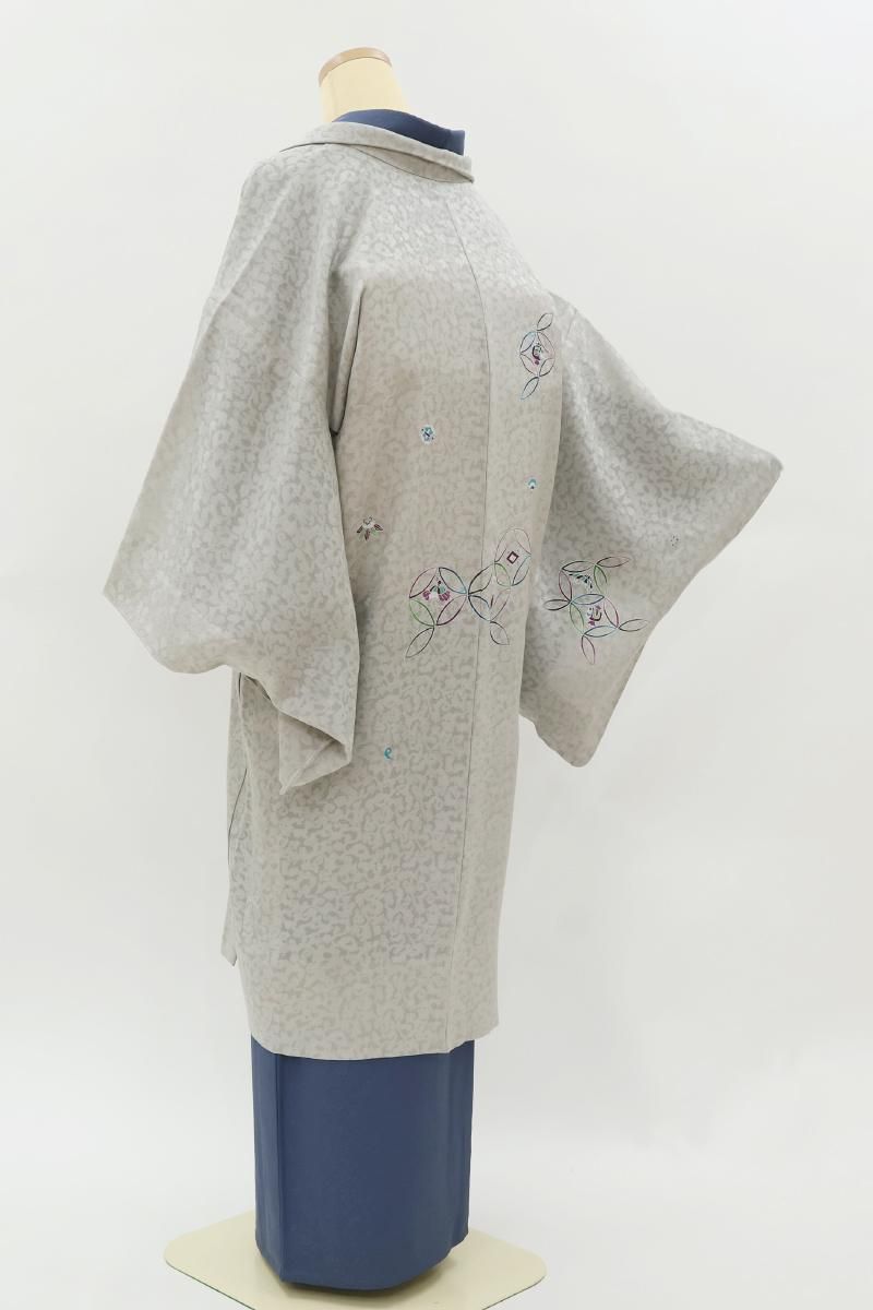 灰色が近いでしょうか、薄グレーの紋紗地に、モダンな色遣いで七宝に宝尽くし文を描いた羽織です。光の加減でふんわりと浮かび上がる葡萄唐草の地紋が優美な表情を見せるお品、シックで落ち着いたお色目は着姿に品良い華やぎを添えて引き立ててくれそうですね。大切なお着物を護るためにも一枚羽織っていただくと何かと安心な薄物のコート、この機会にいかがでしょうか。