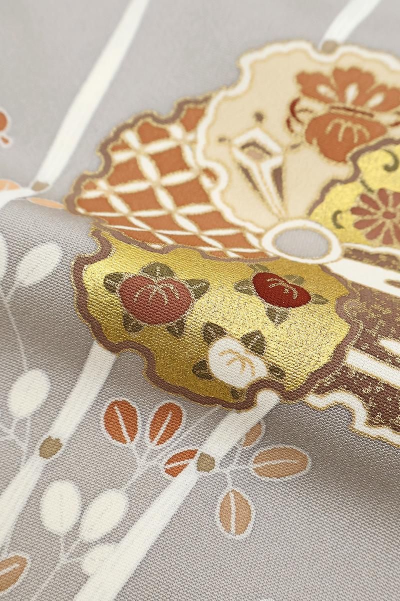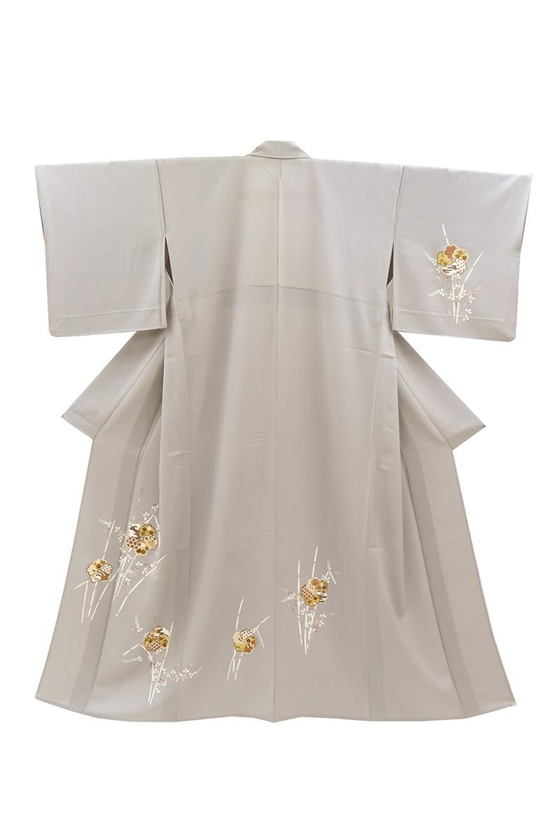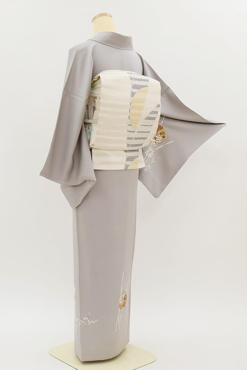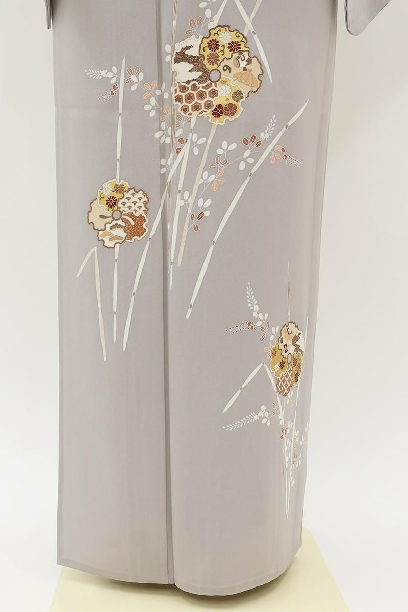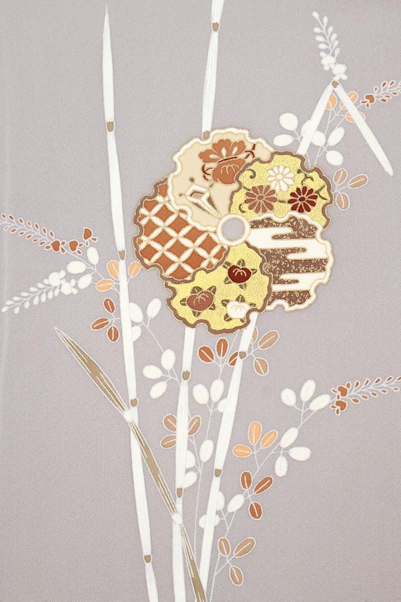 桜鼠色が近いでしょうか、わずかに紫みを帯びたグレーの地に、木賊や萩を背景に様々な文様を詰めた雪輪で花のかたちを象った単衣の付下げです。程よくシックなお色目に優美な柄ゆきがやさしく調和し、静かな大人の気品を感じさせるお品、金彩の煌めきが気品を添え、装いをしっとりと引き立ててくれることと思います。お茶席などの改まった場面の装いにいかがでしょうか。