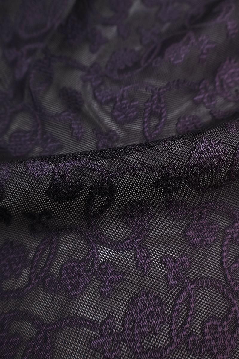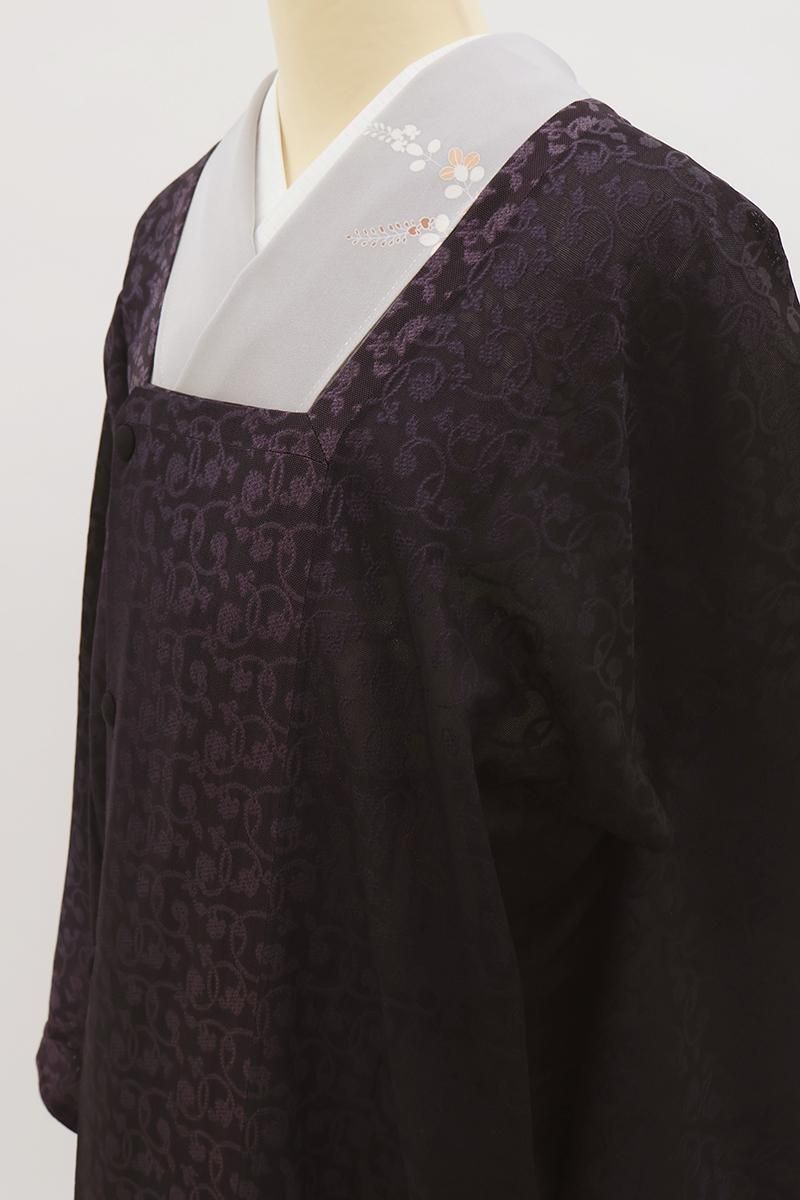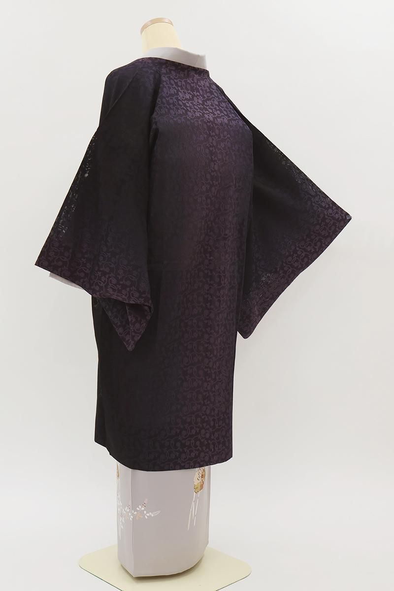 黒紫色が近いでしょうか、黒みを帯びたごく深いお色目の紋紗地に、紫色で花唐草文を織り出した道行コートです。しゃりっとした地風にほんのりと向こうを透かす濃色が大人の気品を感じさせるお品、淡色のお着物に重ねてお召しいただくと一層エレガントな表情をお楽しみいただけることと思います。防寒が不要の夏期でもやはり、塵除けや雨除けとして一枚コートを羽織っていただくと様々な汚れからお着物や帯が護られます。ぜひこの機会にご用意くださいませ。