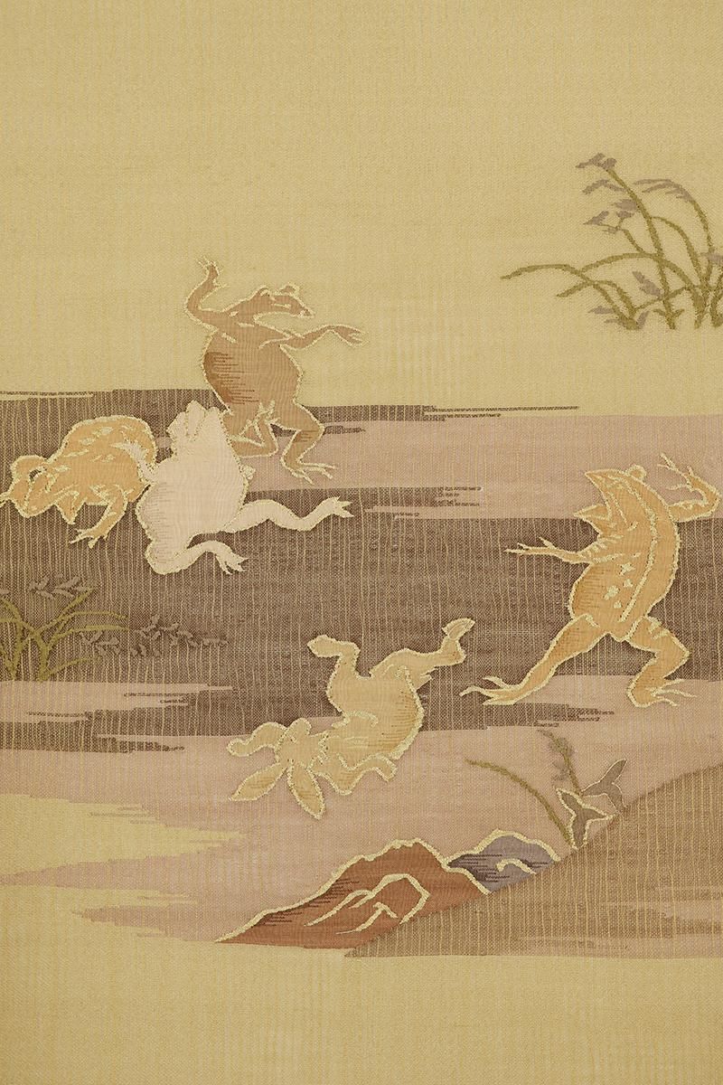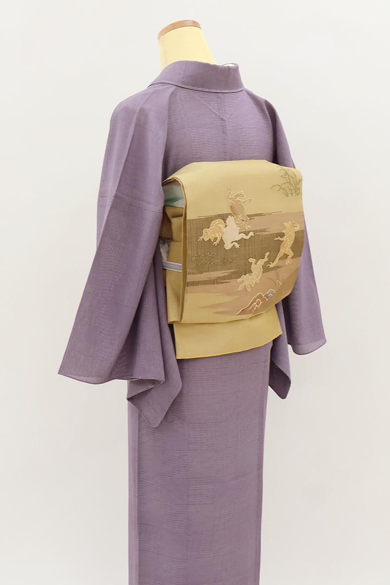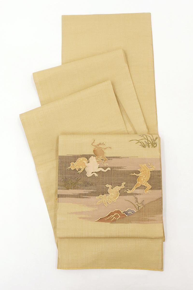 やや色を薄めた深支子色が近いでしょうか、金通しの灰みのイエローベージュの地に、鳥獣戯画図を織り出した夏の袋帯です。こちらはしゃりっとした地風の中間色に、兎や蛙の楽しげな姿が生き生きと表現されたお品、金糸のきらめきがさりげない気品を添え、ユーモア溢れる大人の装いをお楽しみいただけることと思います。格高の小紋や色無地、訪問着などに合わせて洒落味ゆたかな装いをいかがでしょうか。