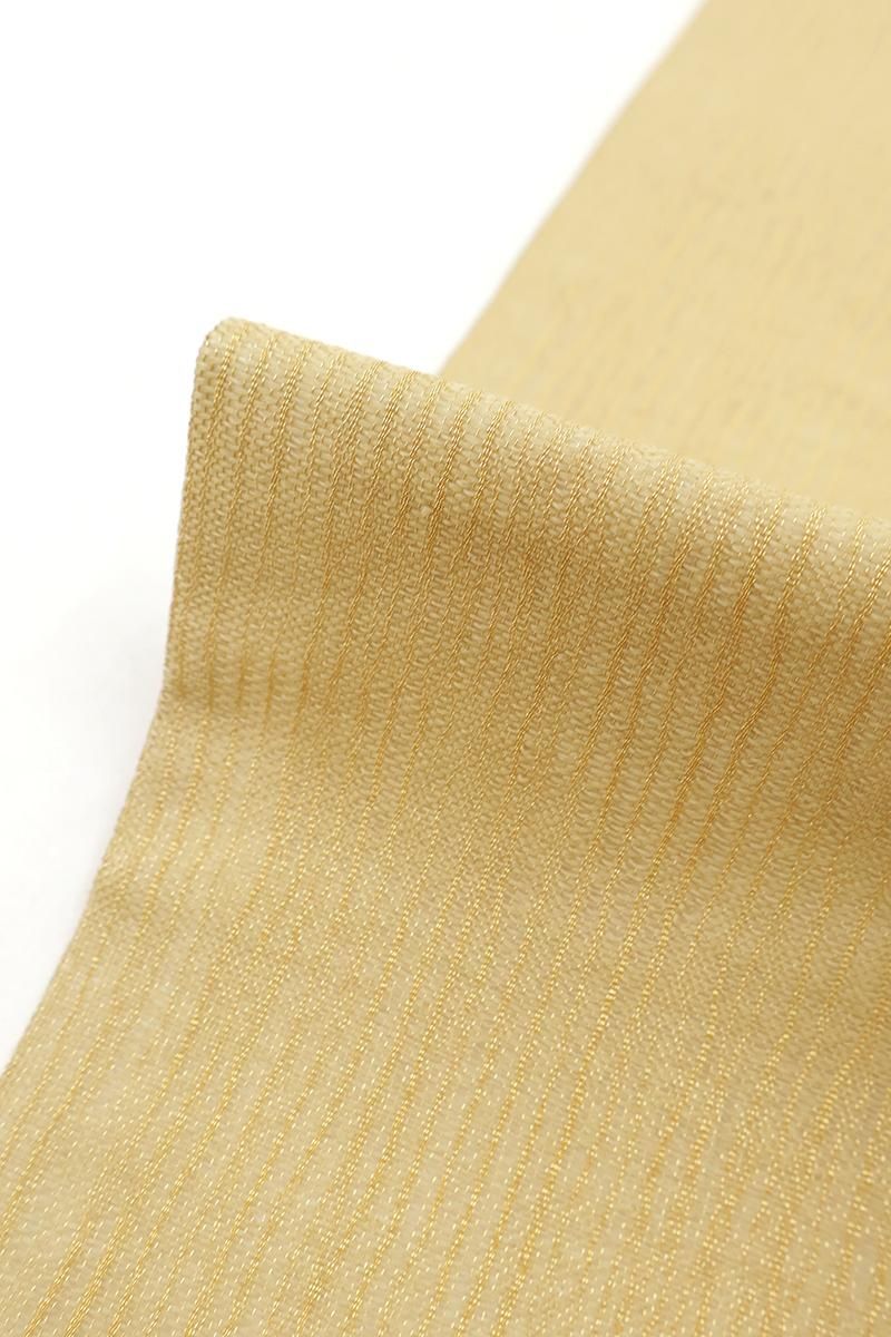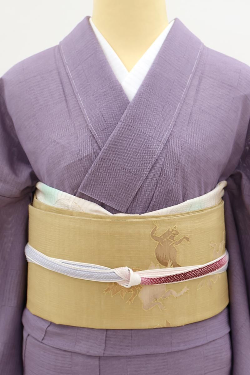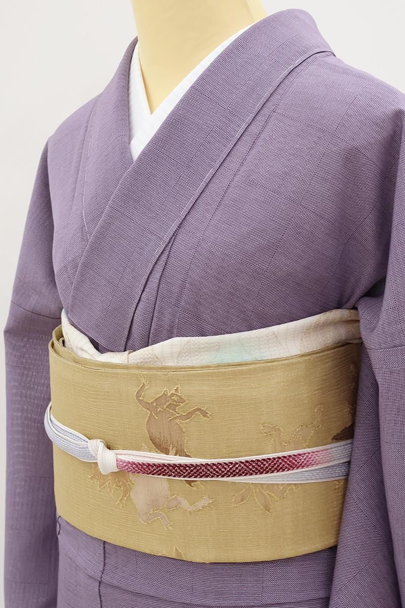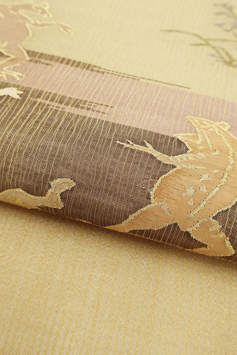 やや色を薄めた深支子色が近いでしょうか、金通しの灰みのイエローベージュの地に、鳥獣戯画図を織り出した夏の袋帯です。こちらはしゃりっとした地風の中間色に、兎や蛙の楽しげな姿が生き生きと表現されたお品、金糸のきらめきがさりげない気品を添え、ユーモア溢れる大人の装いをお楽しみいただけることと思います。格高の小紋や色無地、訪問着などに合わせて洒落味ゆたかな装いをいかがでしょうか。